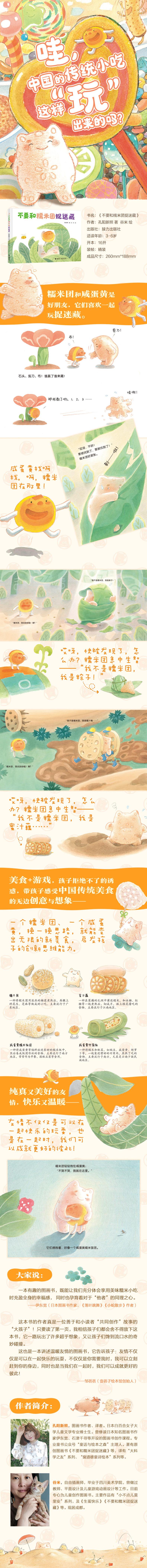 ■美食+游戏,孩子拒绝不了的诱惑 将传统美食和有趣的游戏巧妙结合,以孩子们都热爱的捉迷藏游戏为主线,融合进找一找游戏、换装变身游戏,有趣的游戏内容贯穿全书,可以一直吸引孩子往下阅读、反复阅读。 ■ 一种食材,多种玩法,体验传统美食文化的想象与创新思维 糯米团裹上叶子可以做成粽子,塞进藕洞里可以做成蜜汁藕;用糯米粉做成的糯米团,撒上黄豆粉可以做成驴打滚,糖浆里滚一滚,撒上芝麻花生碎,可以变成糖不甩……传统小吃之所以丰富多彩、变化多样,不是因为加入了各种新奇的食材,而是巧妙地将常见的食材进行各种不同的排列组合而形成的。这既是传统饮食文化的智慧,也是解决各种其他问题的一种很好基本又有效的思维方式。 ■纯真又美好的友情,快乐而温暖 咸蛋黄就像是个单纯的小弟弟/妹妹,而糯米团就像是个聪明又爱照顾人的小哥哥/姐姐,很后糯米团安慰咸蛋黄,一起入睡,变成了咸蛋黄糯米竹筒饭的场景温馨又美好。友情不仅仅是可以在一起快乐的玩耍,不仅仅是你需要我时,我可以立刻赶到你的身边,同时也是当我们在一起时,我们可以成就更好的彼此! ■软萌可爱、有趣鲜活的食物形象,热闹有趣的食物王国,充满了趣味性和色香味,满足孩子们的“吃货”心。