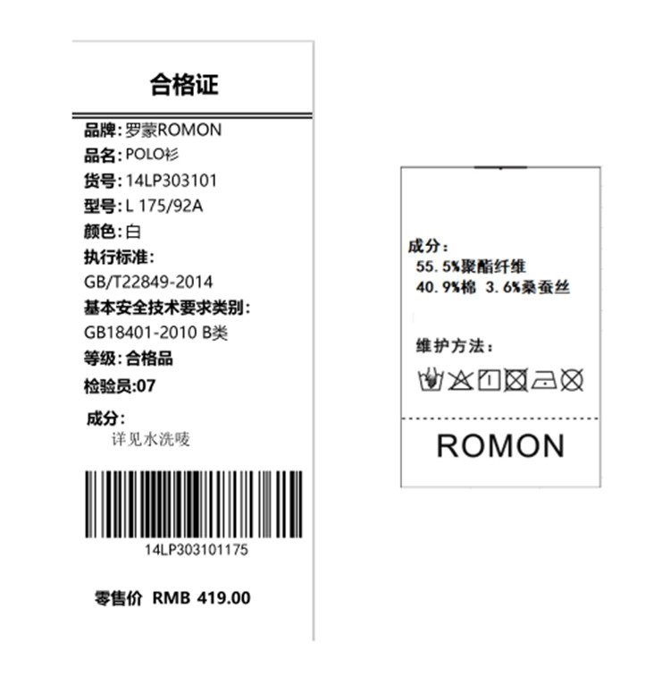 面料:55.5%聚酯纤维 40.9%棉 3.6%桑蚕丝