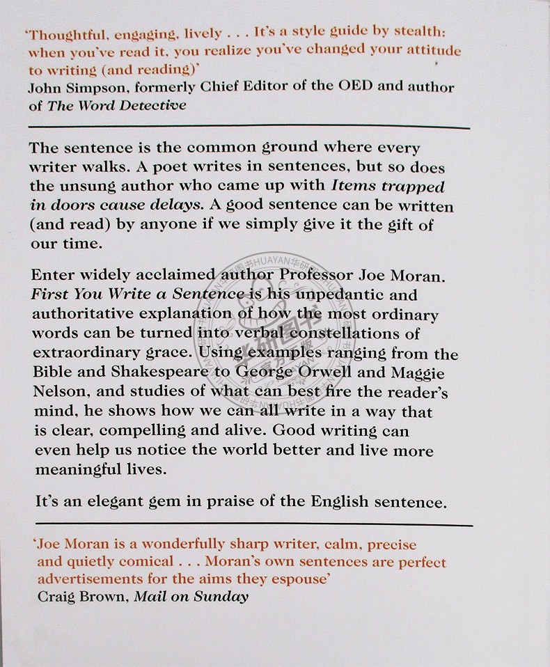 'What a lovely thing this is: a book that delights in the sheer textural joy of good sentences ... Any writer should read it' Bee Wilson 'Thoughtful, engaging, and lively ... when you've read it, you realise you've changed your attitude to writing (and reading)' John Simpson, formerly Chief Editor of the OED and author of The Word Detective The sentence is the common ground where every writer walks. A poet writes in sentences, but so does the unsung author who came up with Items trapped in doors cause delays. A good sentence can be written (and read) by anyone if we simply give it the gift of our time, and it is as close as most of us will get to making something truly beautiful. Enter acclaimed author Professor Joe Moran. Using minimal technical terms, First You Write a Sentence is his unpedantic but authoritative explanation of how the most ordinary words can be turned into verbal constellations of extraordinary grace. Using sources ranging from the Bible and Shakespeare to George Orwell and Maggie Nelson, and scientific studies of what can best fire the reader's mind, he shows how we can all write in a way that is clear, compelling and alive. Whether dealing with finding the ideal word, building a sentence or constructing a paragraph, First You Write a Sentence informs by light example: much richer than a style guide, it can be read not just for instruction but for pleasure and delight. And along the way it shows how good writing can help us notice the world, make ourselves known to others and live more meaningful lives. It's an elegant gem in praise of the English sentence. 'Moran is a past master at producing fine, accessible non-fiction' Helen Davies, Sunday Times 'Joe Moran has a genius for turning the prosaic poetic' Peter Hennessy