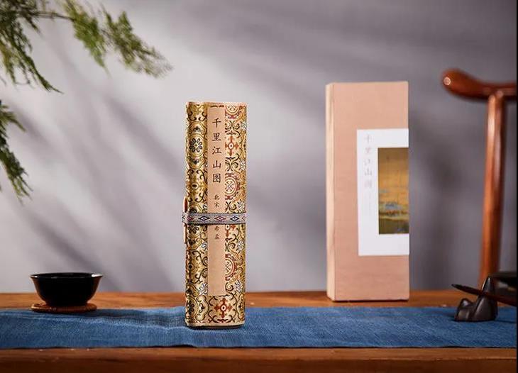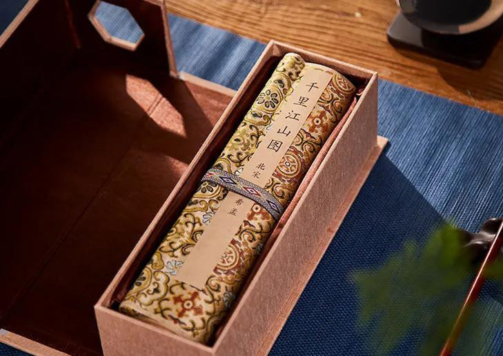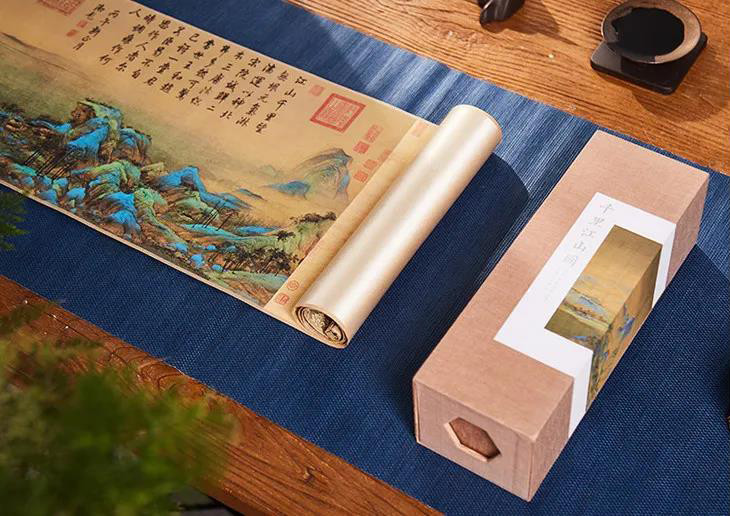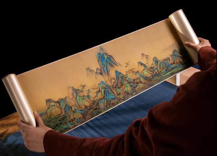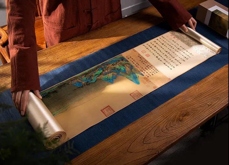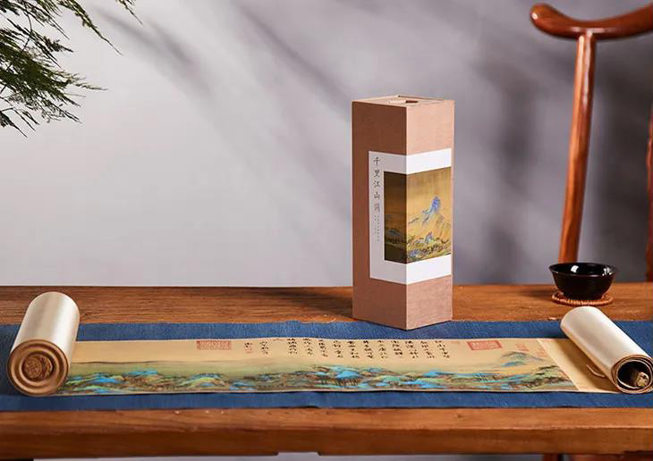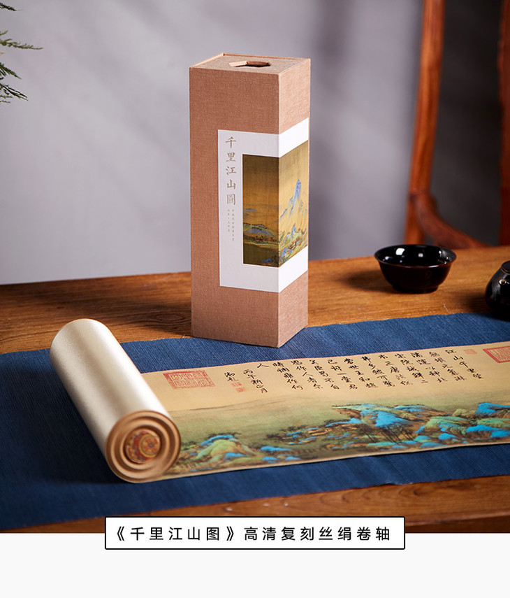 为此,故宫文创研发交流中心直属的研发机构——紫禁文创,在紫禁城建成600周年之际,把《千里江山图》100%复刻还原出来,做出眼前这套《千里江山图》高清复刻版卷轴。