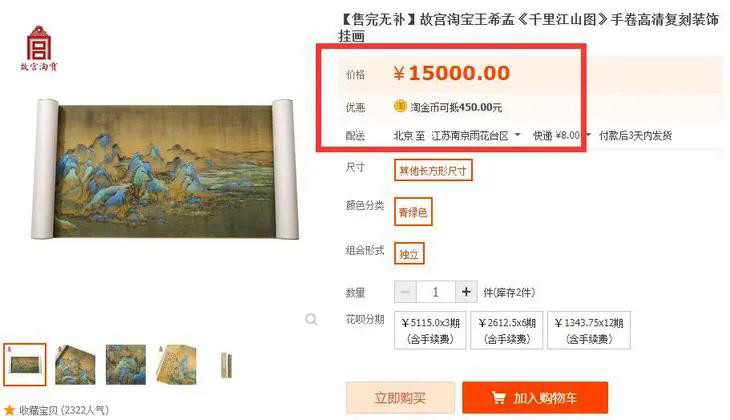 几年前,故宫限量发行了一批《千里江山图》复刻装饰画,售价1000余元,如今已经涨价到15000元!古玩市场的价格更是翻了10倍以上!
