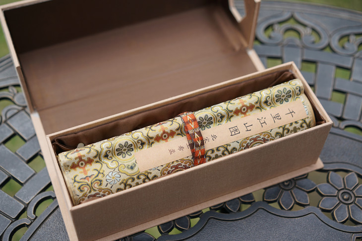 外包装上,使用了高档宋锦锦盒,质感坚实,既可以防虫,又可以很好地保护画作。