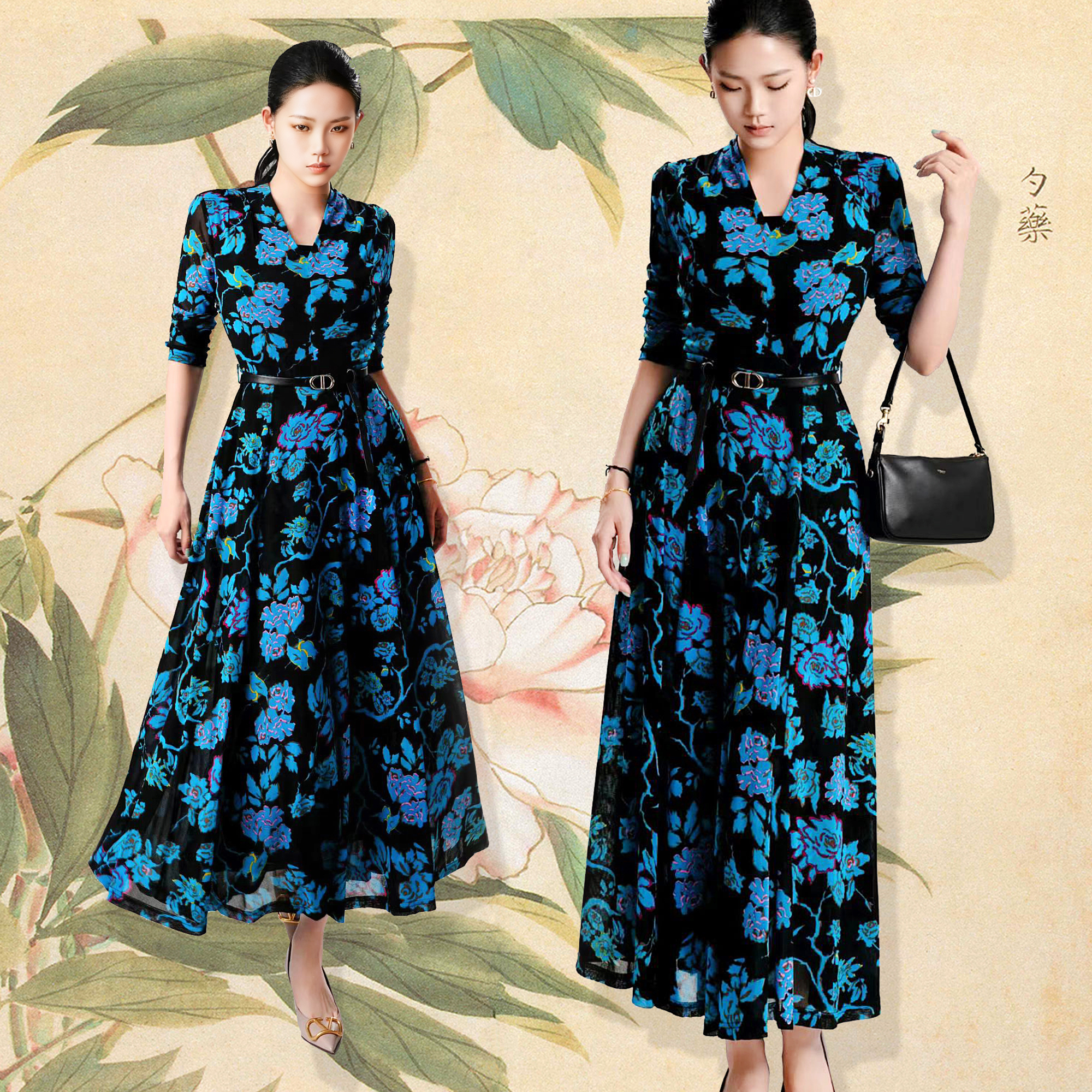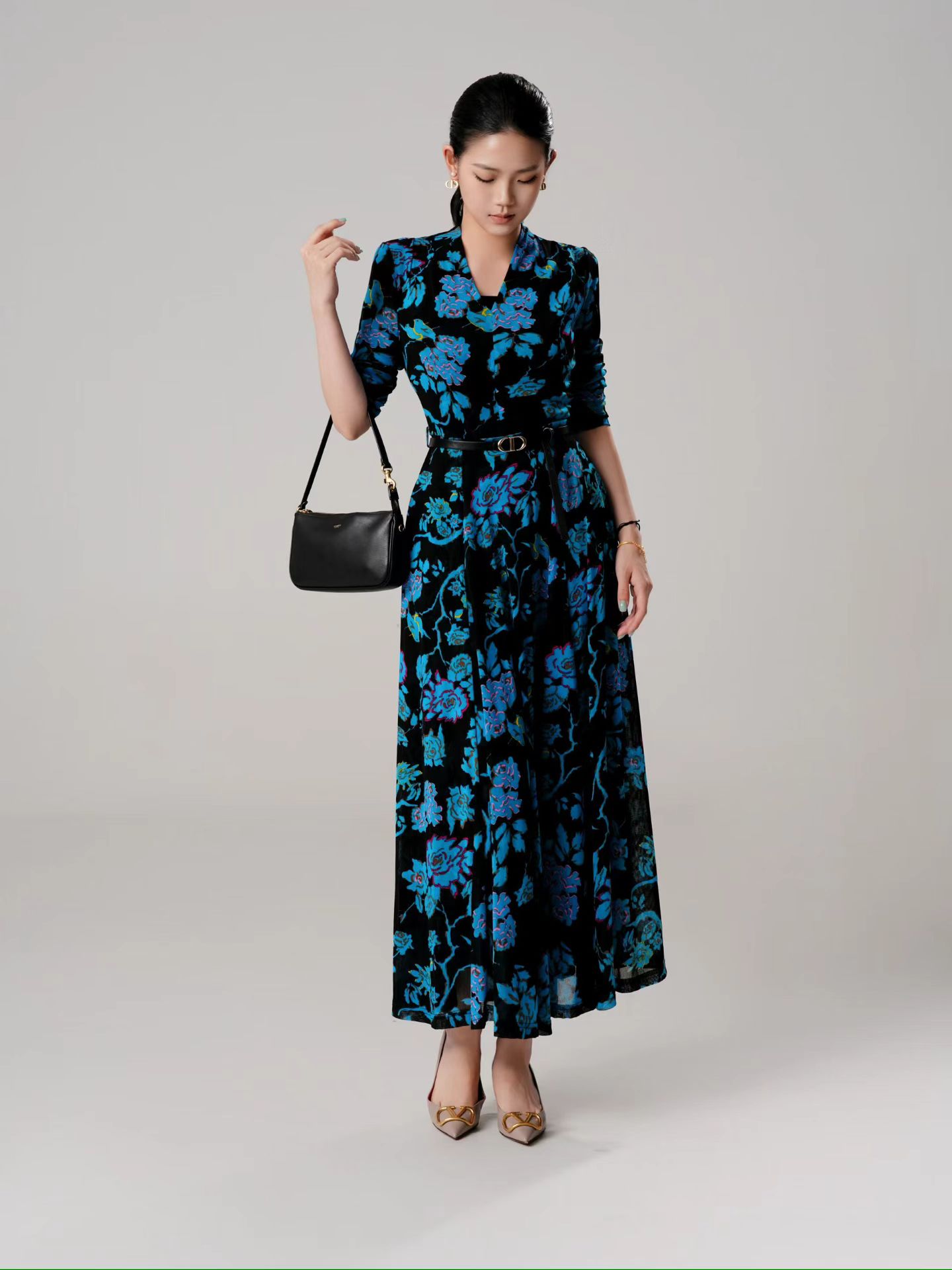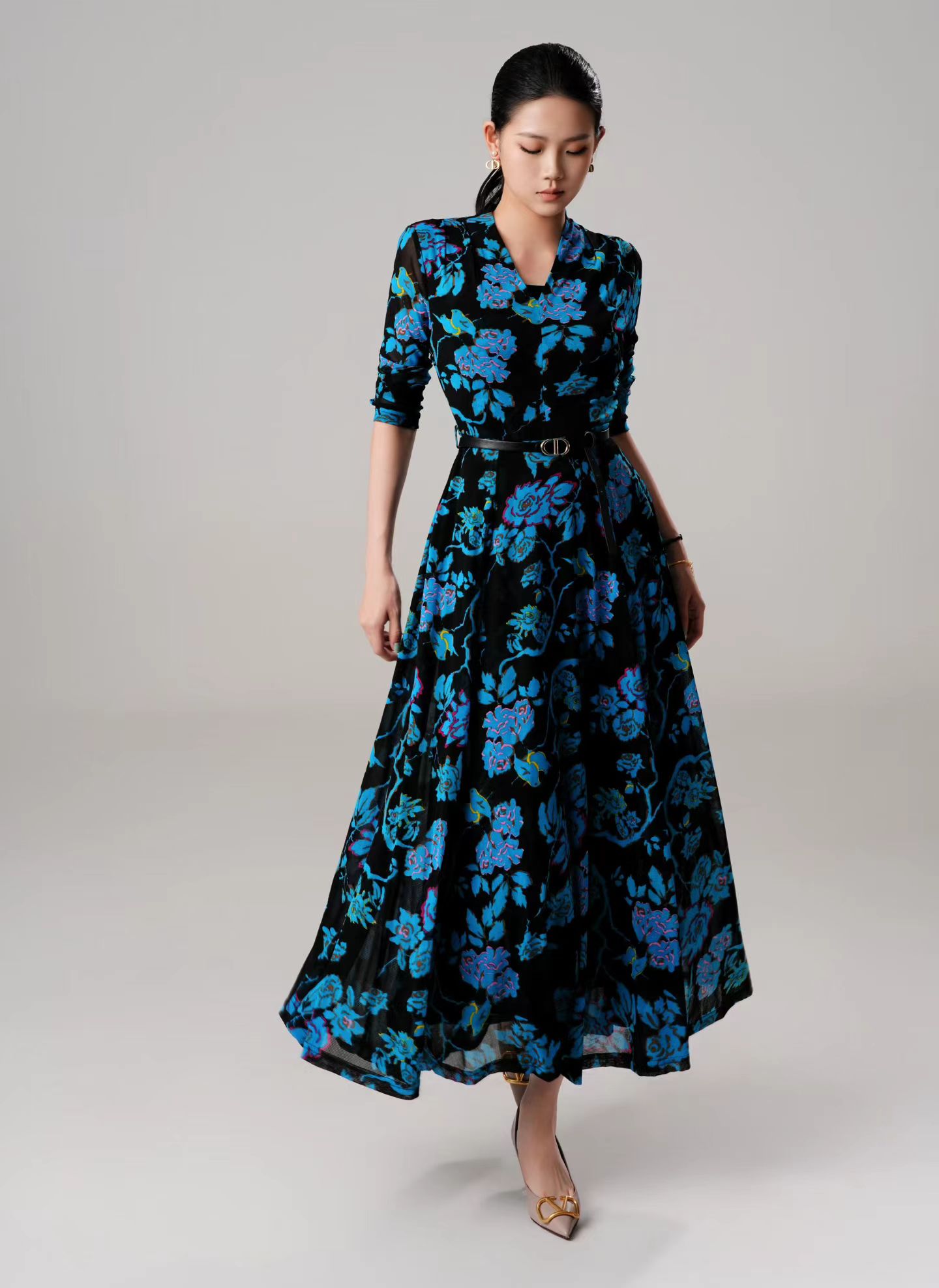 SZ3S78_监德色_连衣裙_春夏_V领七分袖腰带收腰A字大摆长款垂感雪纺_高级女装_BERNIEELEN 伯妮斯茵