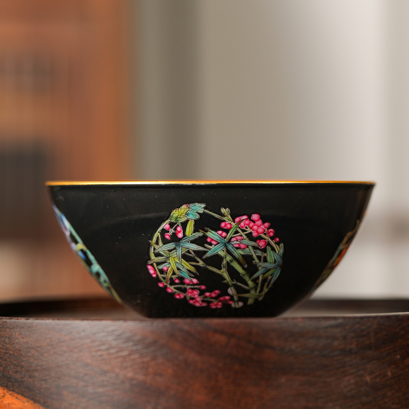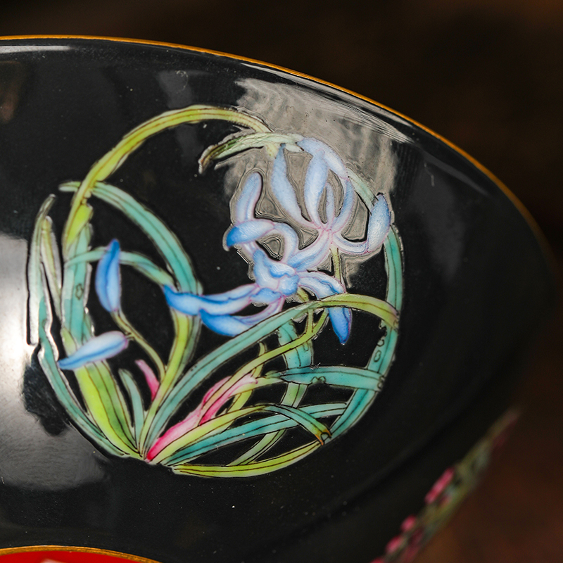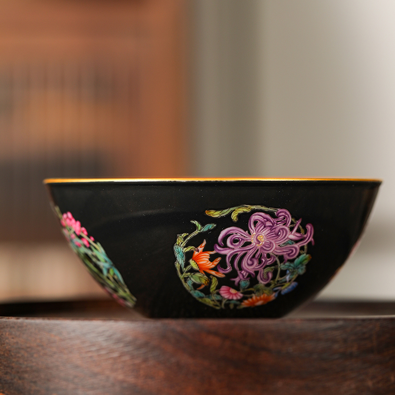 溢珍堂黑地梅兰竹菊卧足杯