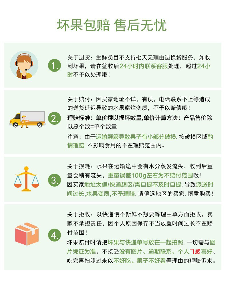 水果属于生鲜易腐产品,不耐运输、保存,故不支持7天无理由退换。请签收后24小时内请开箱检查,如有坏果,请将坏果与快递面单放一起拍照,以便及时给您处理售后理赔,售后以图片为凭证,不接受已经扔掉、超时、不合口味等理赔要求。