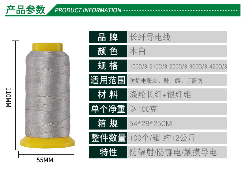 长纤金属导电缝纫线纱线120d/3 150d/3 250d/3 300d/4防静电线