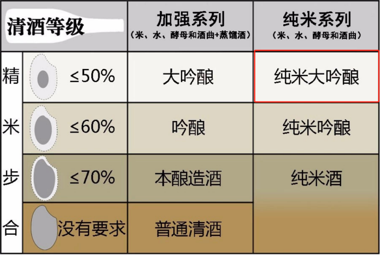 酒米的外层含丰富的蛋白质、脂肪、矿物质、维生素等,这些物质含量过多的话,在酿酒时会破坏清酒的香气与风味,因此制作清酒需要使用精碾去糠的白米。外皮被磨掉越多,精米步合度越低,品质越高。根据法规规定,清酒自高到低按等级大致分为:纯米酒、吟酿酒、本酿造酒、普通酒,纯米大吟酿是清酒中的至高级别,精米步合度要在 50% 及以下,且不添加任何酒精。