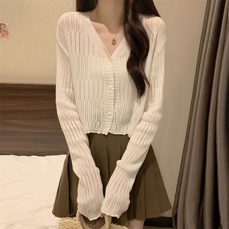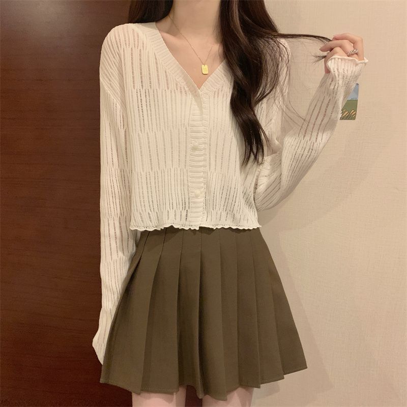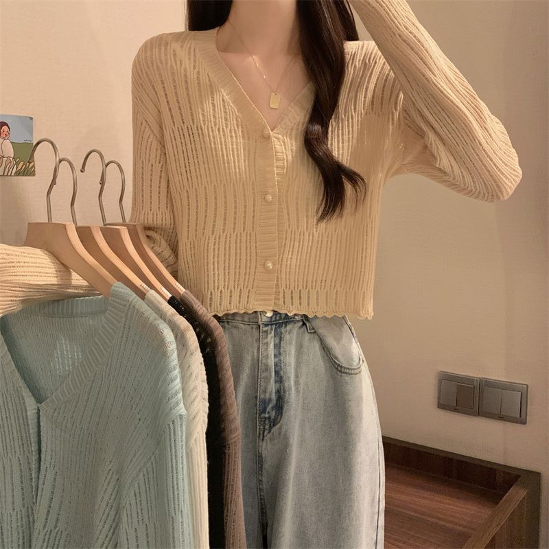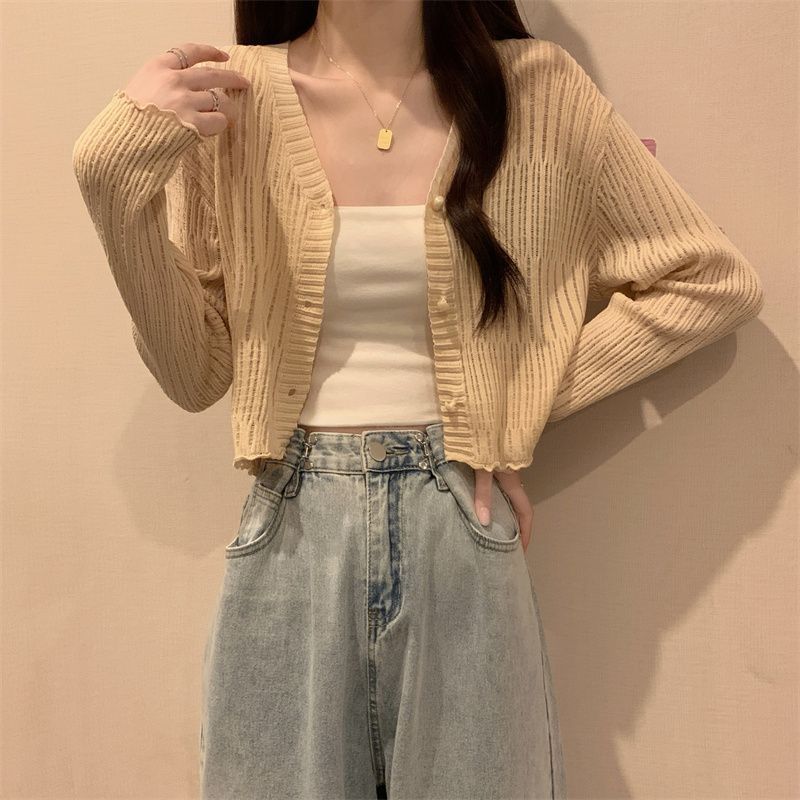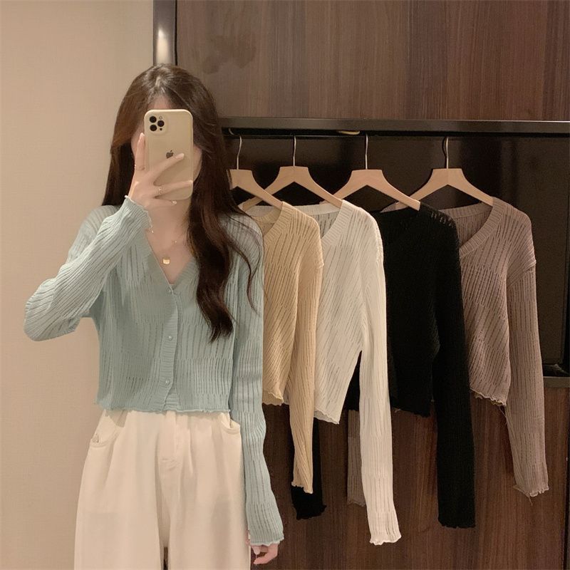 【新款长袖❗️木耳边V领针织衫】舒适亲肤,洋气减龄,显瘦好看!薄款女长袖防晒小开衫短款外搭上衣春秋