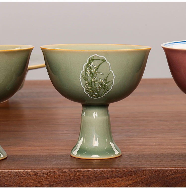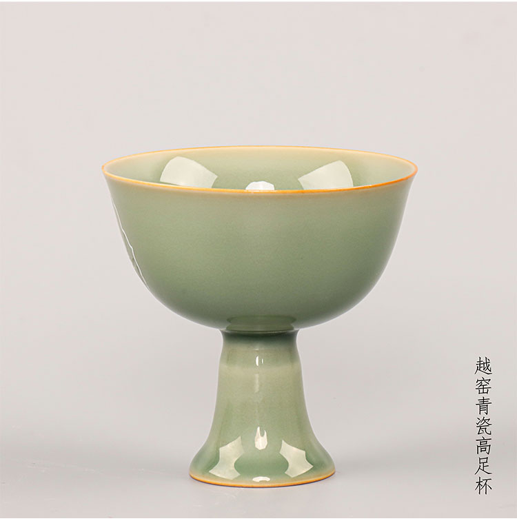 永利汇仿越窑秘色复刻釉水中式复古文艺创意茶道绘花窗兰高脚主人杯青釉