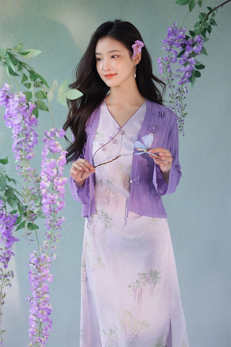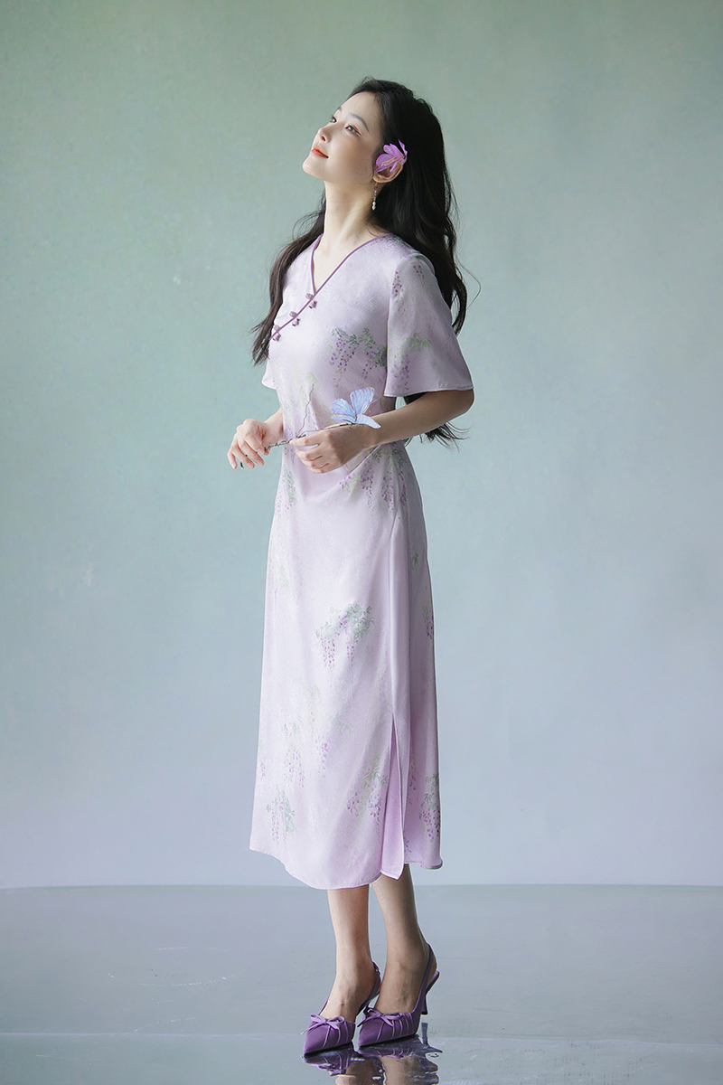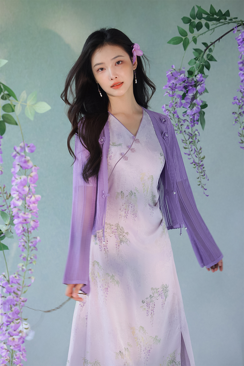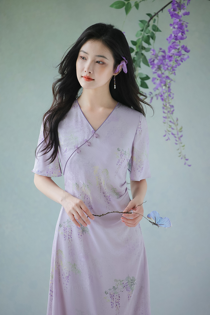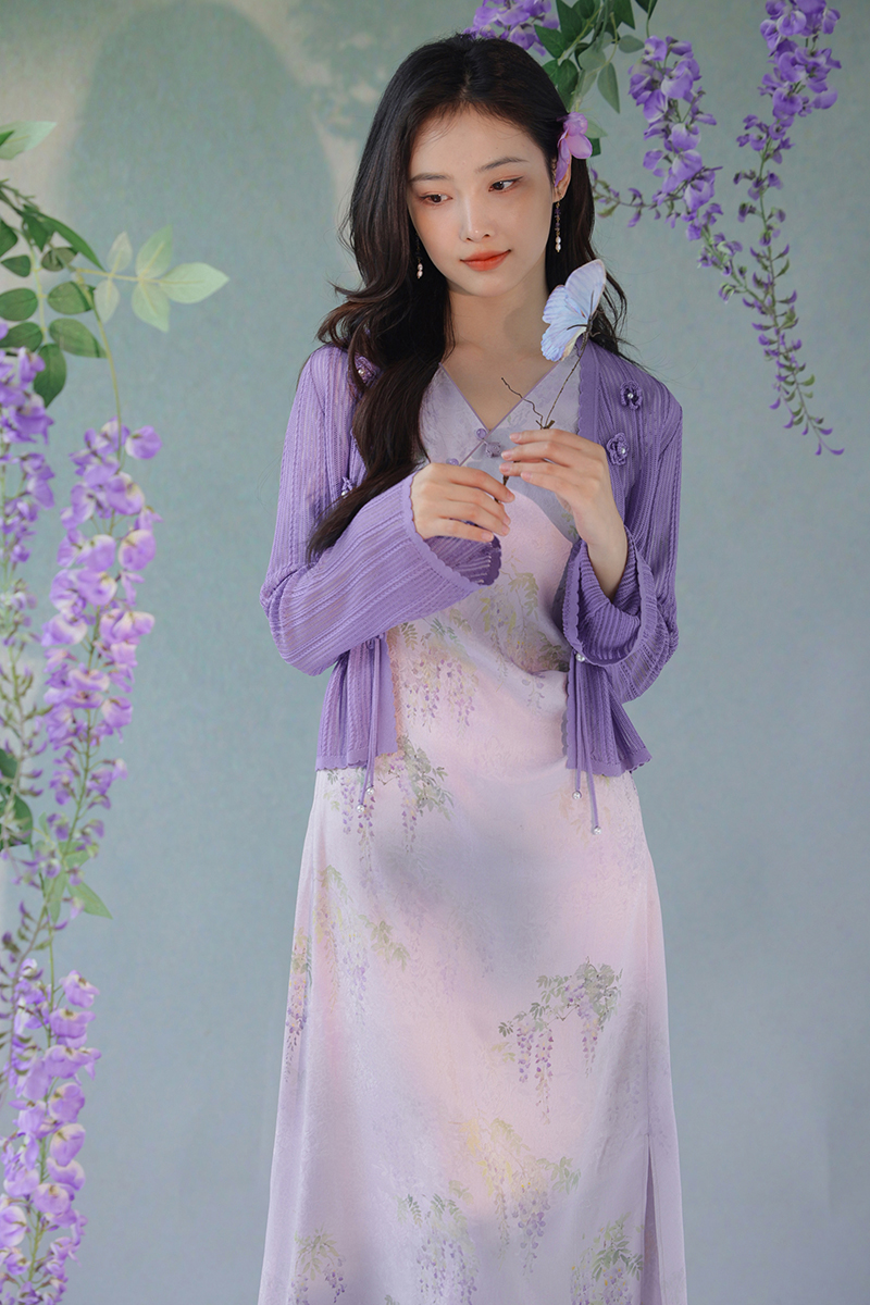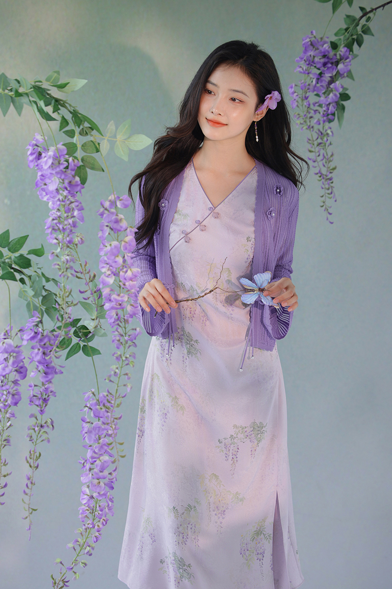 #浅紫真丝花罗连衣裙「紫藤」