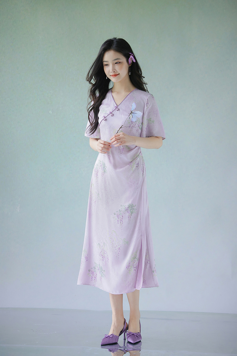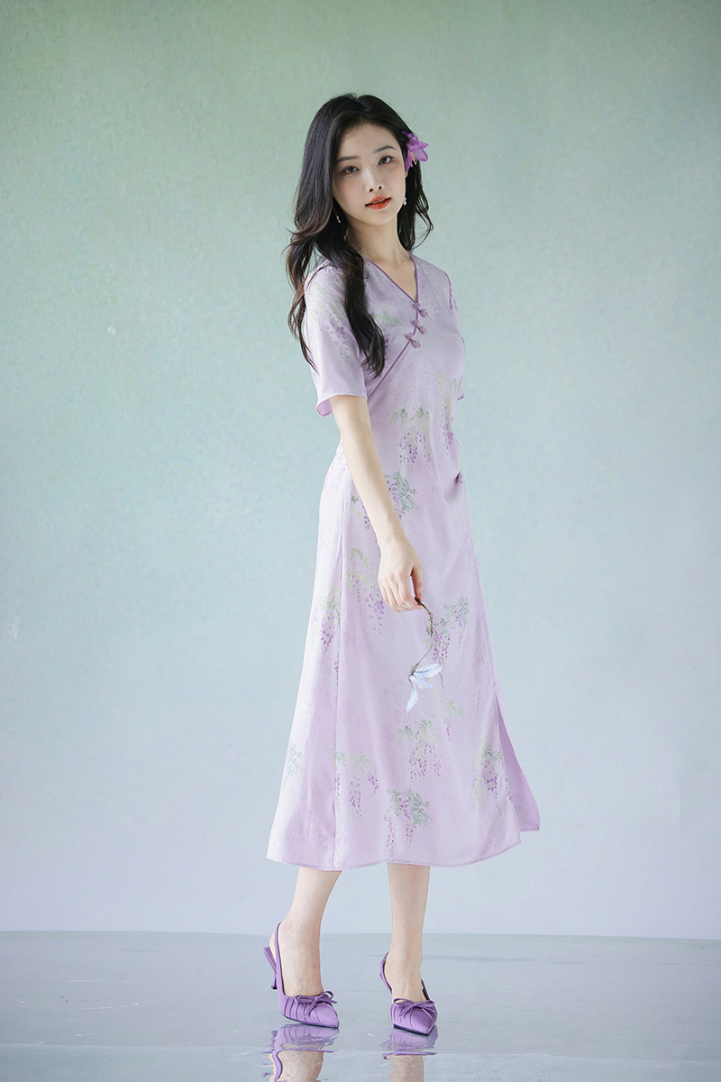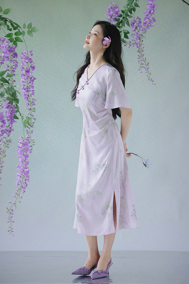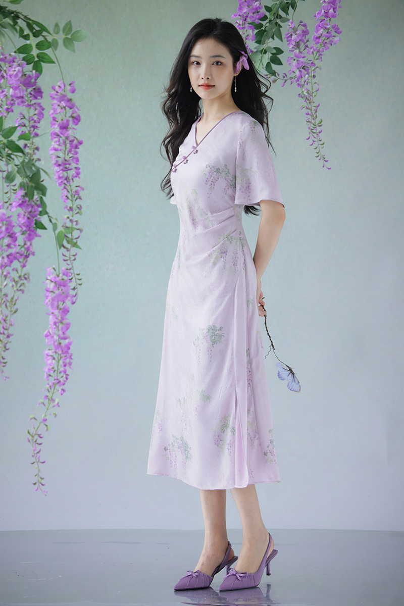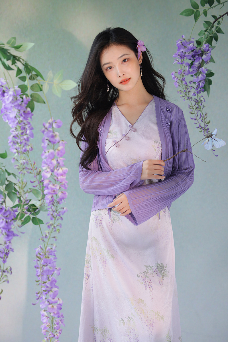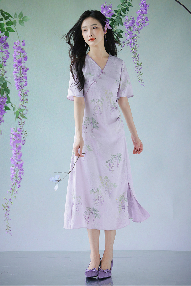 #浅紫真丝花罗连衣裙「紫藤」