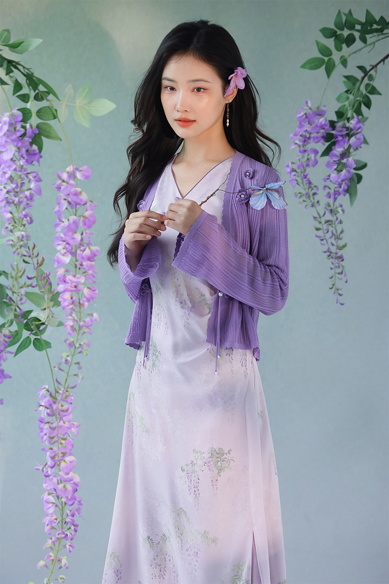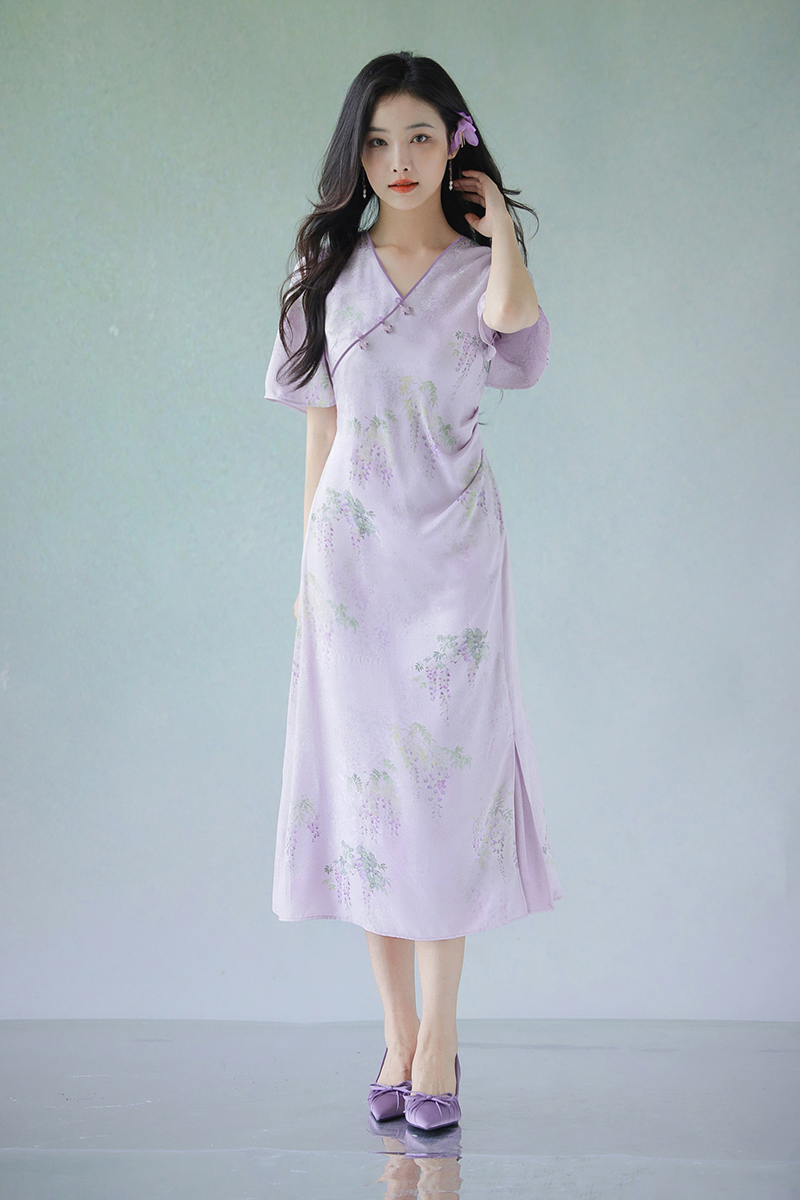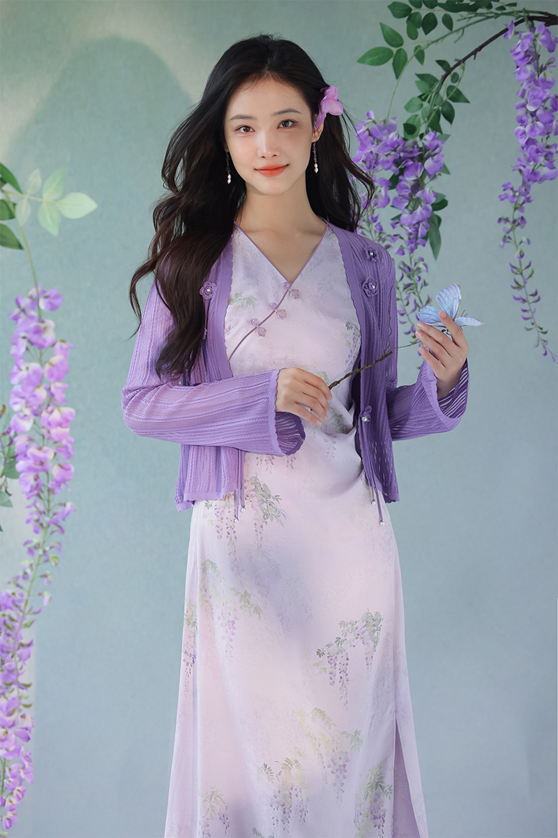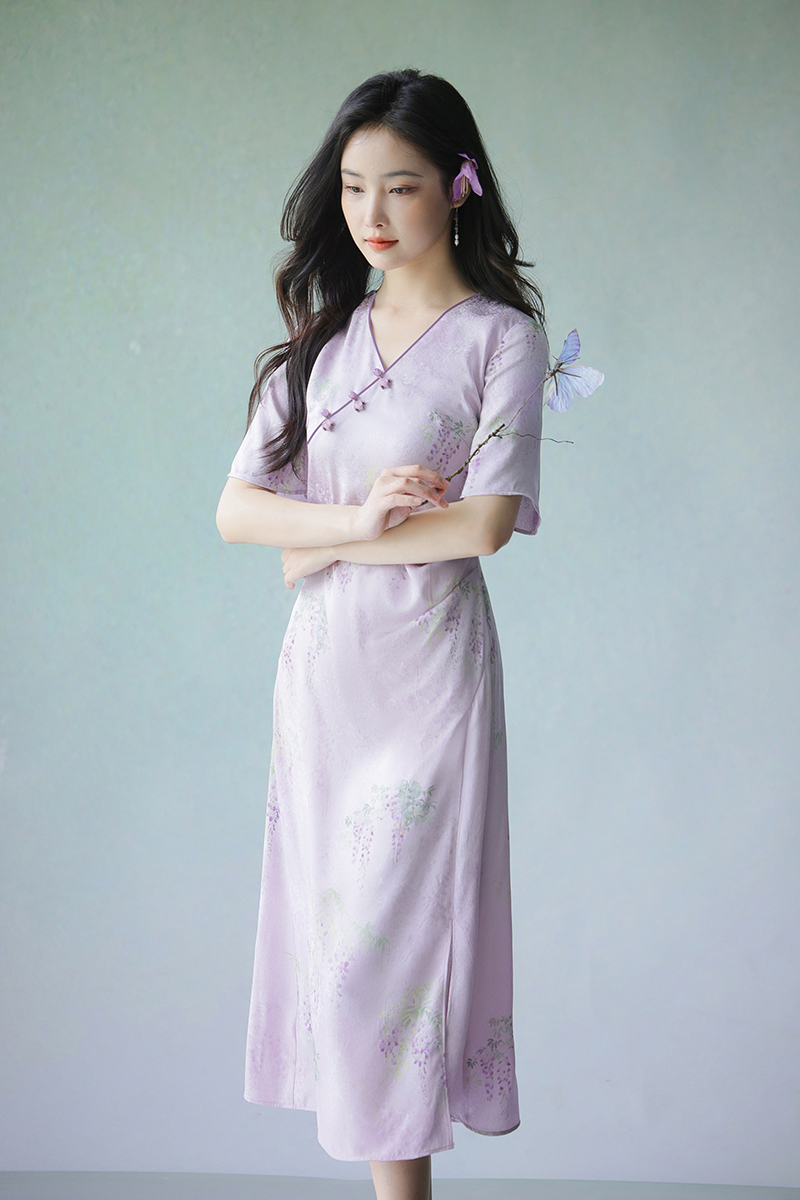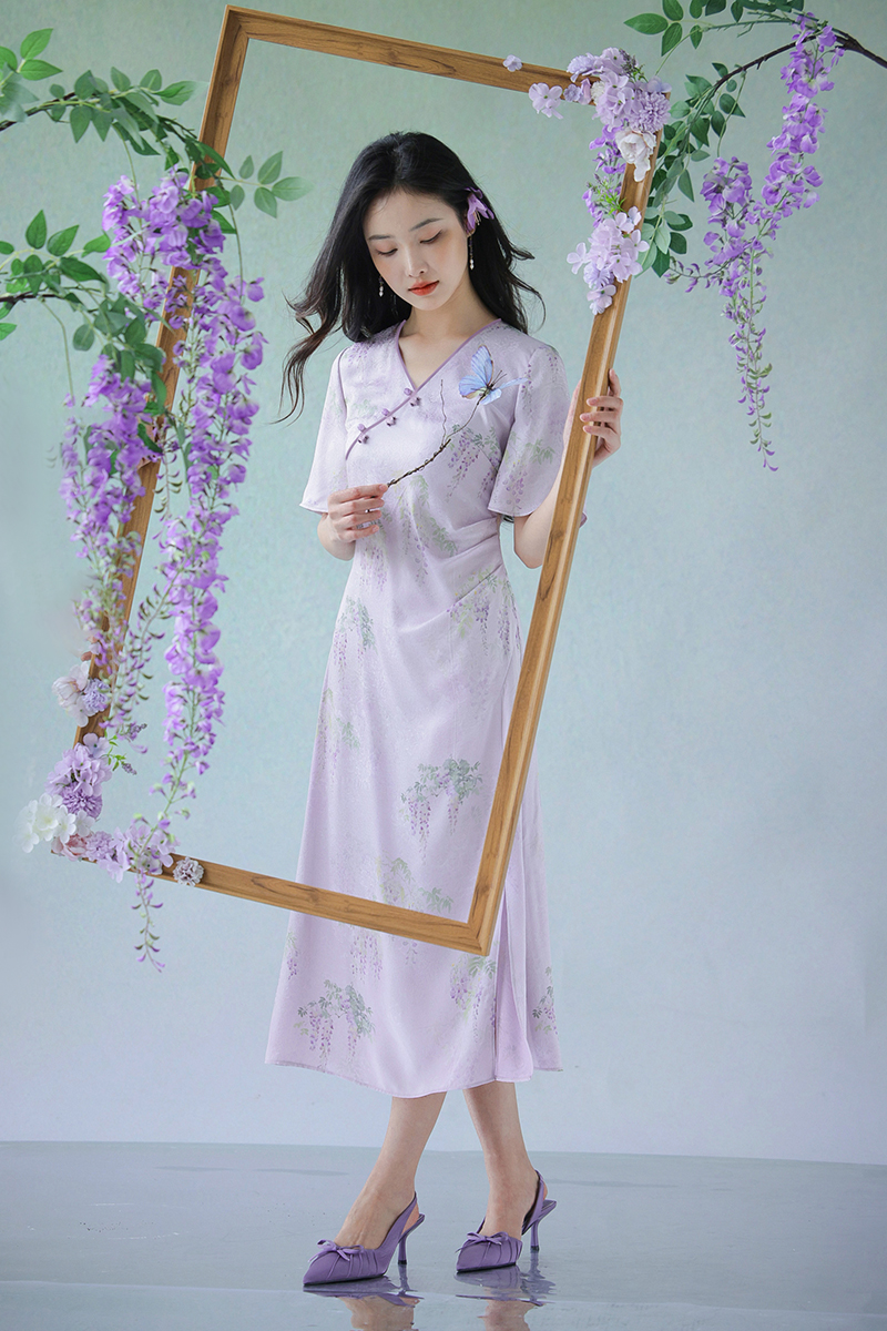 #浅紫真丝花罗连衣裙「紫藤」