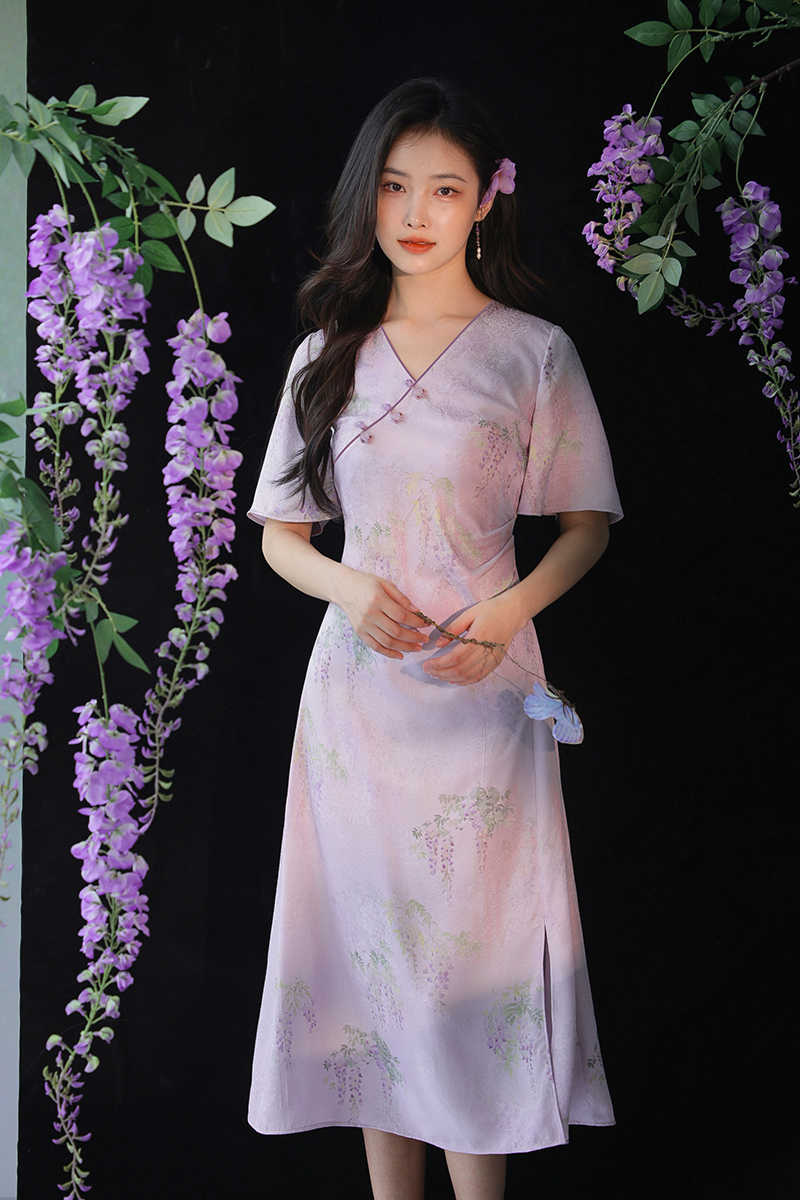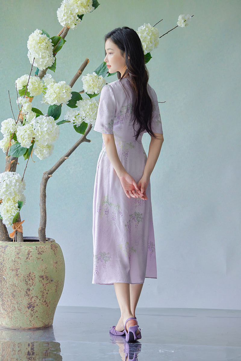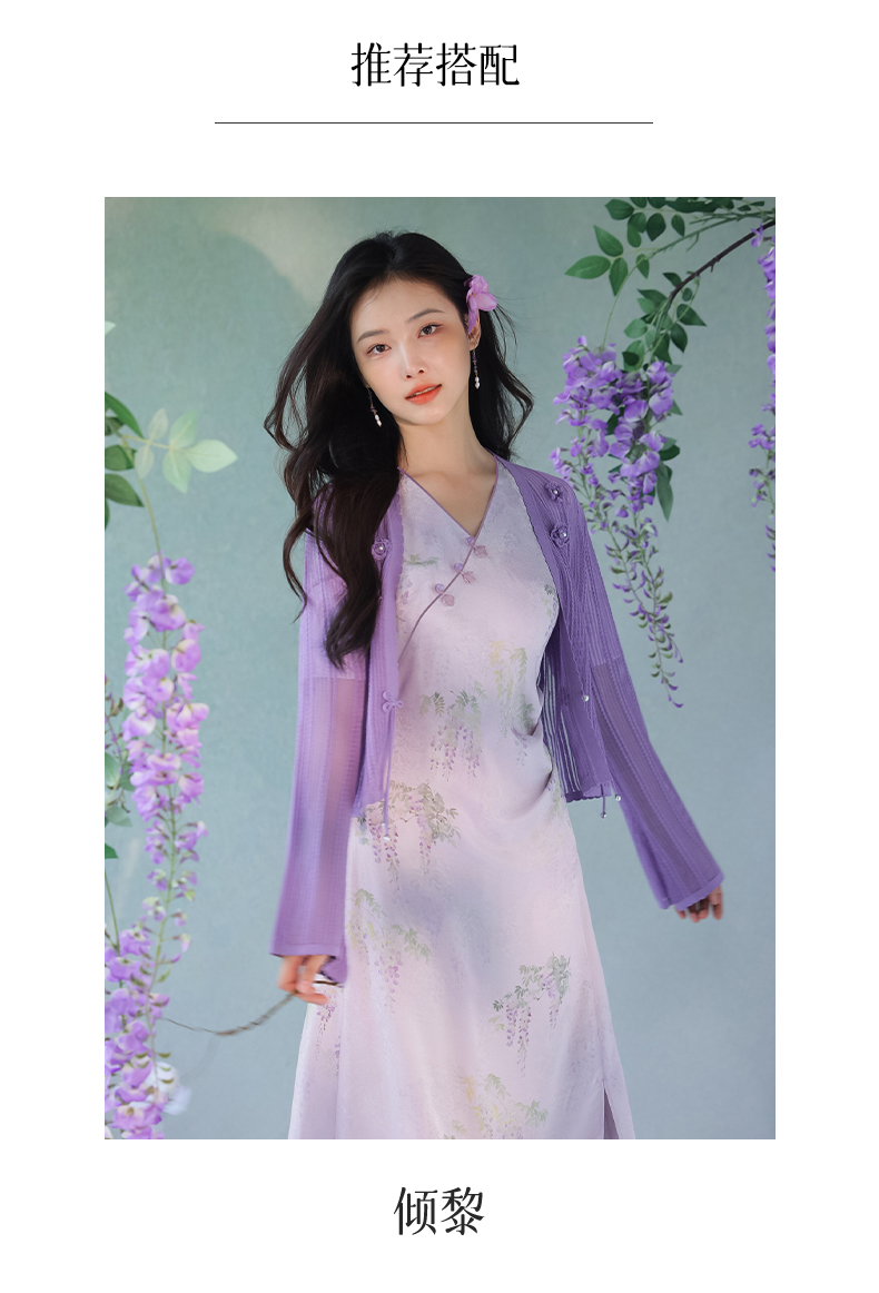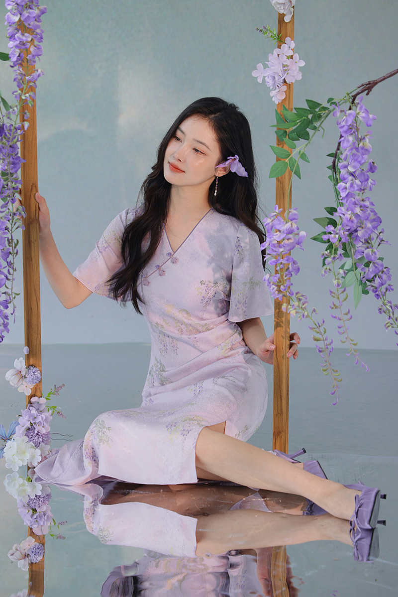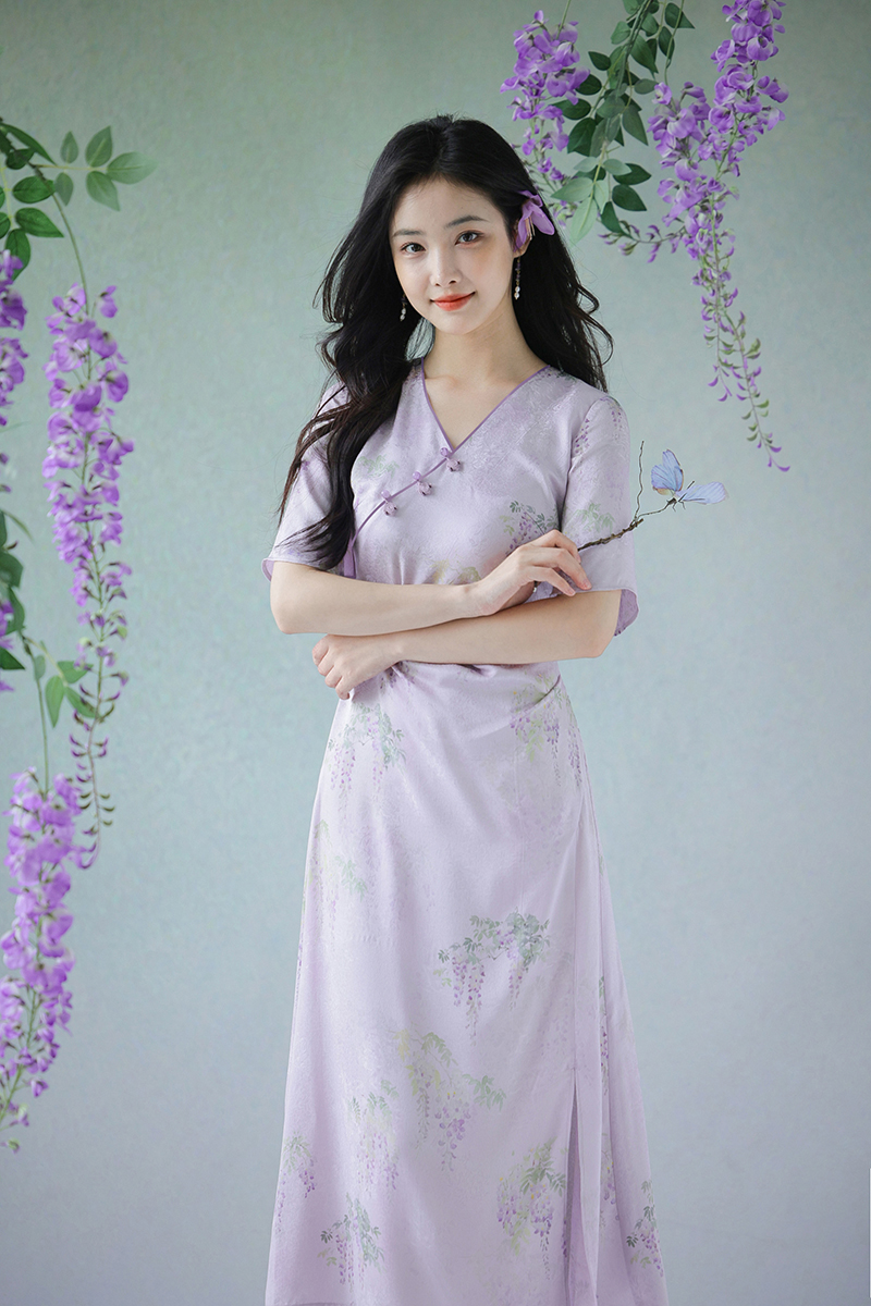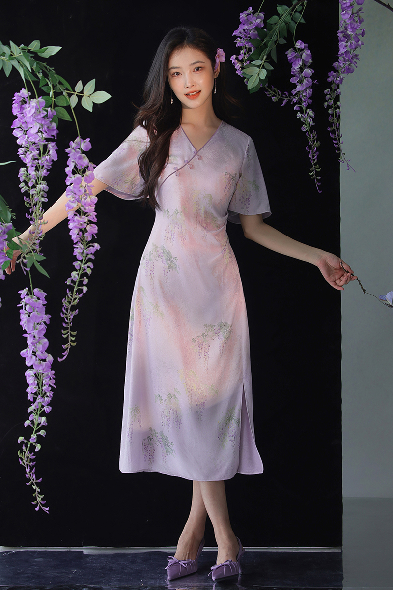 #浅紫真丝花罗连衣裙「紫藤」