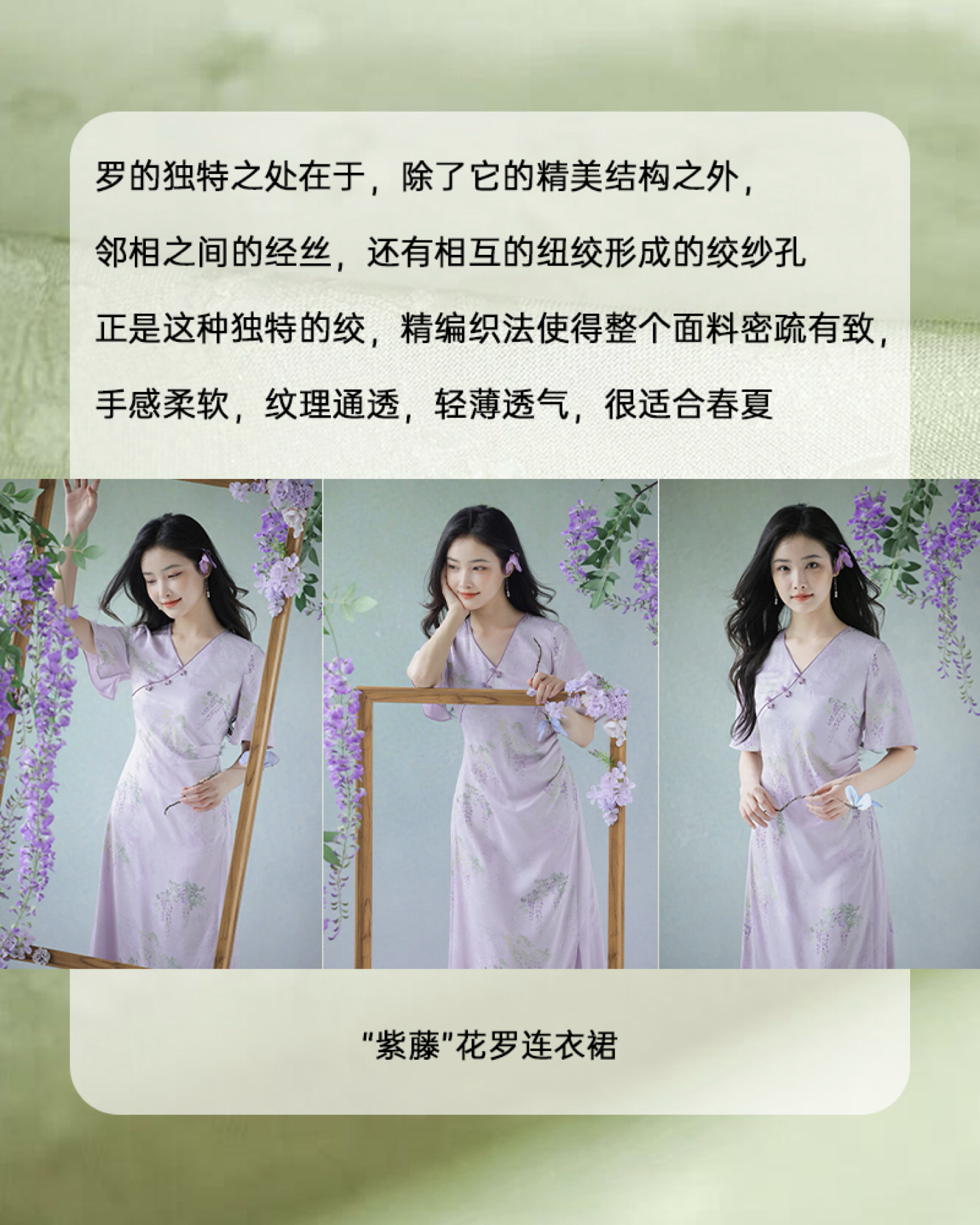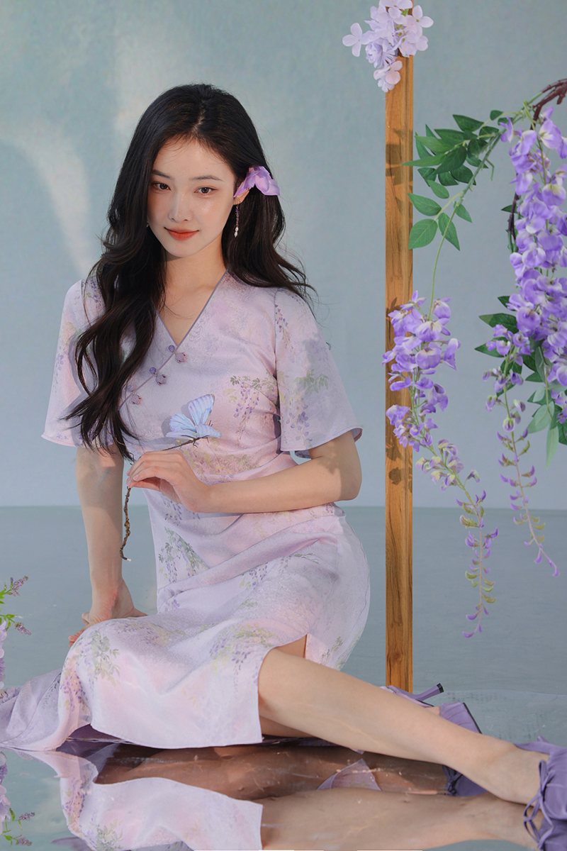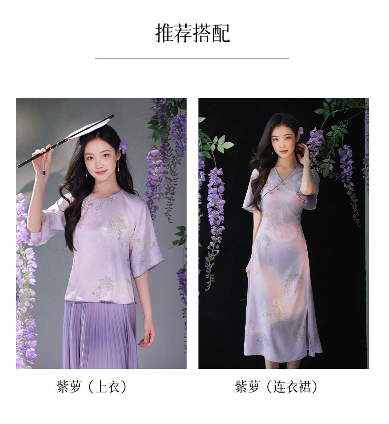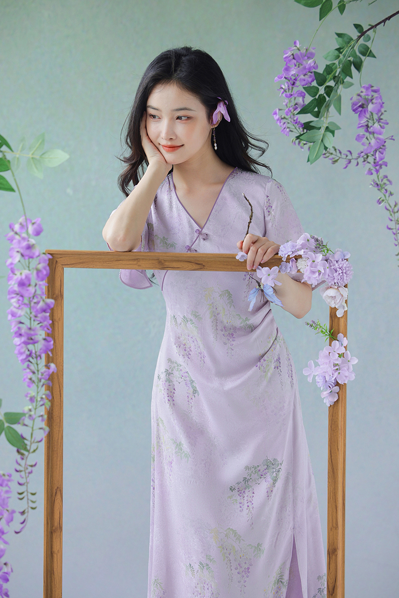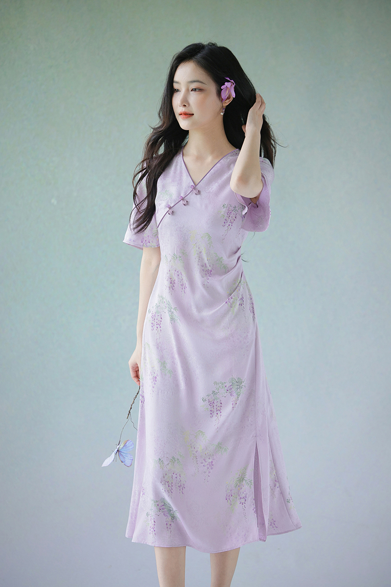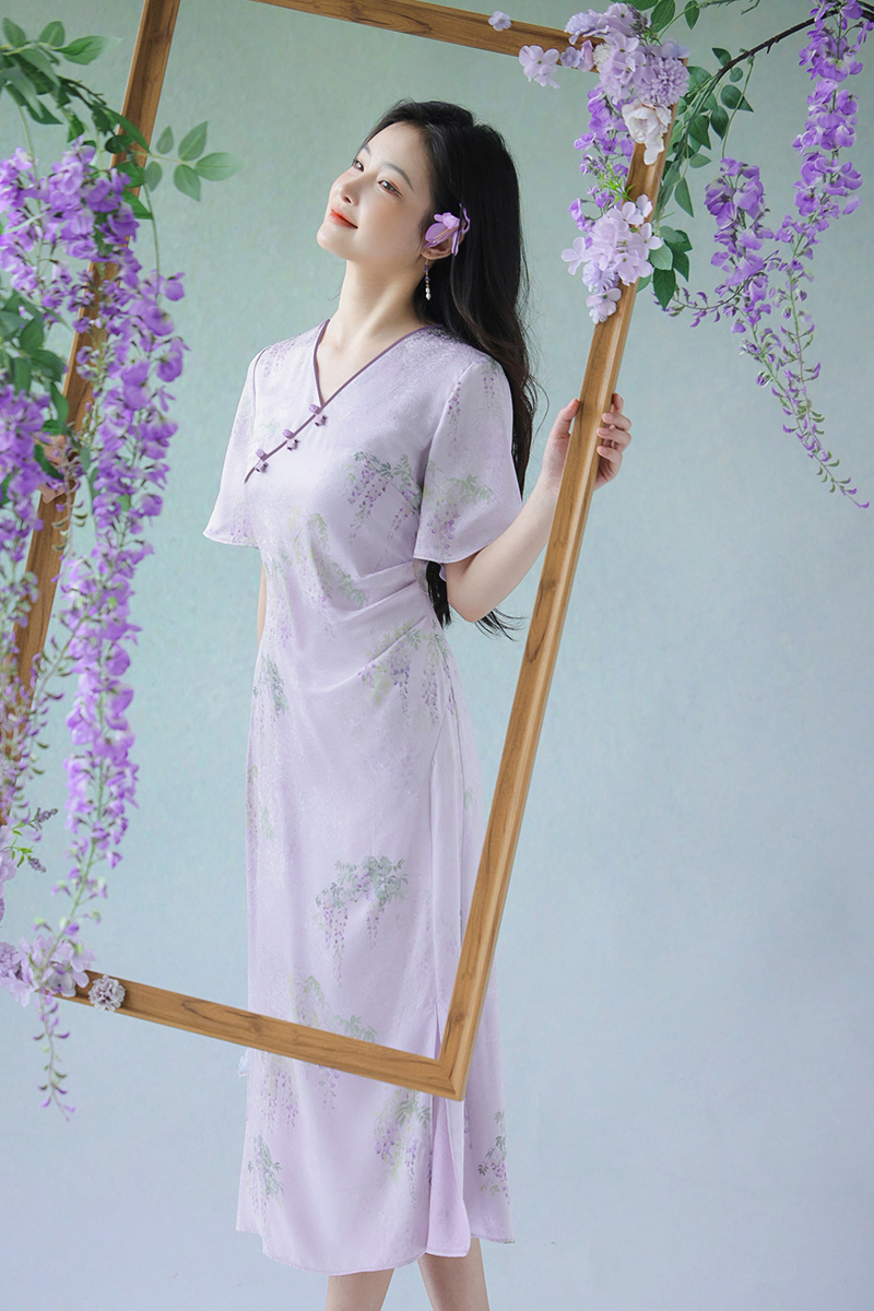 #浅紫真丝花罗连衣裙「紫藤」
