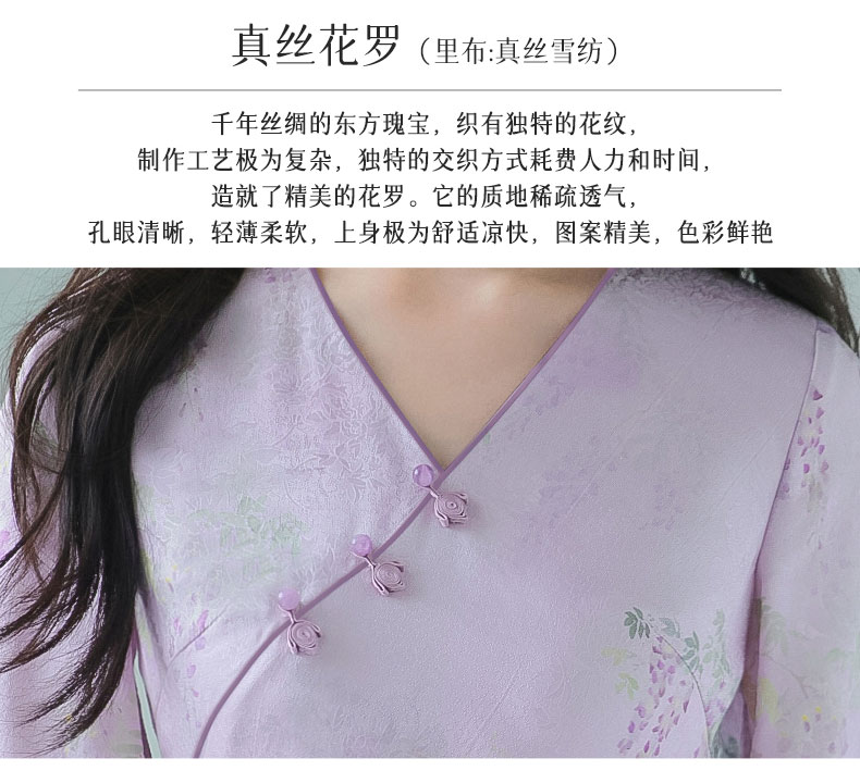 真丝花罗,手感细腻柔软,颜色非常好看,衣身有精致花纹,配上独特手工花扣,一张一合,一动一静,恰到好处。夏天穿能很大程度上减少闷热感,爱不释手就是说它了!