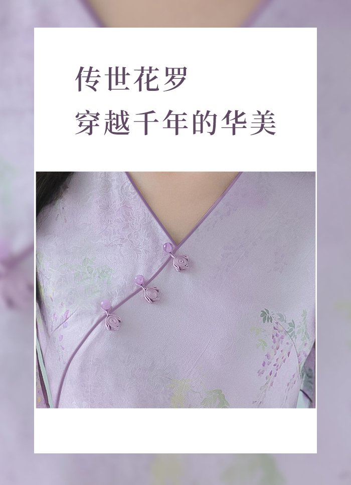 • 郁金香玉石盘扣缀于领襟,紫玉含烟与衣身藤花统一整体,暗藏“藤间藏玉”的东方巧思。