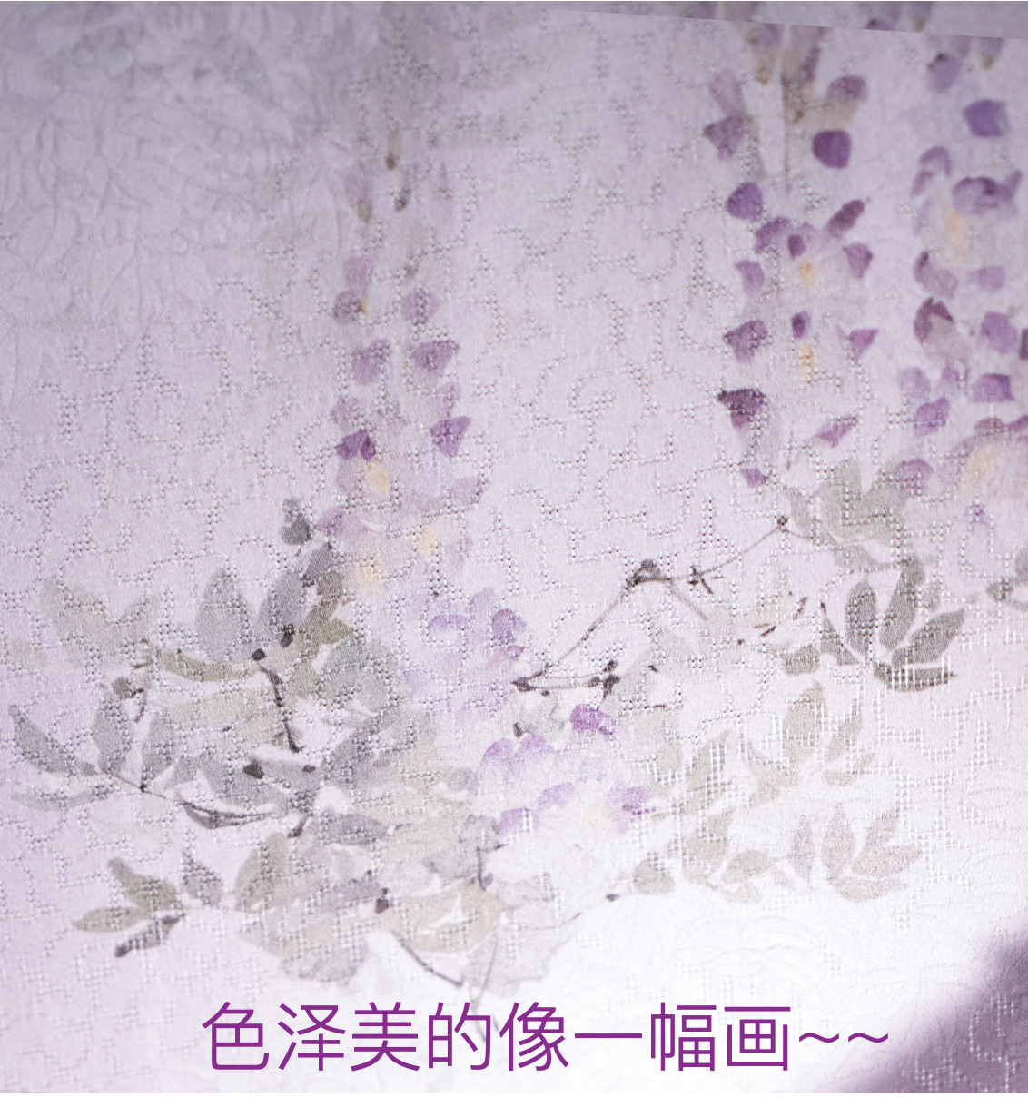 灵感源自东方庭院的紫藤花影,以清浅丁香紫为底,缀满规律交叠的紫藤花枝。低饱和度花色与底色自然交融,似水墨晕染般朦胧柔美,不张扬却自带高级感。