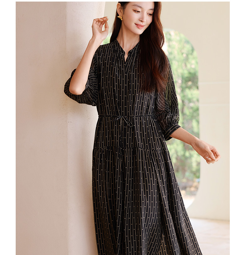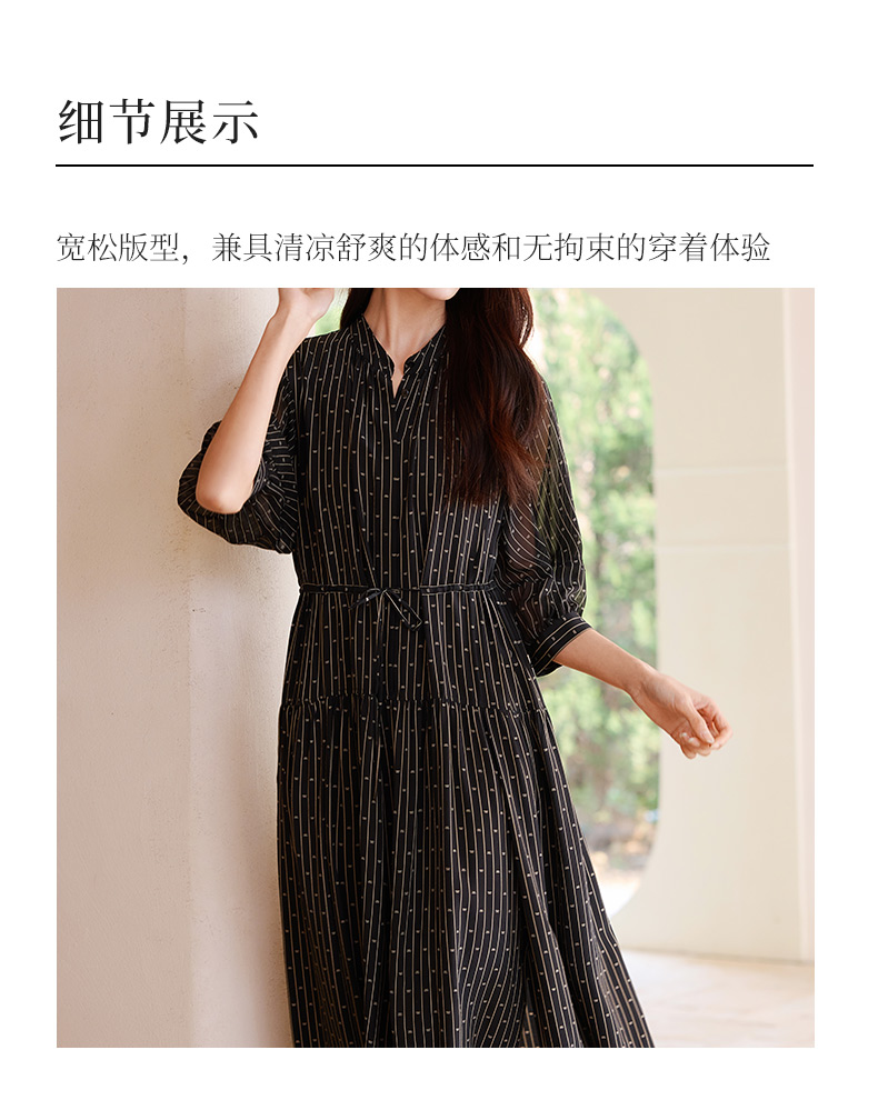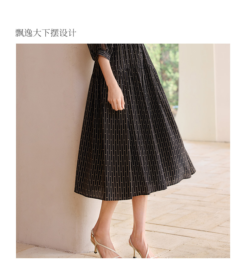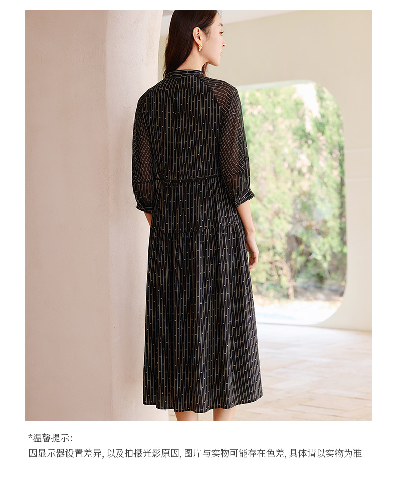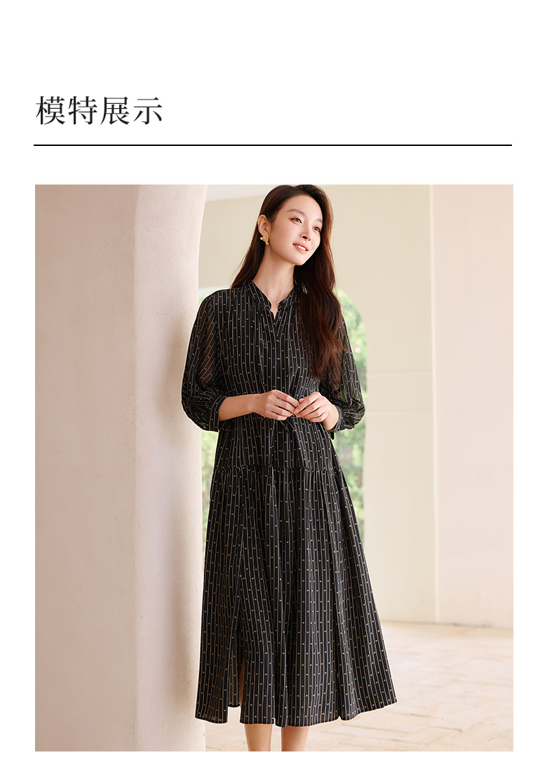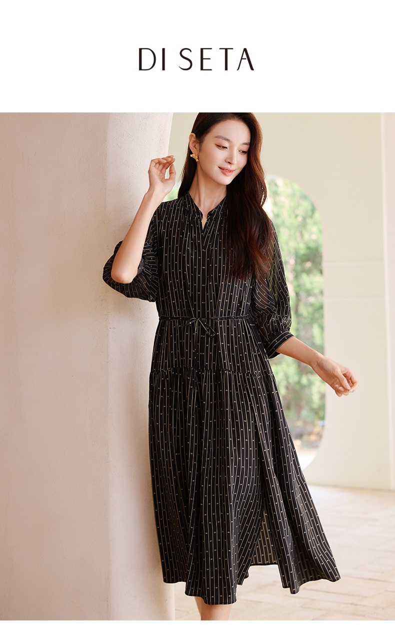 玳莎竖条纹印花真丝连衣裙2025年夏季新款轻薄双绉抽褶中长款裙子 FB35201