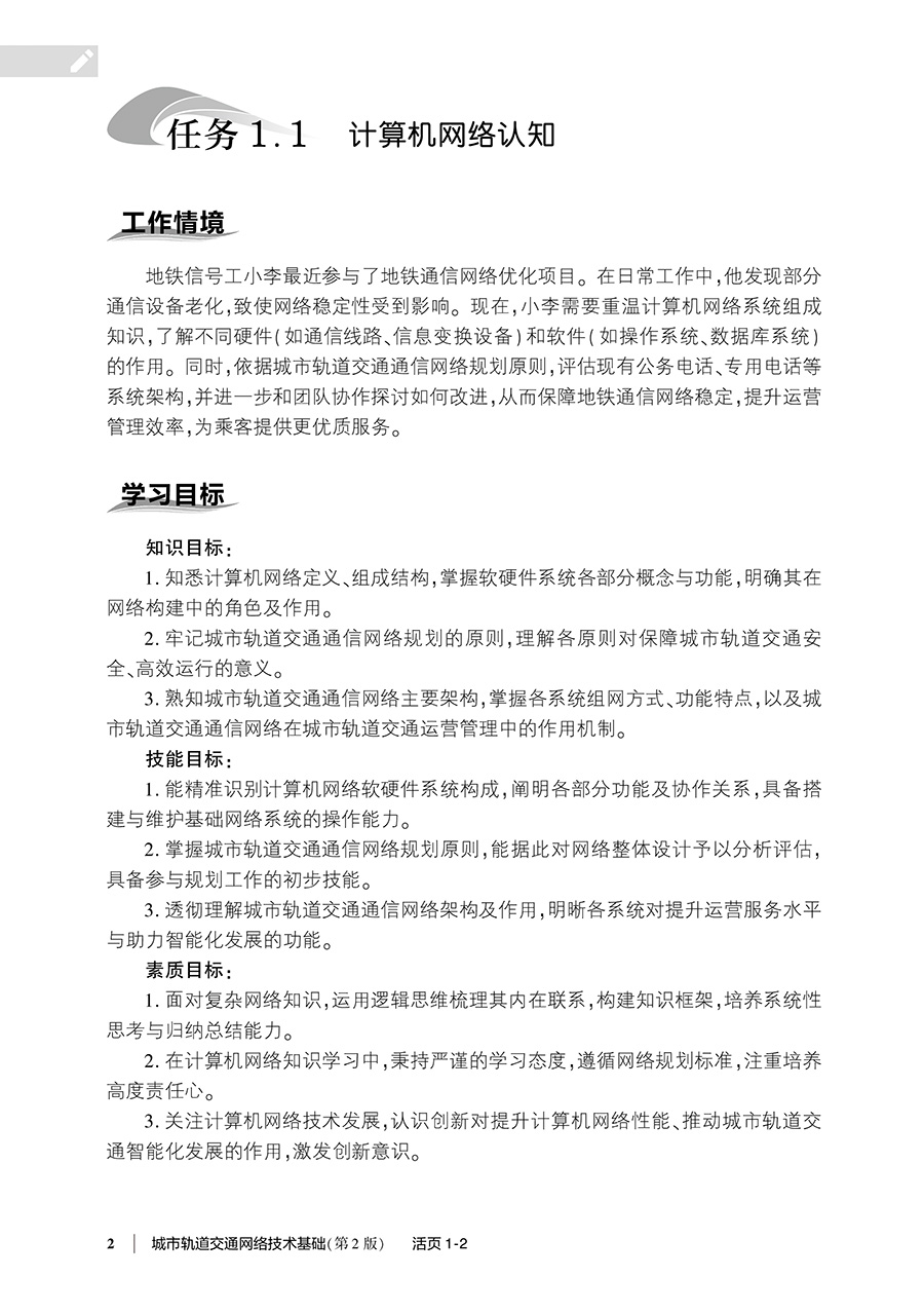 本书是职业教育城市轨道交通类专业教材。全书共分为8个项目,包含计算机网络基础知识、数据通信基础知识、主机系统安装、局域网组建、IP编址技术、网络服务配置、无线局域网搭建、局域网安全与维护。本书知识内容翔实,实用性强。全书设计了实训工单,同时配套了动画、视频、微课等数字资源,落实了;互联网十新形态一体化教材编写理念。本书编写本着知识;必需和;够用的原则,理论联系实际,注重对学习者综合能力的培养。本书可作为职业教育城市轨道交通类专业基础课教材,还可供计算机网络管理人员及技术人员参考。本书配套丰富助学助教资源,请有需求的任课教师通过加入职教轨道教学研讨群(QQ群:129327355)获取。