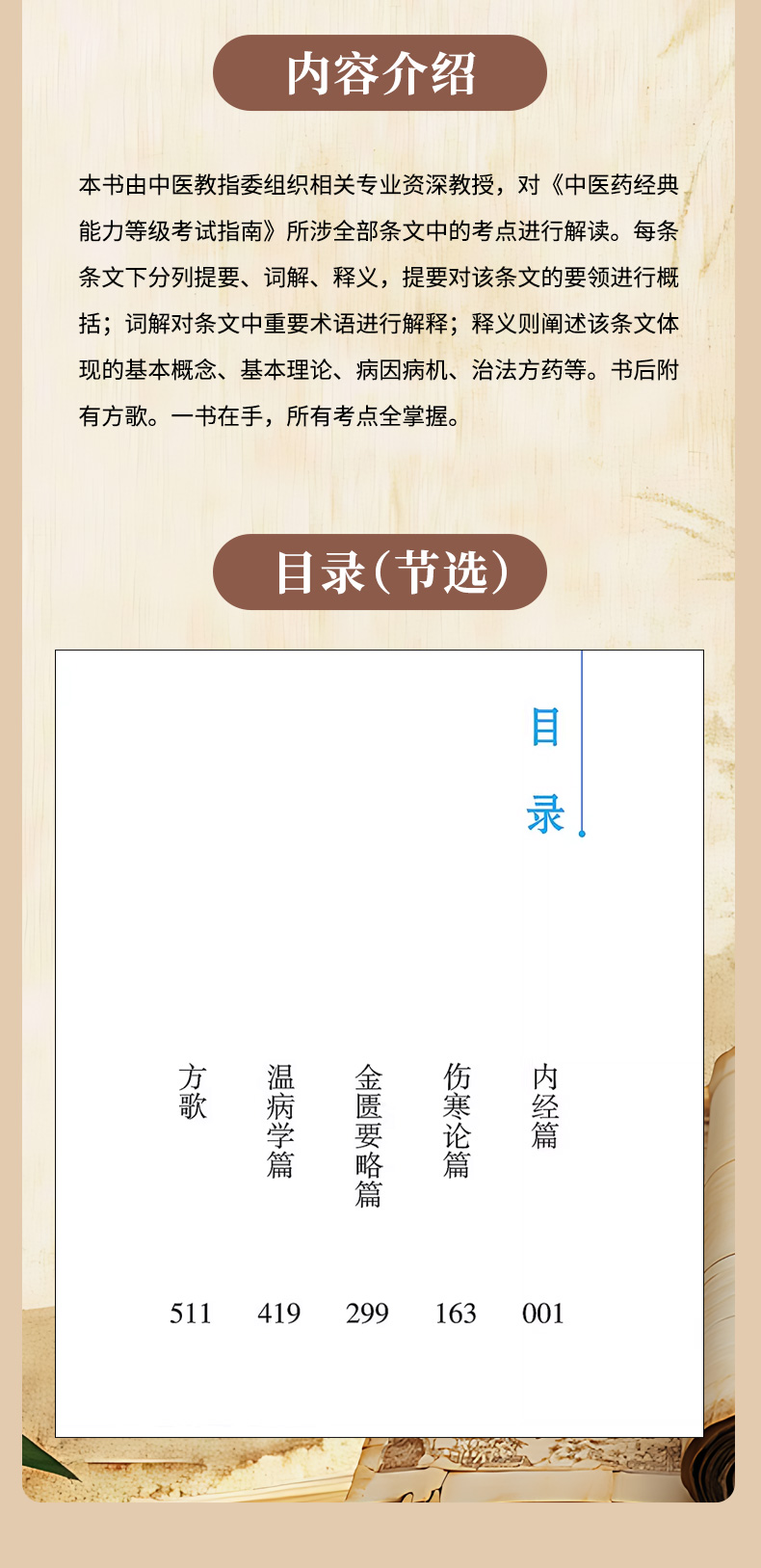 中医经典能力等级考试由教育部高等学校中医学类专业教学指导委员会(以下简称“教指委”)以机考联考形式设计并组织开展。考试分为三个等级:一级要求熟练诵记经典中的基本概念、基本理论、基本方证原文,并掌握其文义、医理;二级在一级基础上,要求进一步掌握经典理论的系统性和主要方证间的联系,并增加诵记相应原文;三级在二级基础上,要求进一步理解经典理论的学术原理和临床应用思路,并增加诵记相应原文。为帮助全国各中医院校考生顺利通过中医经典等级考试,教育部高等学校中医学类专业教学指导委员会组织全国编写本书,对中医经典等级考试(二级)所涉的《黄帝内经》《伤寒论》《金匮要略》和温病学名著原文展开阐释,对其中的重要名词进行解释,以促进考生对条文的深入理解。本书释文简洁易懂,便于考生记忆,强调对考试的指导意义。