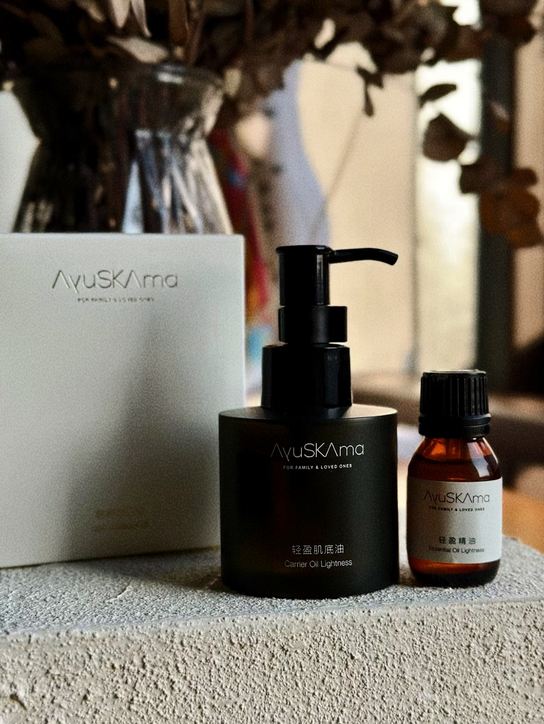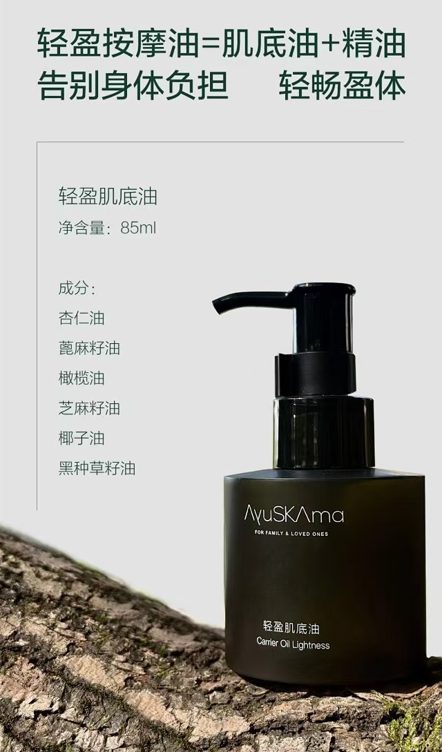 AyuSkAma轻盈按摩油,原来是在芳香限定里的,但实在太受欢迎,凑够了量就出大货咯,第一批仅出了2800套!而且也做了大升级,由100ml的一大瓶,分成了85ml复方植物油+15ml复方纯精油,可以随用随调,更灵活一些。尤其是刚刚开始用的老粉,如果怕浓度太高不耐受,可以先加半瓶纯精油到整瓶植物油中,用完后自己再额外用温润油、玫瑰果油、芝麻油、甜杏仁油或水飞蓟油之类的纯植物油来调剩下的半瓶纯精油哦,这样就差不多是稀释了1倍!