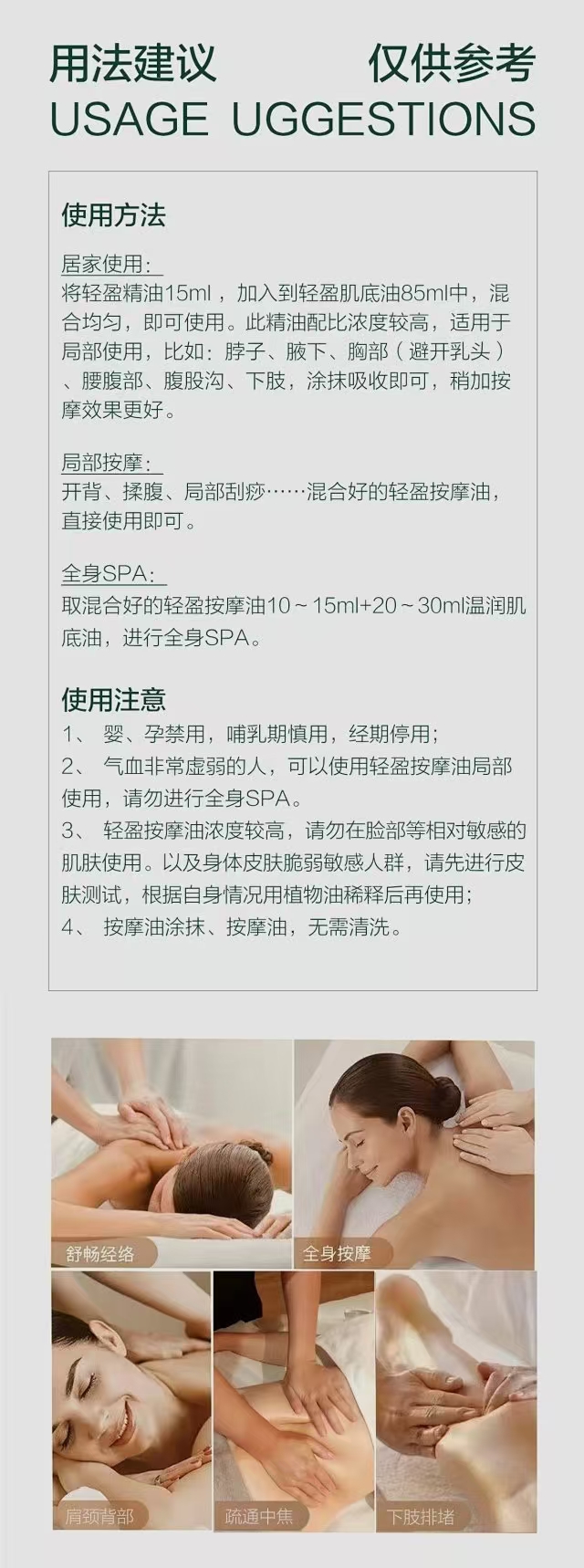轻盈按摩油特别适用以下人群:循环代谢不良、易长结节、静脉曲张、湿气重、虚胖、易便秘。孕幼和皮肤敏感人群禁用,而且官方浓度是用于身体局部的按摩油,如果要做全身的Spa请再做1-2倍稀释。禁止口服❌禁止上脸❌!