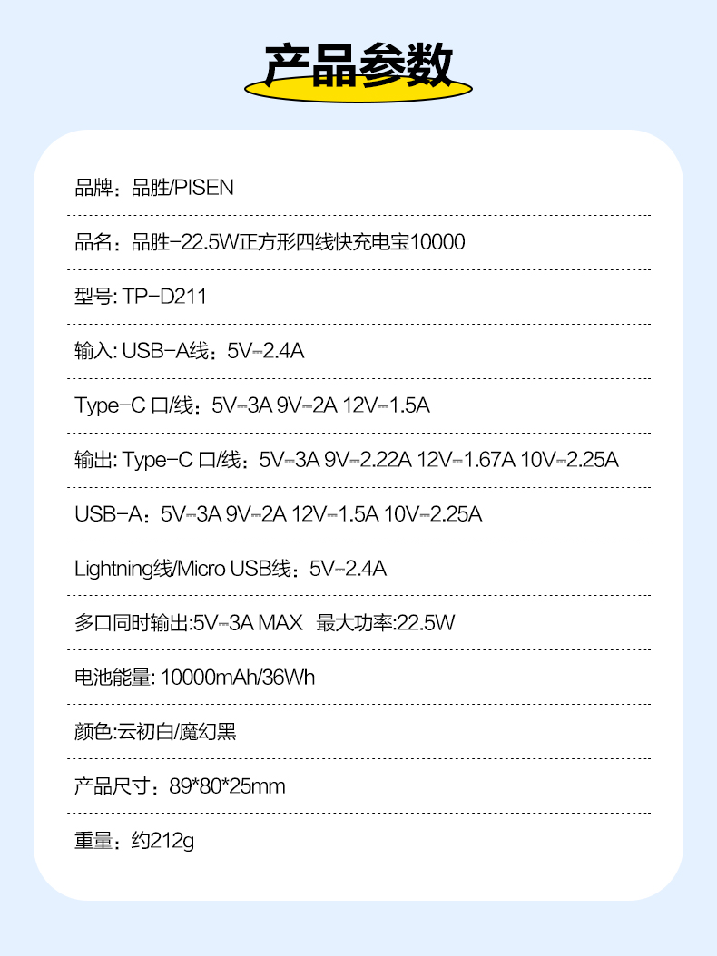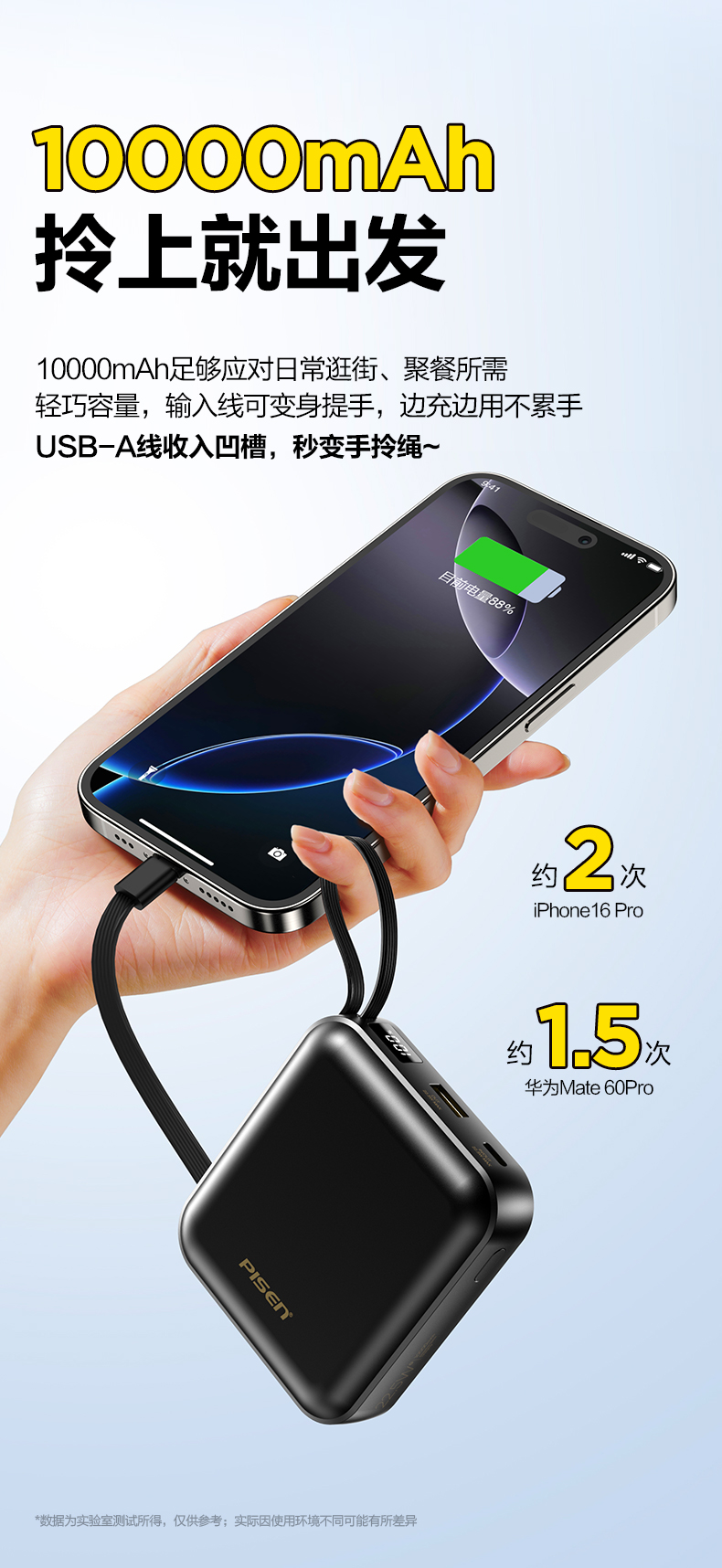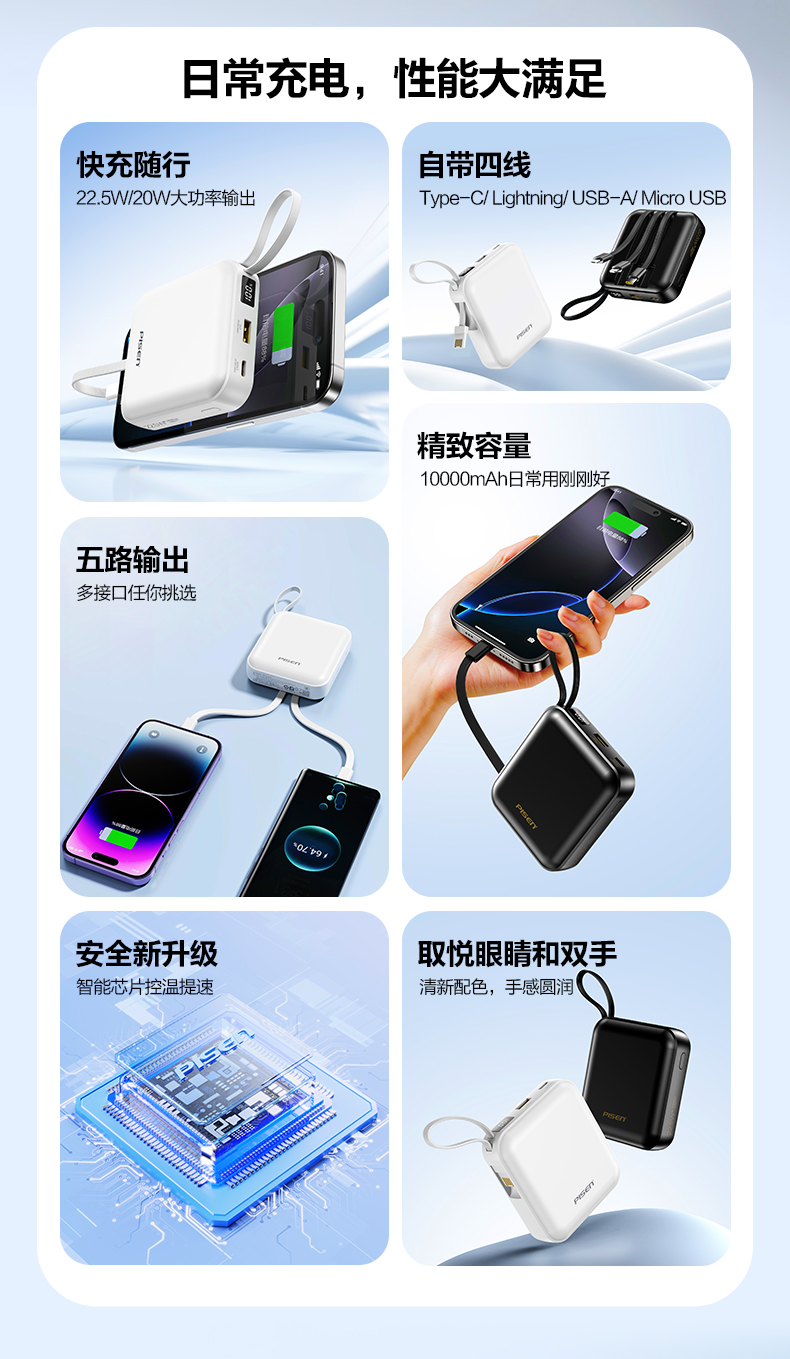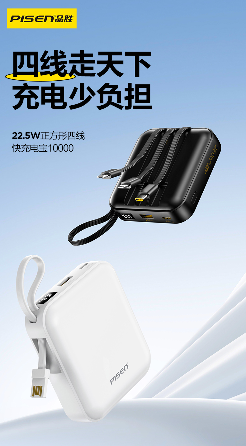 品胜 22.5W正方形四线快充电宝10000毫安 30W快充移动电源支持苹果16设备充电