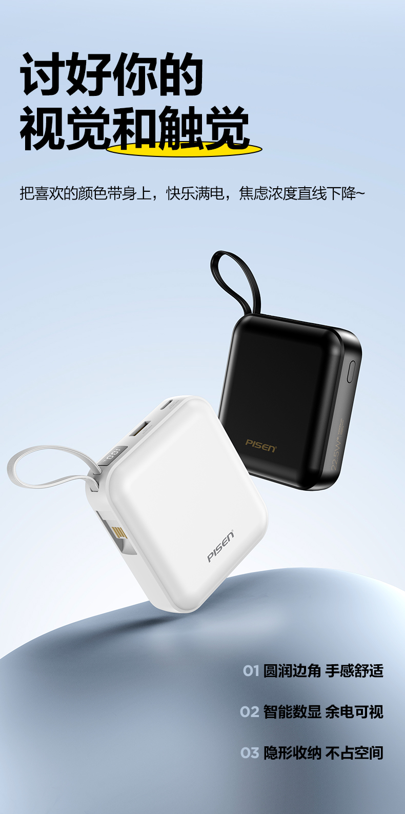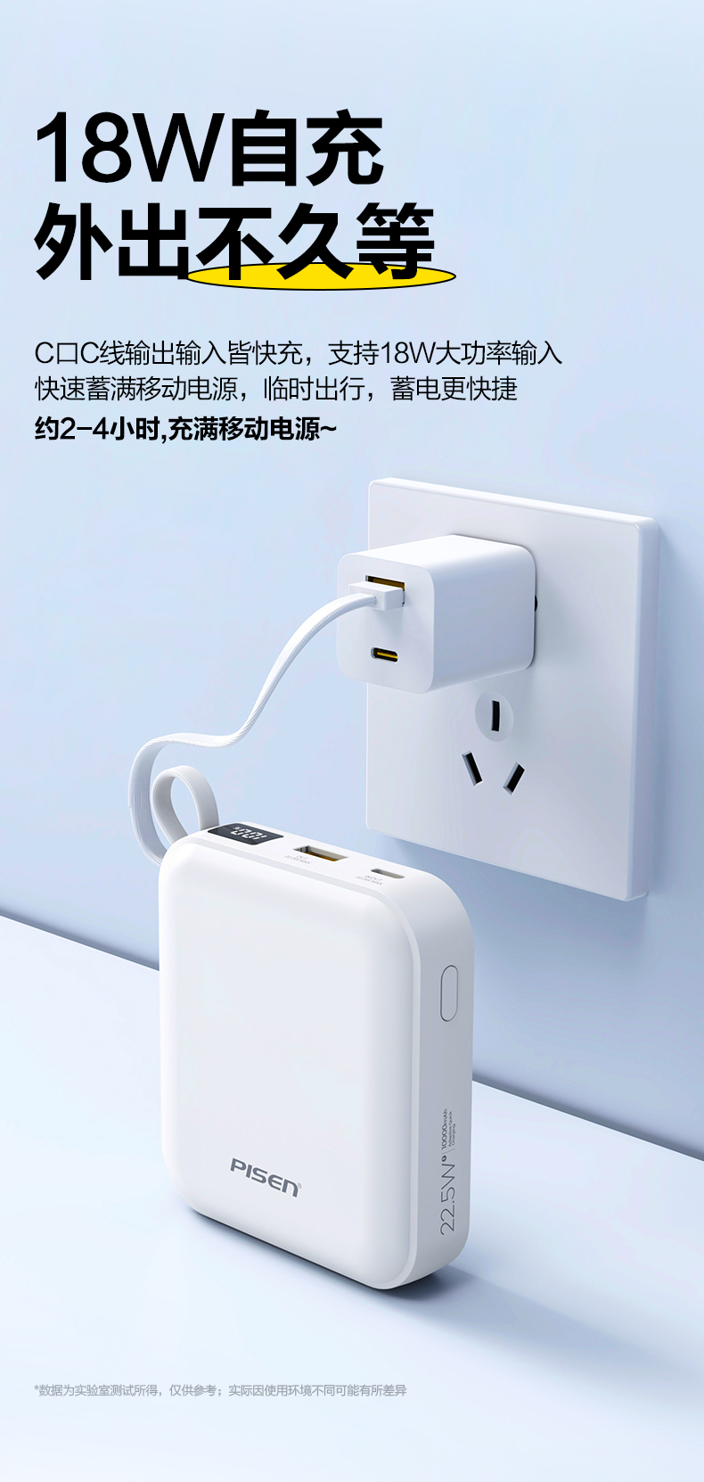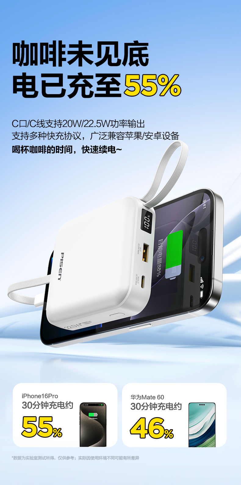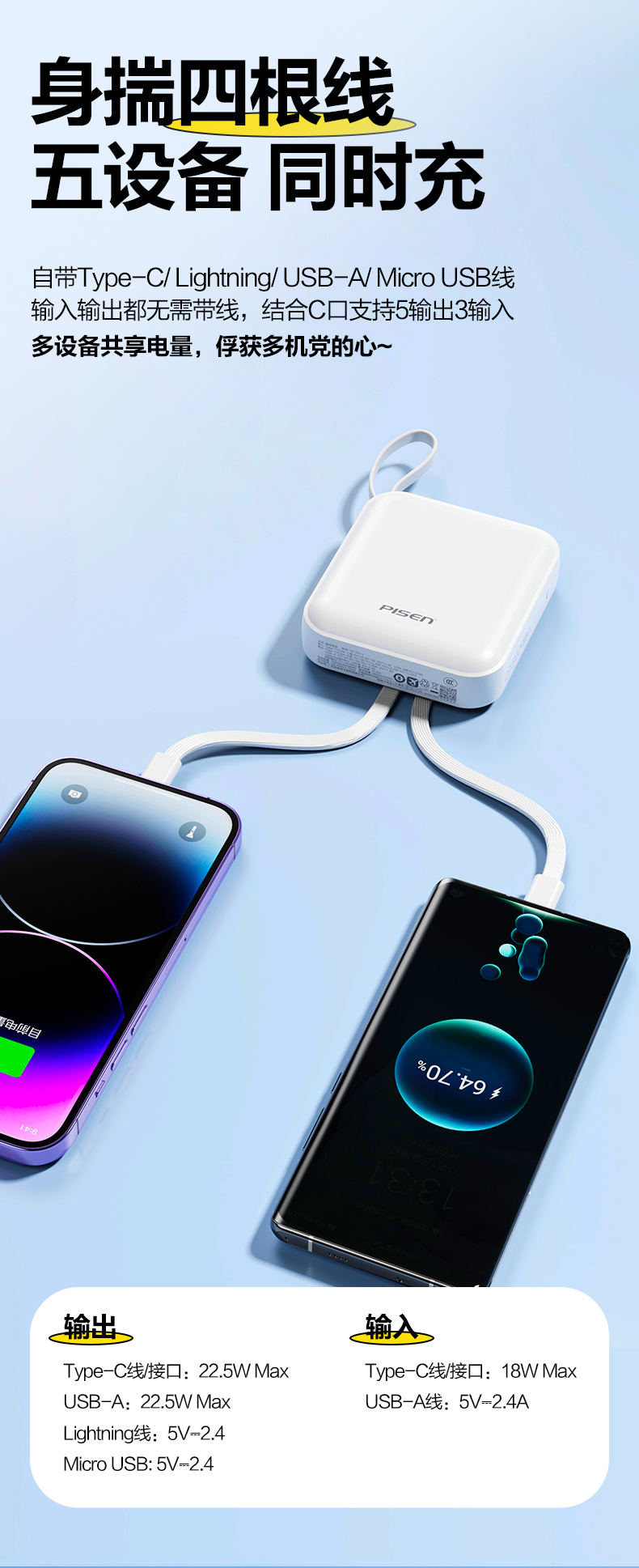 品胜 22.5W正方形四线快充电宝10000毫安 30W快充移动电源支持苹果16设备充电