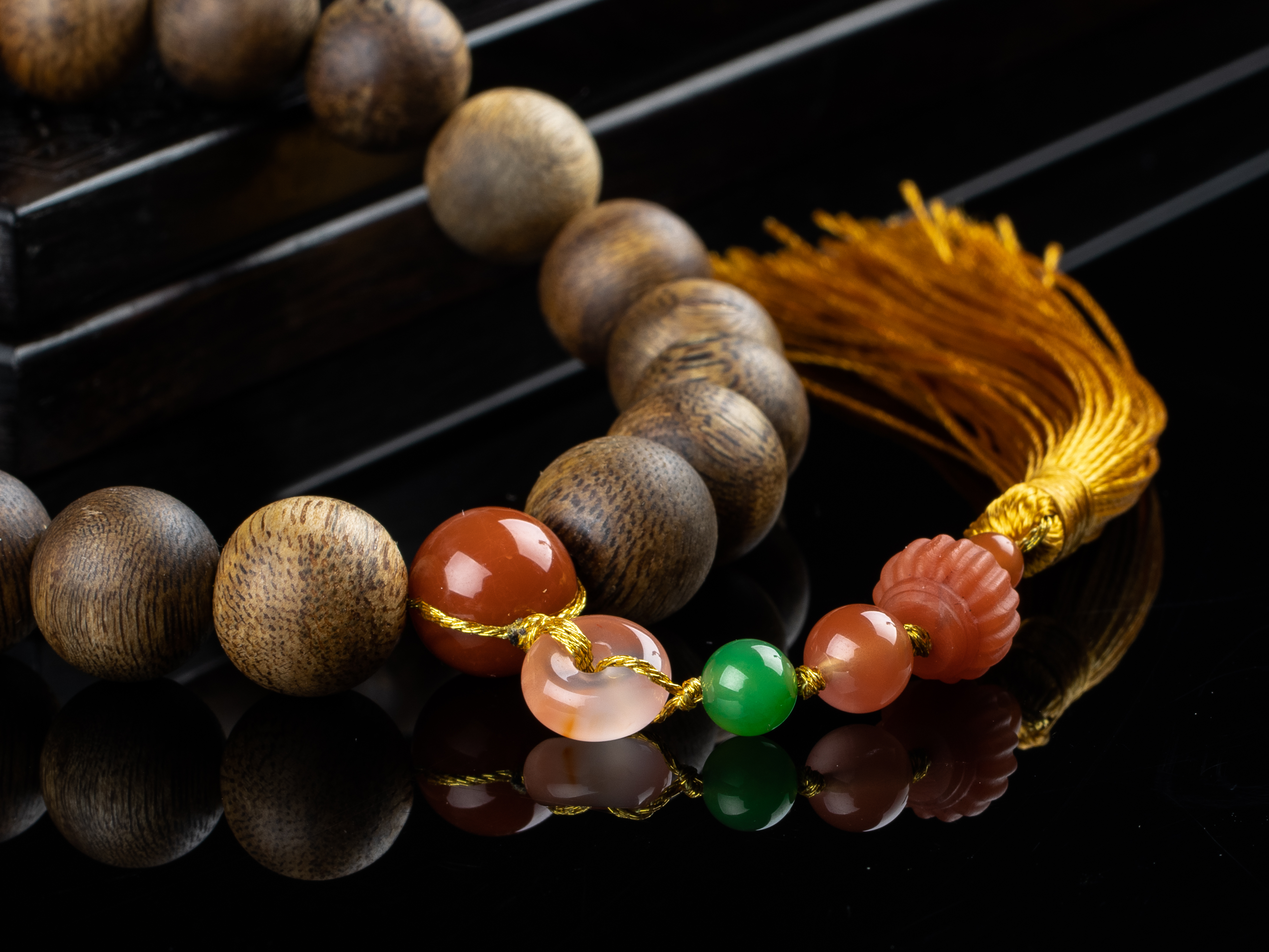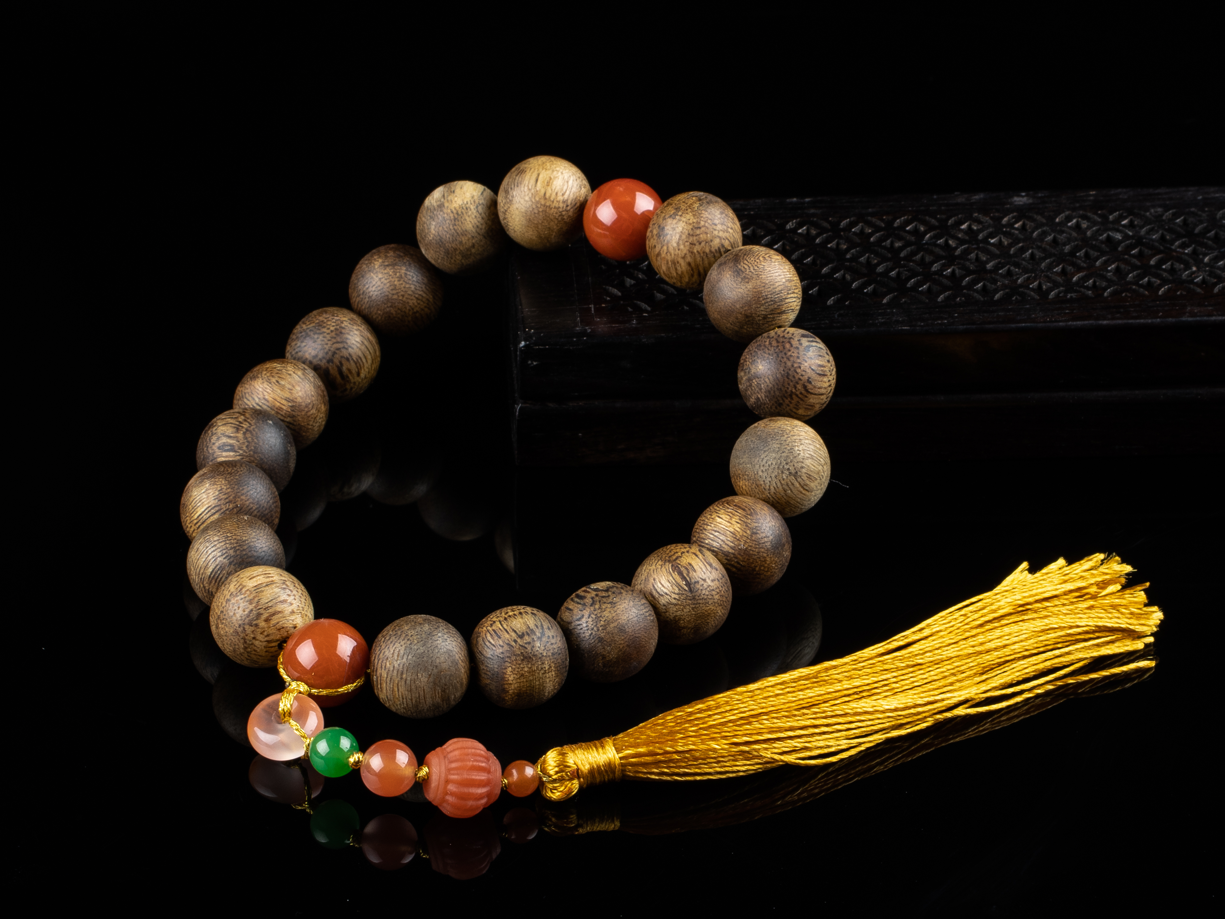 XY0151沉香+南红流苏款手串手持,天然沉香圆珠12mm,原色原味,香味自然清甜,满色肉南红+冰飘南红,一颗满碧绿无瑕的碧玉点缀,金黄色的流苏,让整条手串富贵感十足,正能量满满,手串、手持,佩戴、把玩两用。