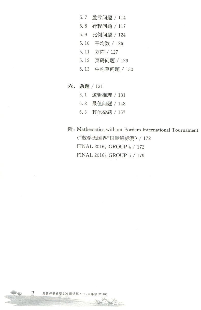 本书的解答不拘泥于竞赛的参考答案,提倡一题多解,提供详细的分析和解题过程,引导读者从多个角度思考问题。 另外,越来越多的中国学生会参加国外的数学竞赛活动,我们特附上Mathematics without Borders International Tournament(“数学无国界”国际锦标赛)的英文试题和解答,以飨读者。