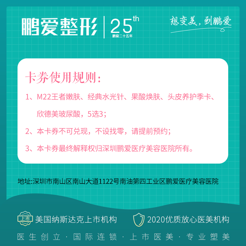 5、深圳鹏爱旗舰总院是美国纳斯达克上市医美医院,安心塑美25年,医生创立,国际连锁,值得信赖!