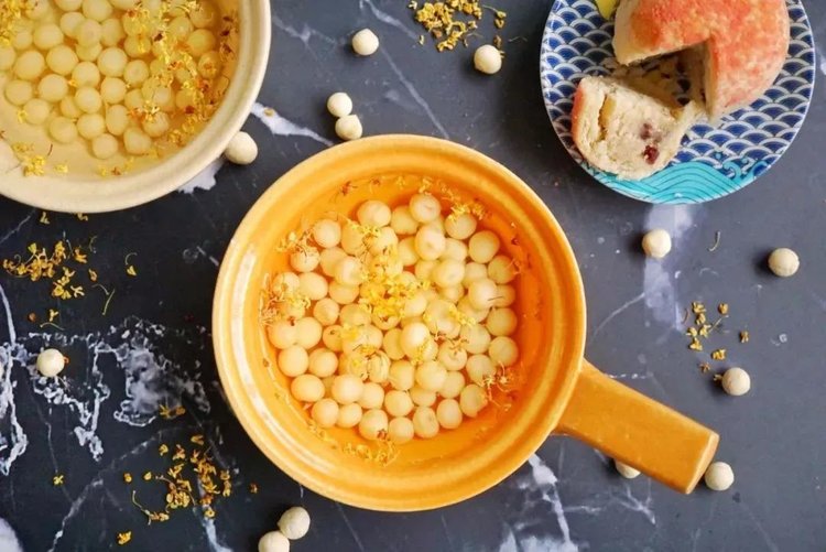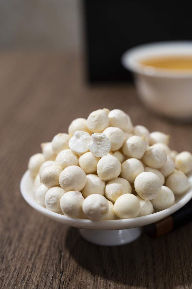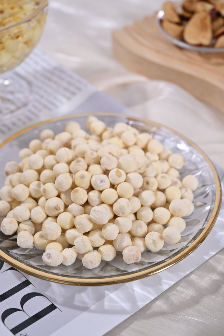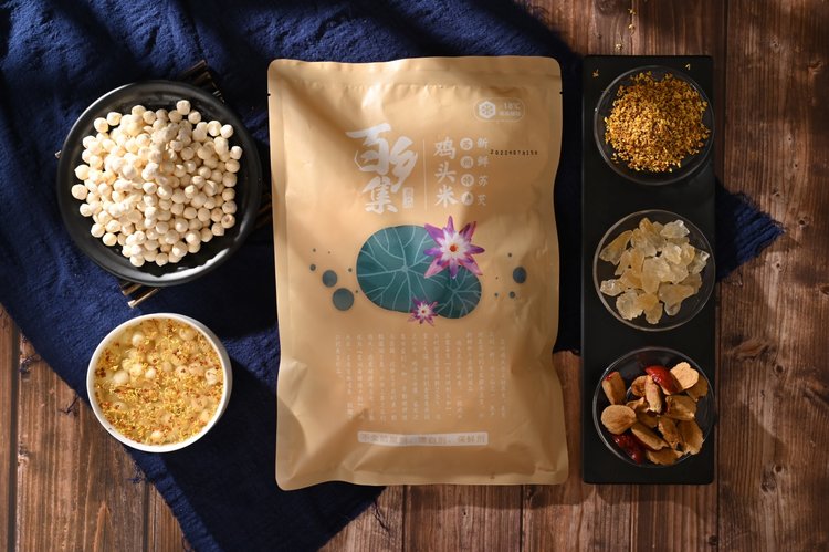 凌晨采摘,早上就开始剥苞头,每一颗鸡头米都是这样精心筛选出来的。剥开鸡头米是嫩黄色,头部色浅,然后解冻后鸡头米表面微微破裂,米壁会皱起,煮熟后颗粒会饱满