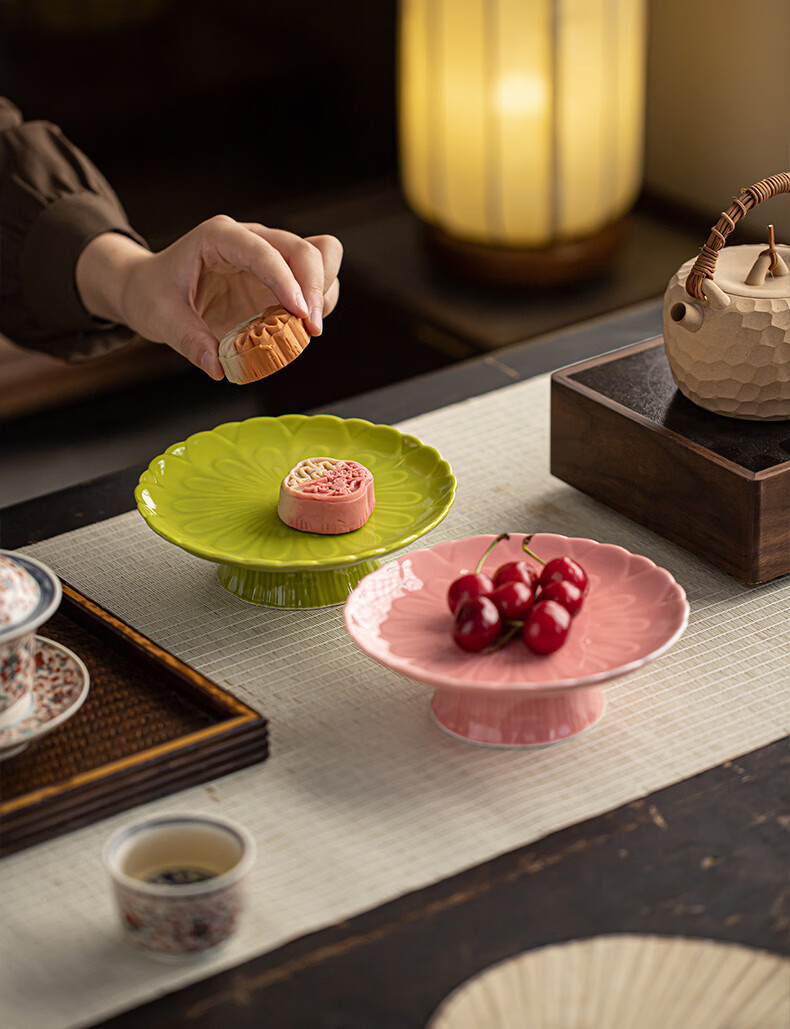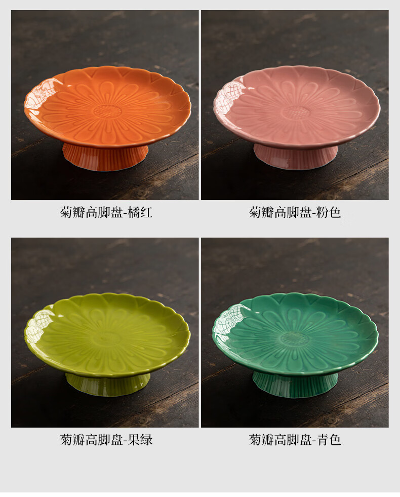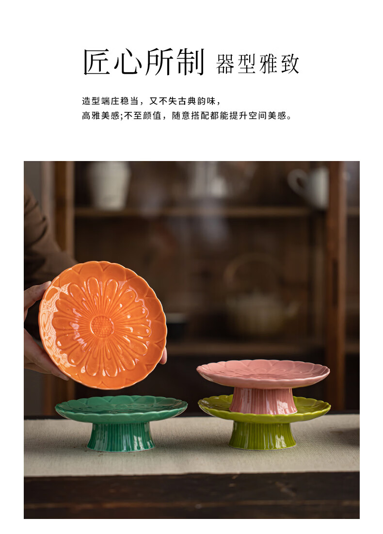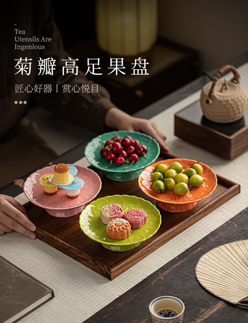 【菊瓣高脚盘】中式复古陶瓷茶点盘高脚水果盘创意零食糕点盘家用茶几干果盘摆台