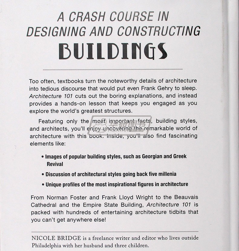 A crash course in designing and constructing buildingsToo often, textbooks turn the noteworthy details of architecture into tedious discourse that would put even Frank Gehry to sleep. "Architecture 101" cuts out the boring explanations, and instead provides a hands-on lesson that keeps you engaged as you explore the world's greatest structures.Featuring only the most important facts, building styles, and architects, you'll enjoy uncovering the remarkable world of architecture with this book. Inside, you'll also find fascinating elements like: Illustrations of popular building styles, such as Georgian and Greek RevivalDrawings of the essential parts of different buildingsUnique profiles of the most inspirational figures in architectureFrom Norman Foster and Frank Lloyd Wright to the Beauvais Cathedral and the Empire State Building, "Architecture 101" is packed with hundreds of entertaining architecture tidbits that you can't get anywhere else!