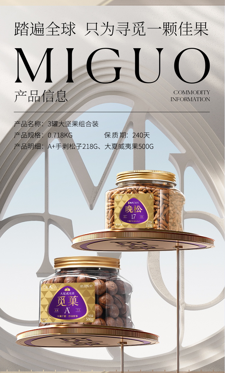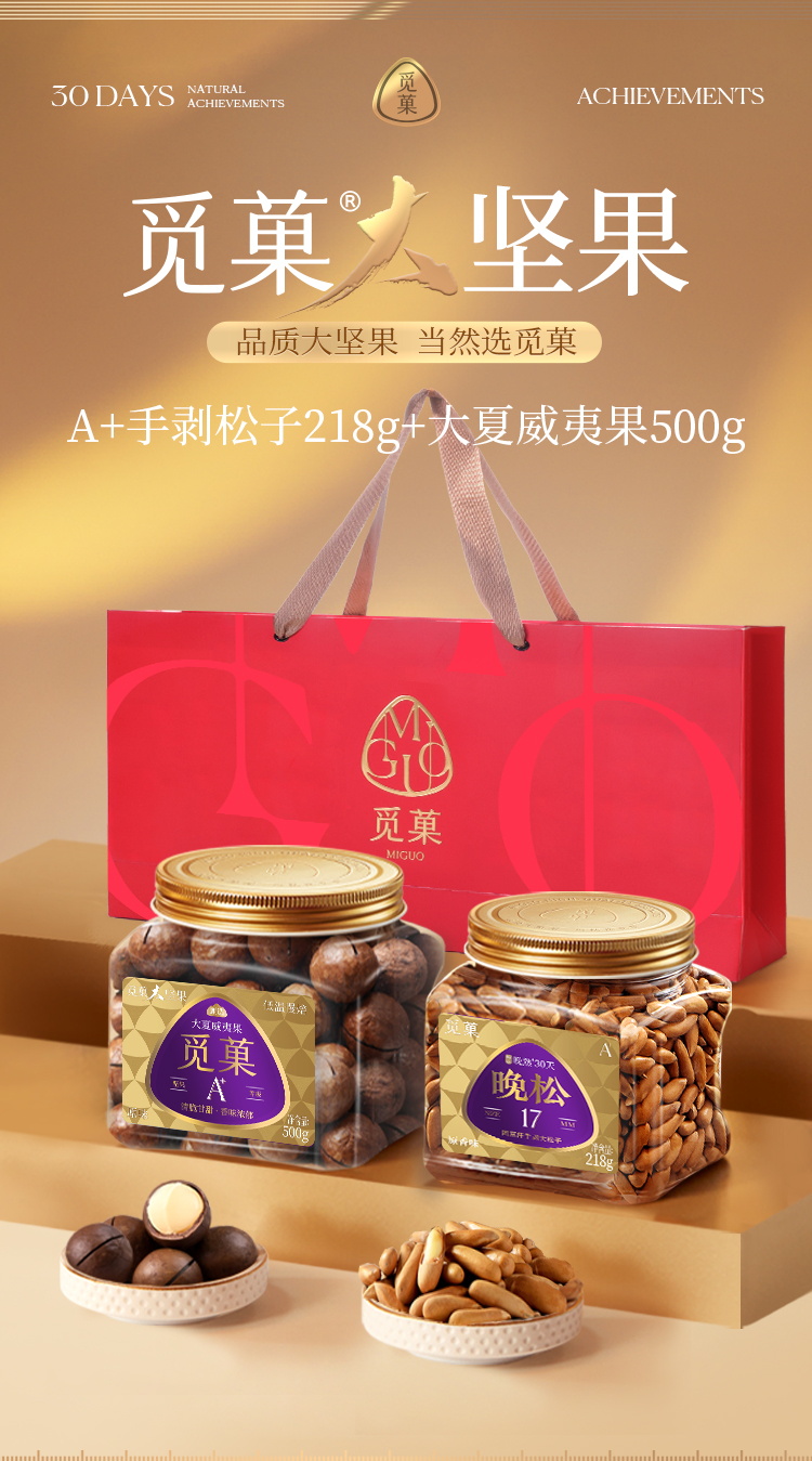 【旗舰爆品】觅菓A+级晚松阿富汗大手剥松子218g*1罐+觅菓大夏威夷果500g*1罐+礼遇礼袋*1