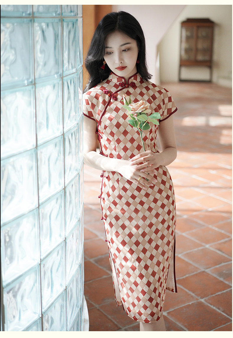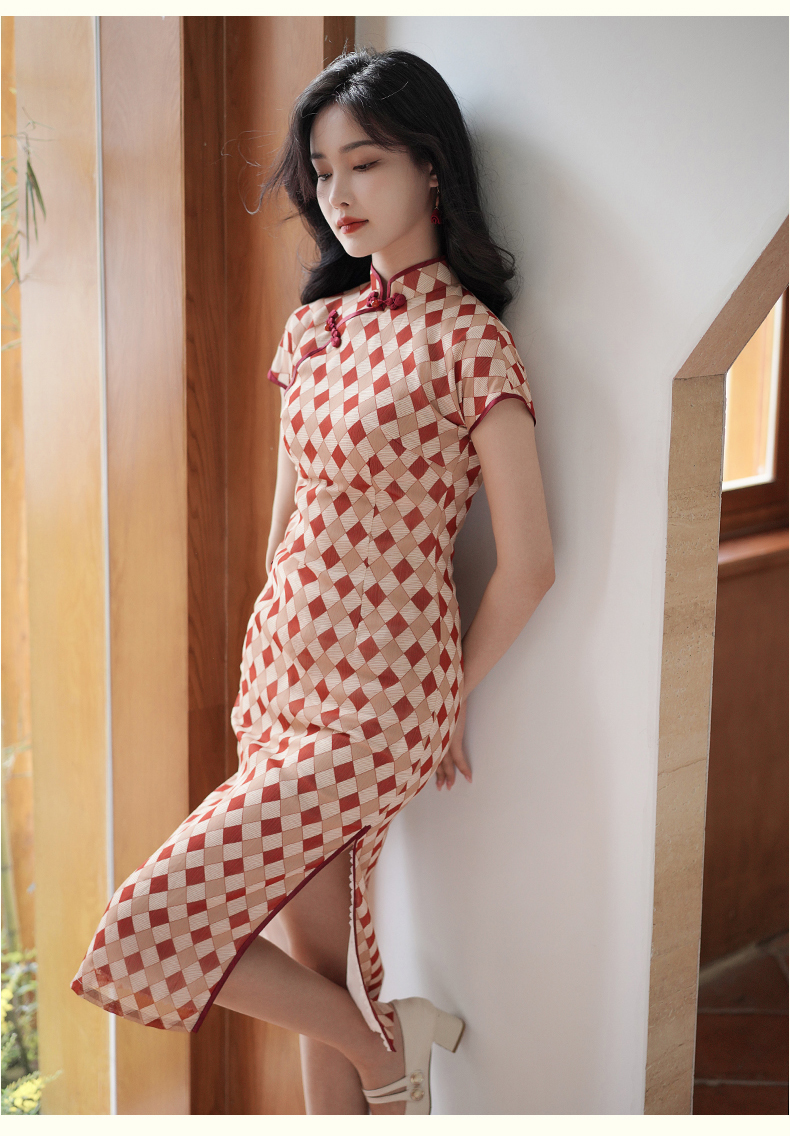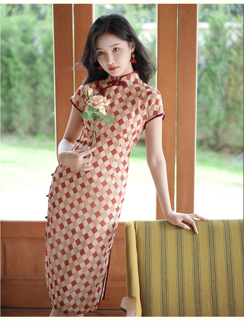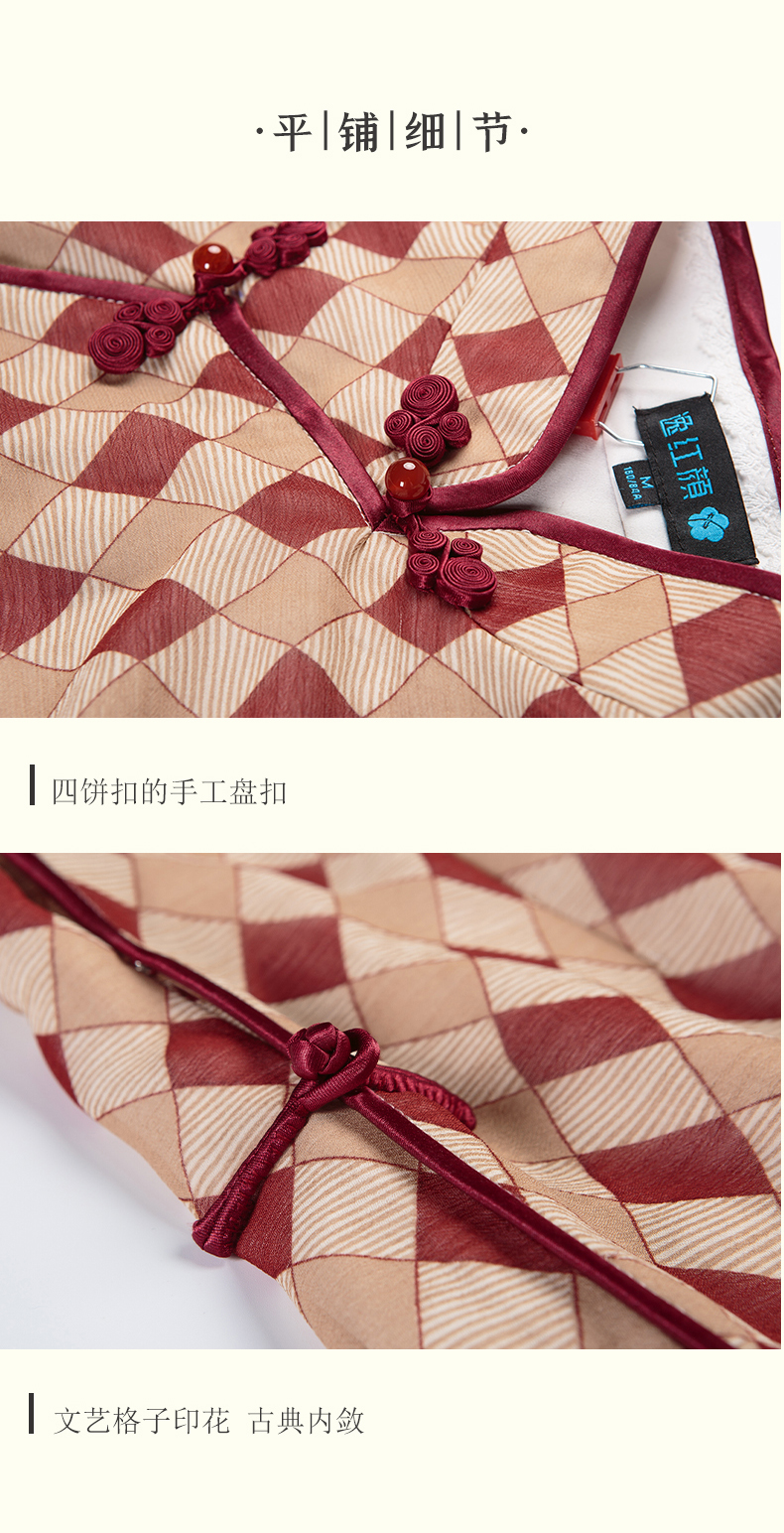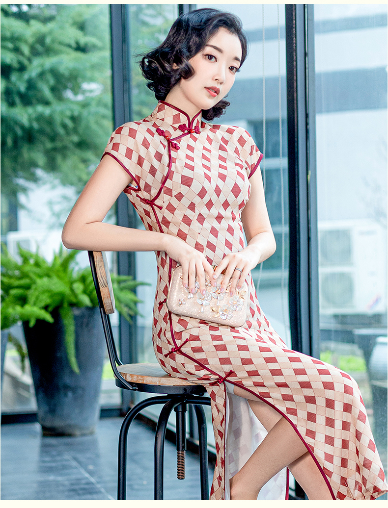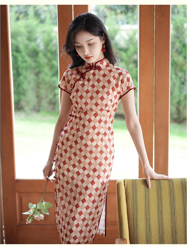 半透雪纺文艺格子印花旗袍