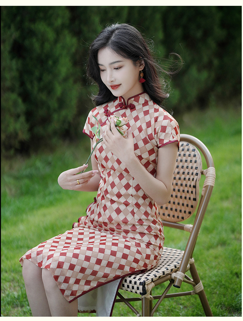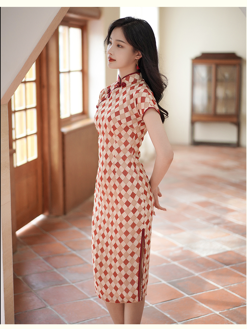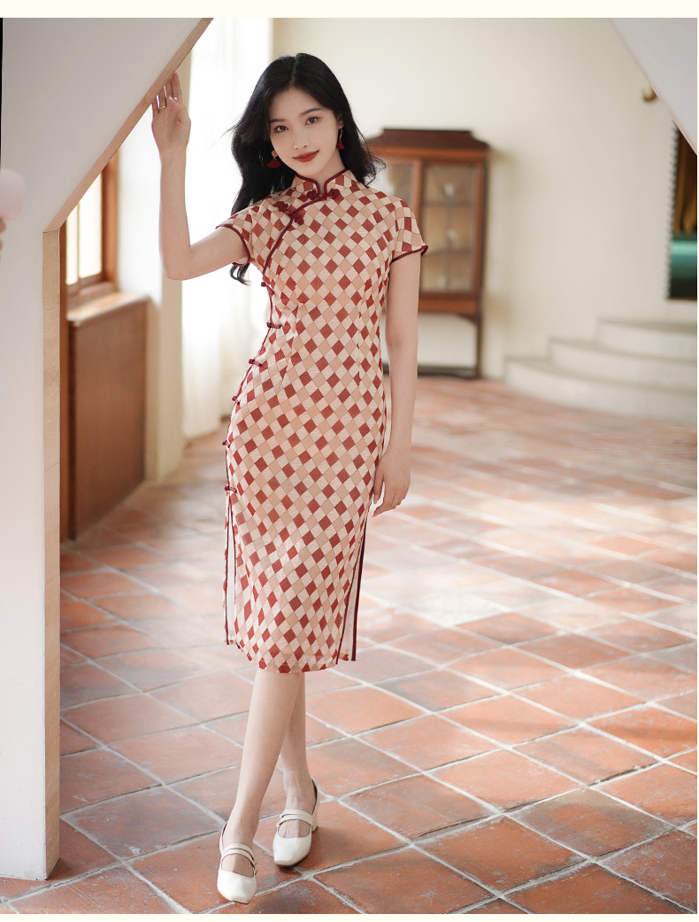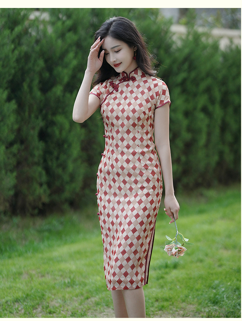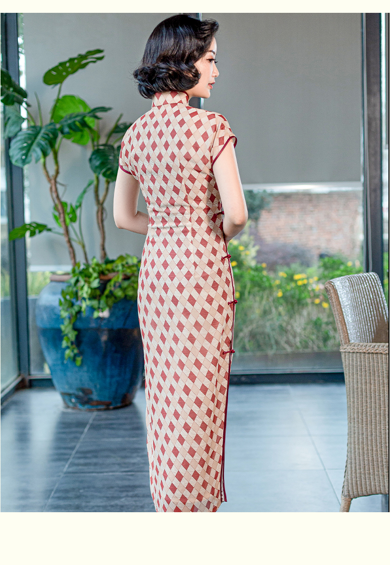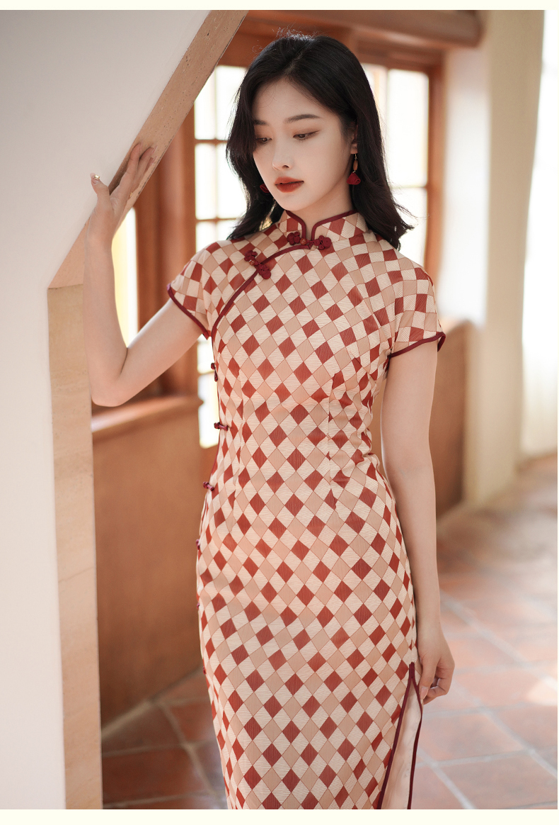 半透雪纺文艺格子印花旗袍