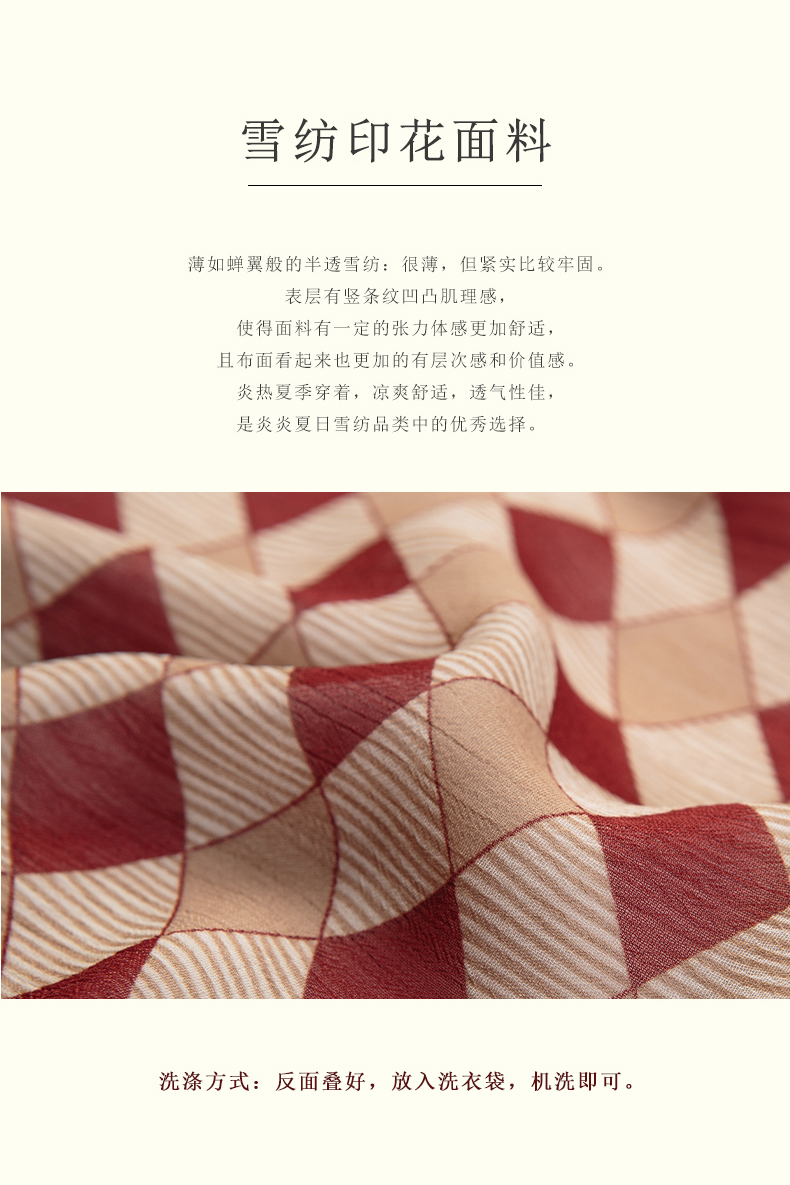 面料选自半透雪纺,很薄,但紧实比较牢固。表层有竖条纹凹凸肌理感,使得面料有一定的张力体感更加舒适,且布面看起来也更加的有层次感和价值感。炎热夏季穿着,凉爽舒适,透气性佳,是炎炎夏日雪纺品类中的最佳选择。