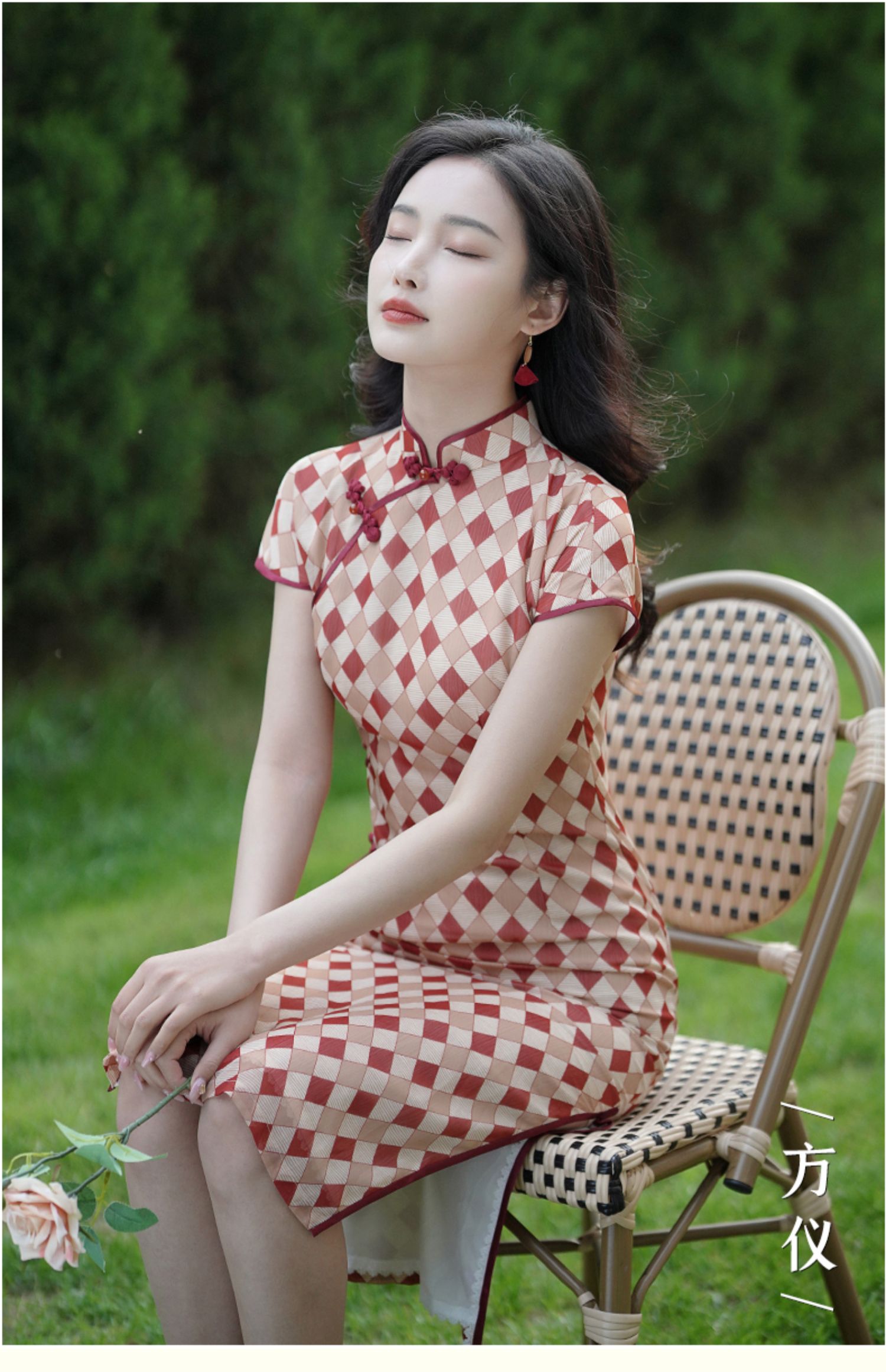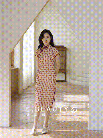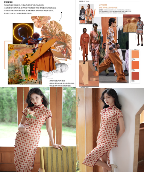 这款旗袍灵感来自于民国时期的月份牌结合民国时期爆款 元素几何元素,采用红色、元气杏橙色相间的菱形几何图案印花,浪漫优雅又高级。