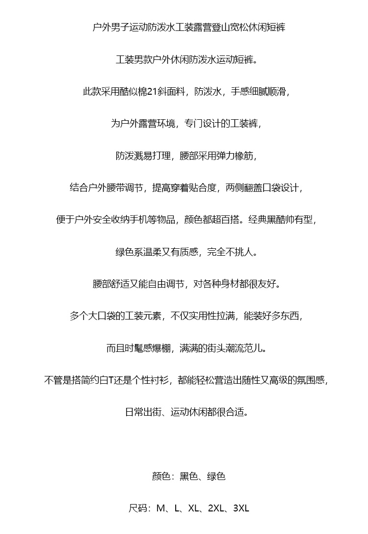 【9hd1】户外男子运动防泼水工装宽松短裤!!