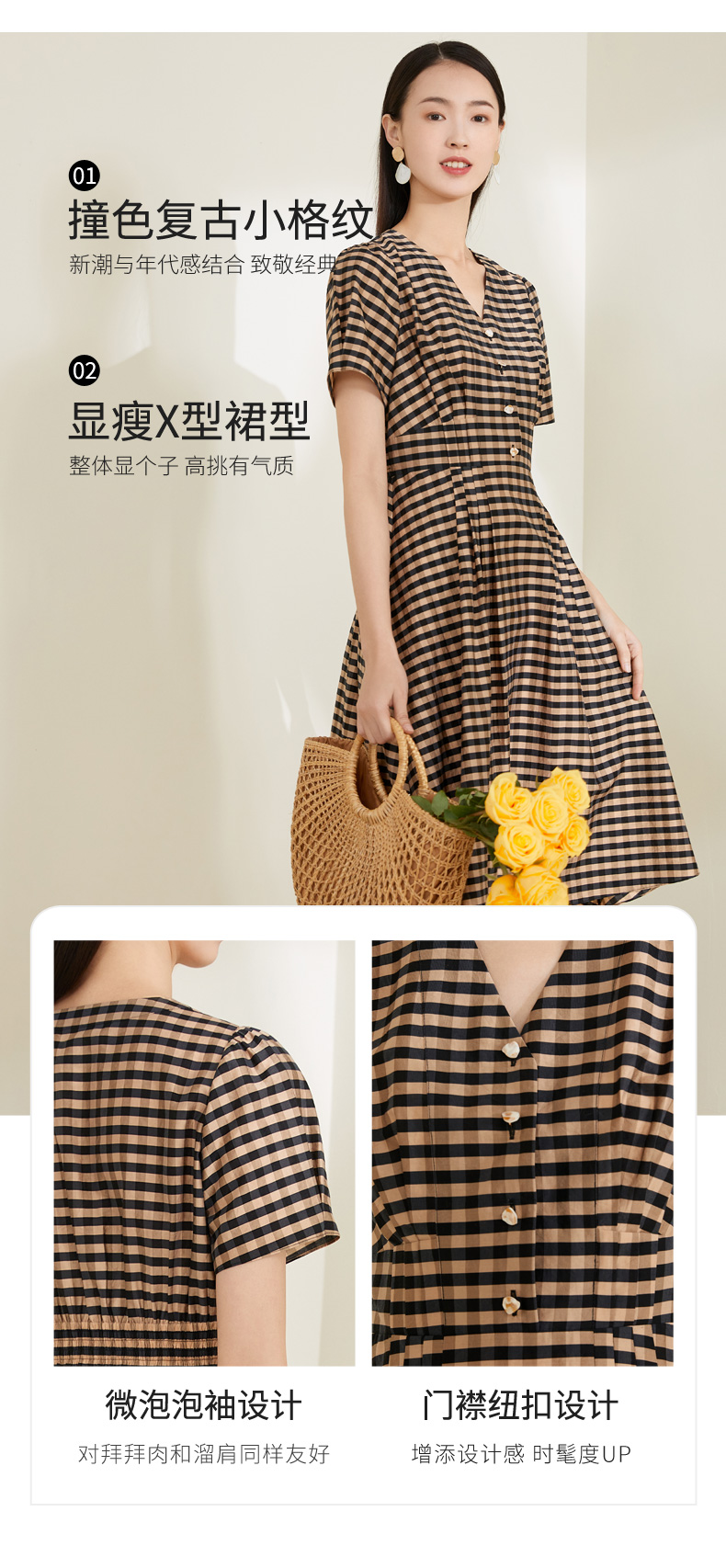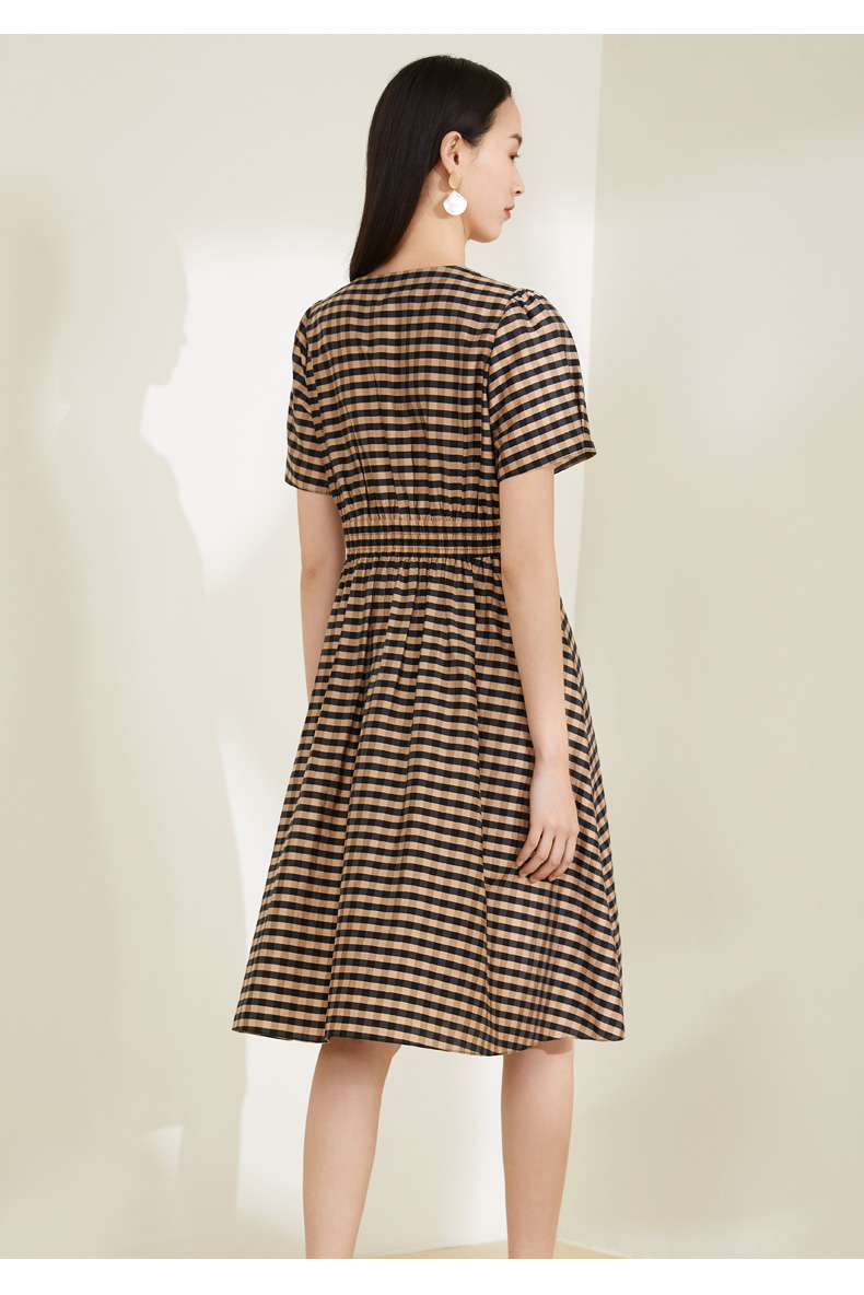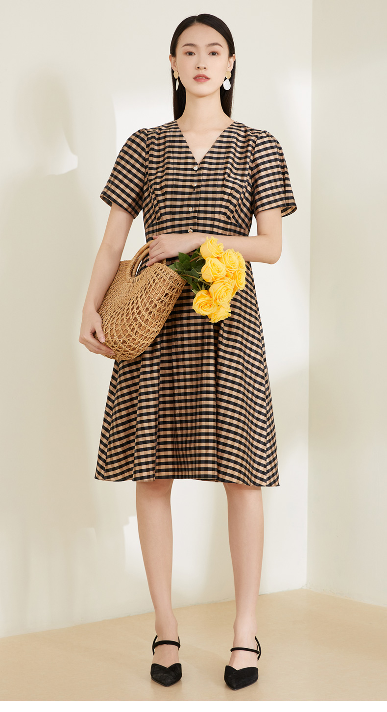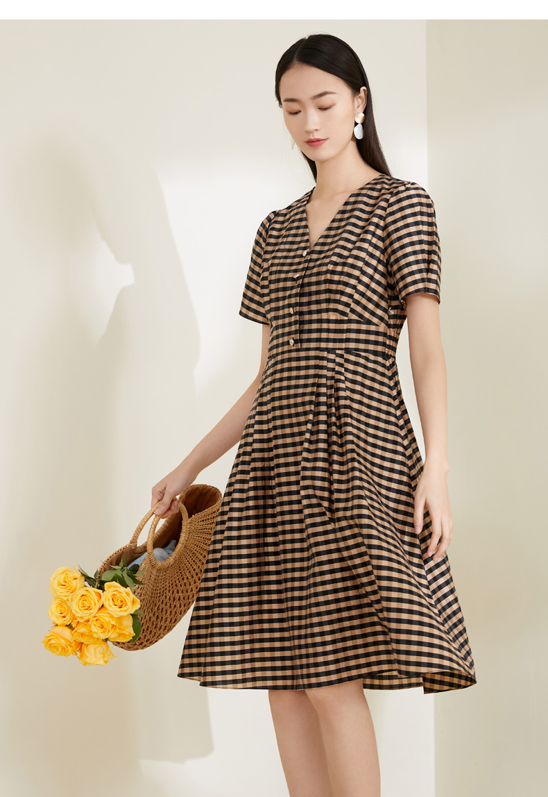 玳莎格子V领连衣裙女 复古设计感小众通勤中长款裙子 CA35102