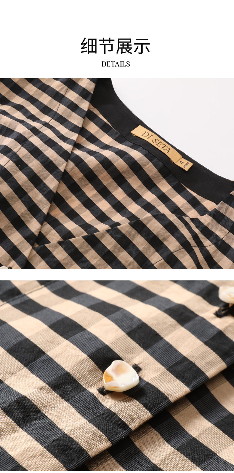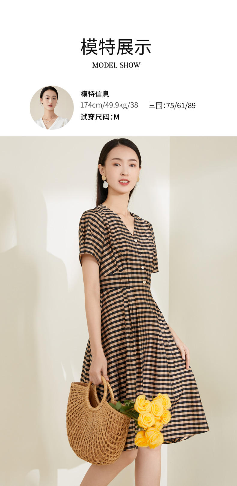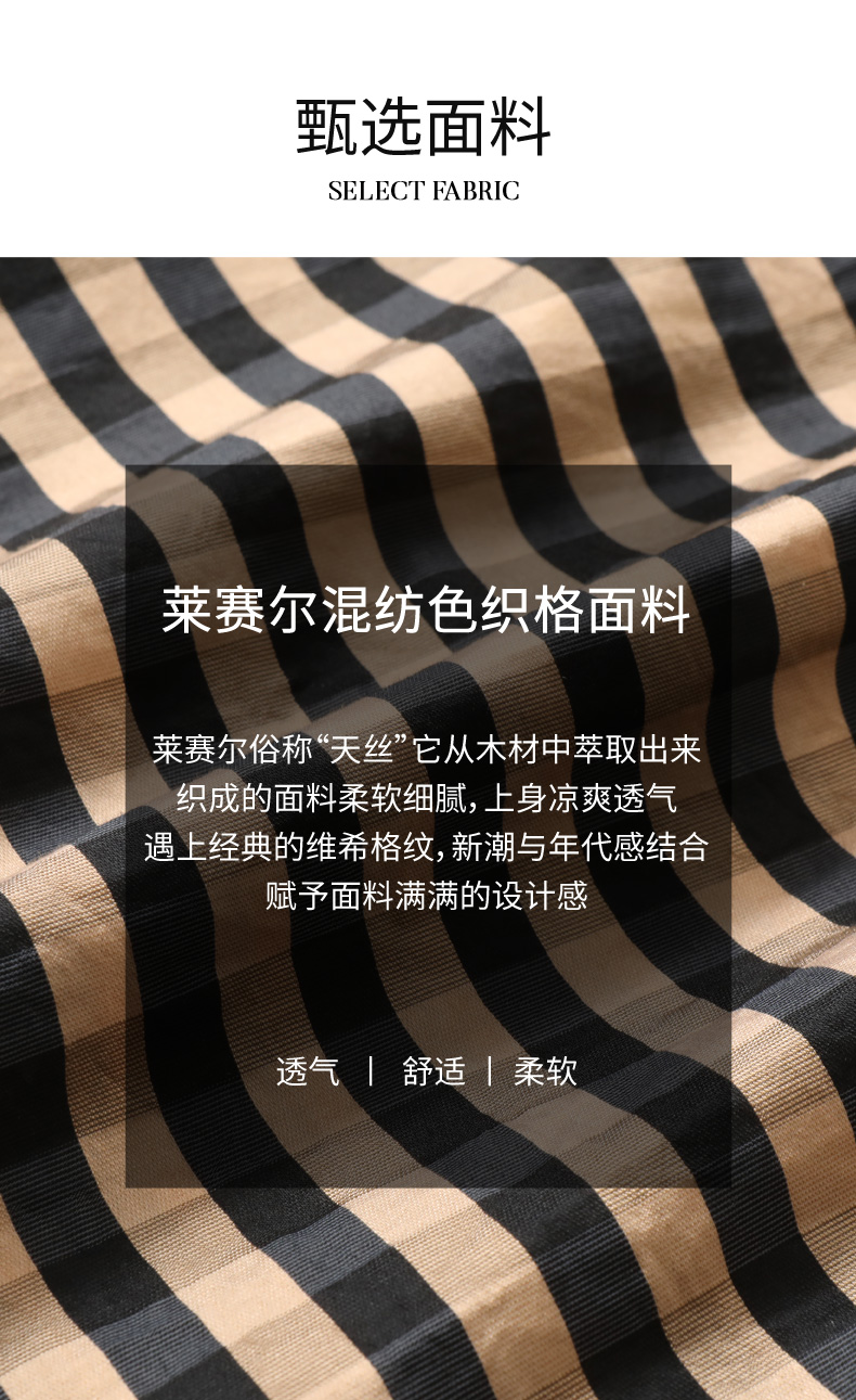 玳莎格子V领连衣裙女 复古设计感小众通勤中长款裙子 CA35102