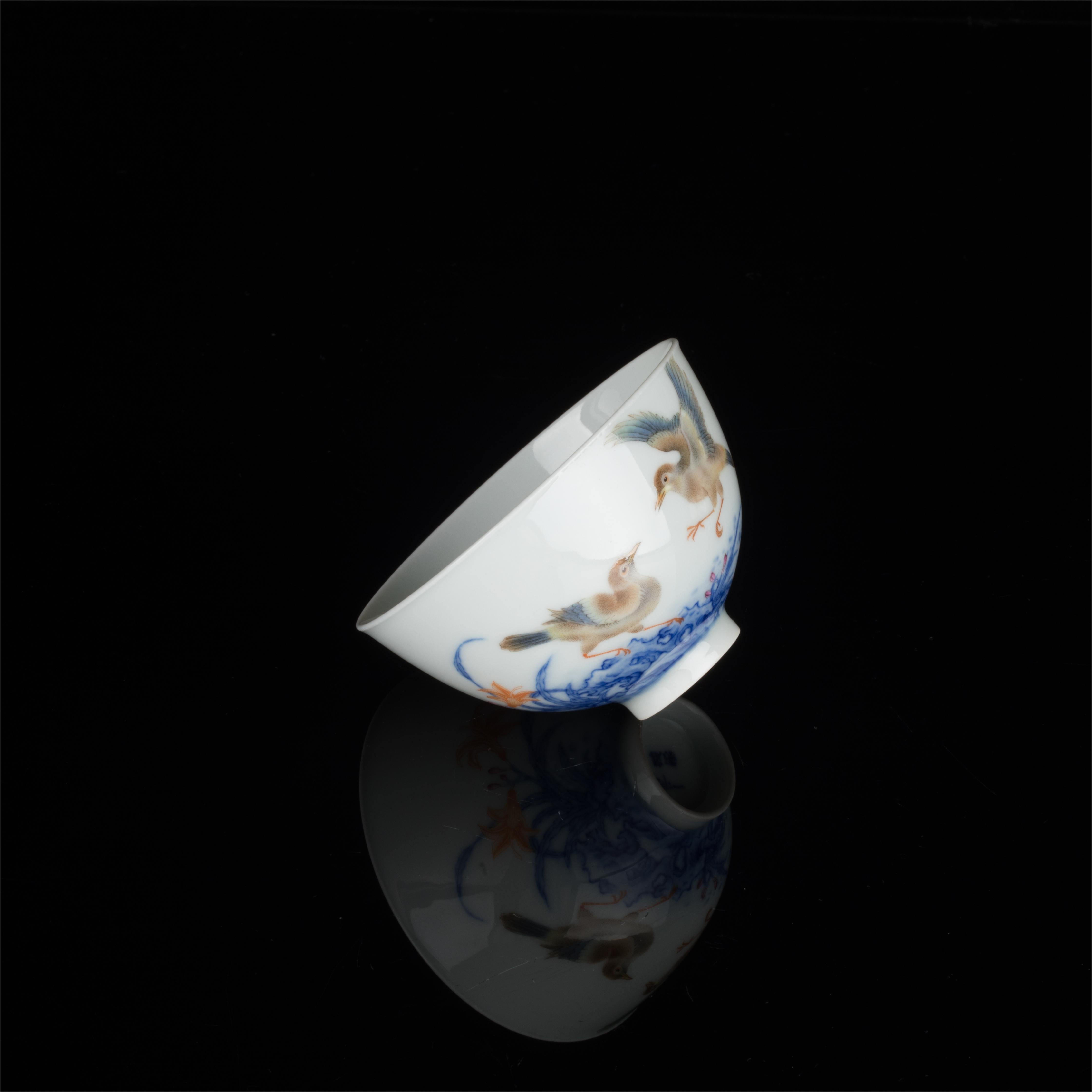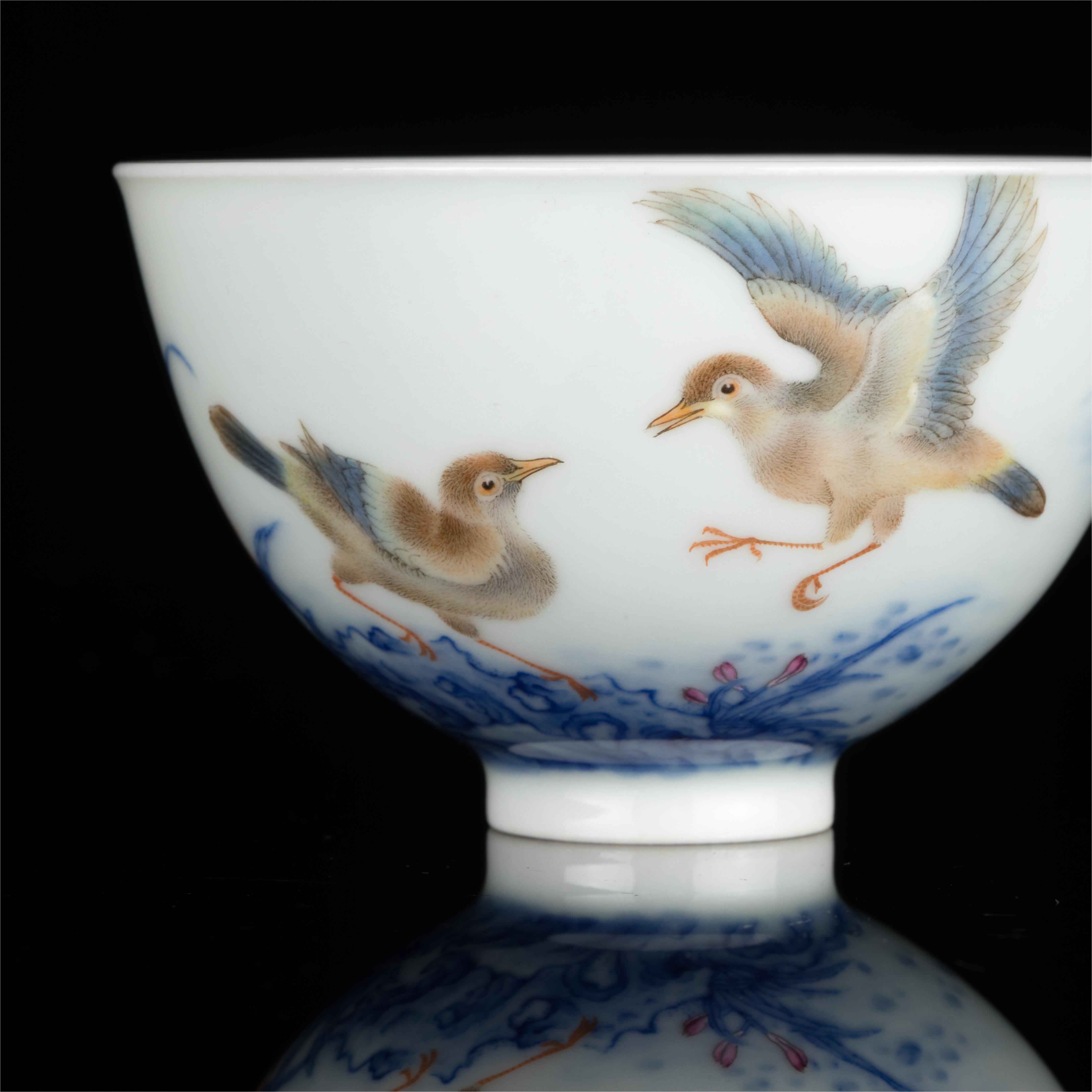 一儒堂青花加彩萱草雎鸠鸟鸡心杯
