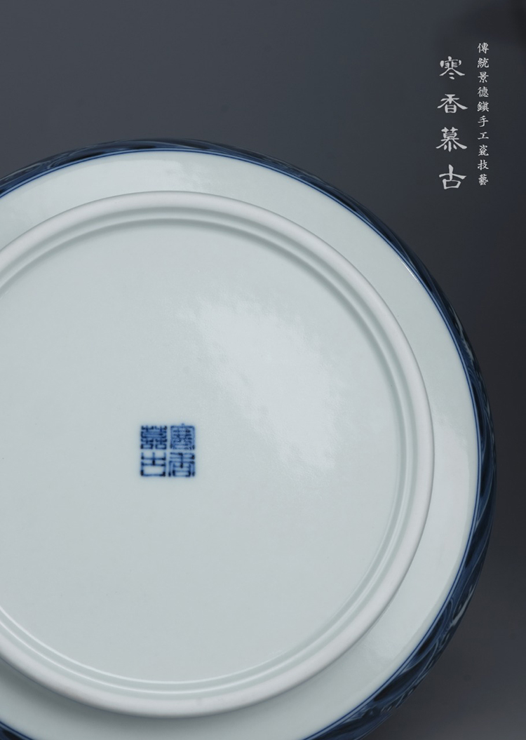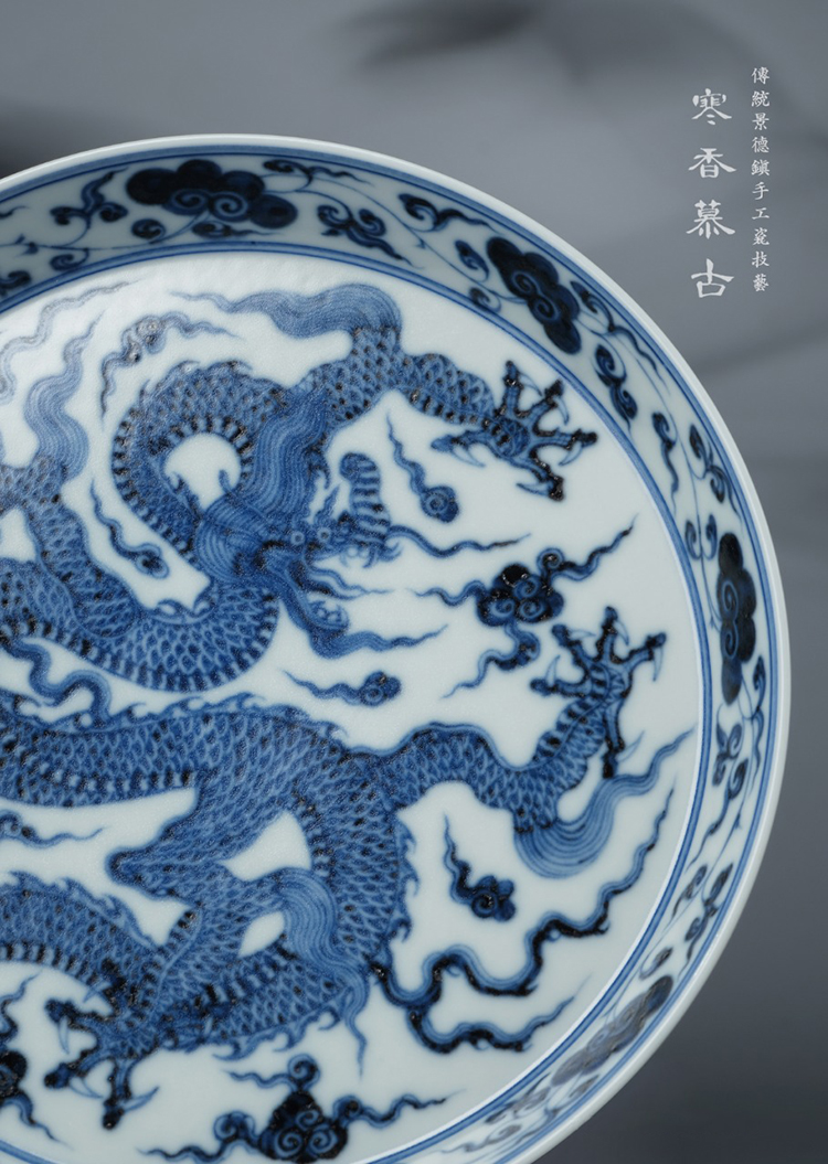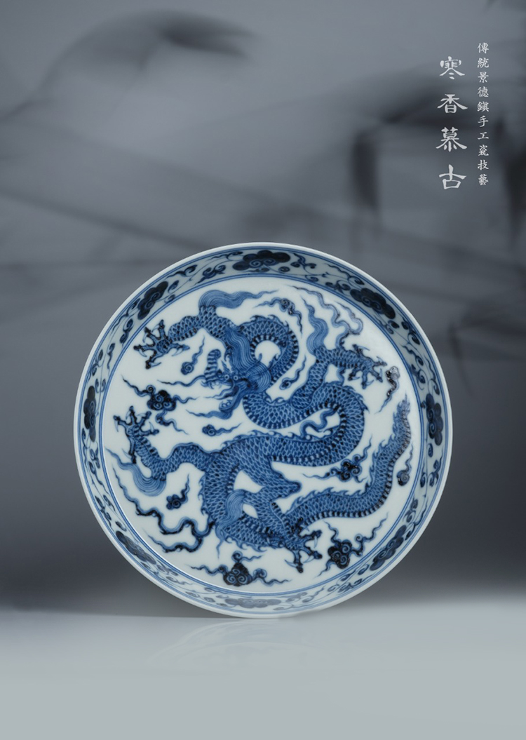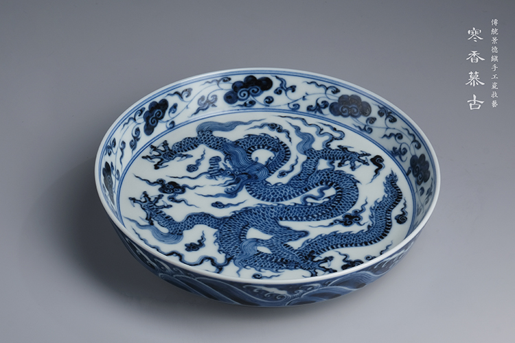 寒香慕古元明青花糯米釉缠枝灵芝云龙纹盘