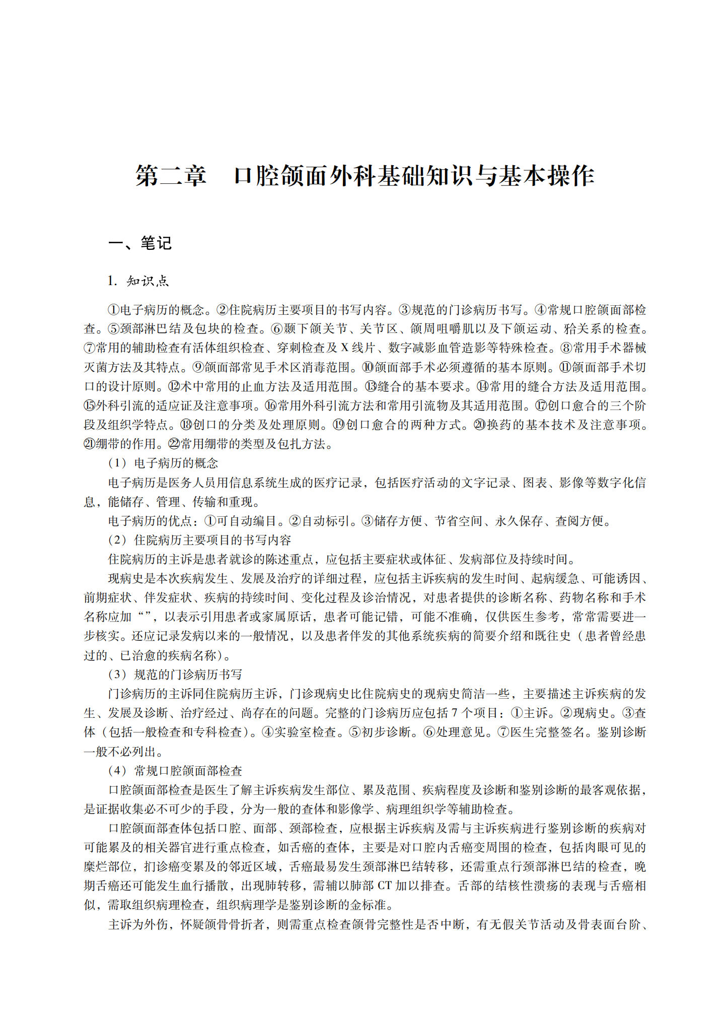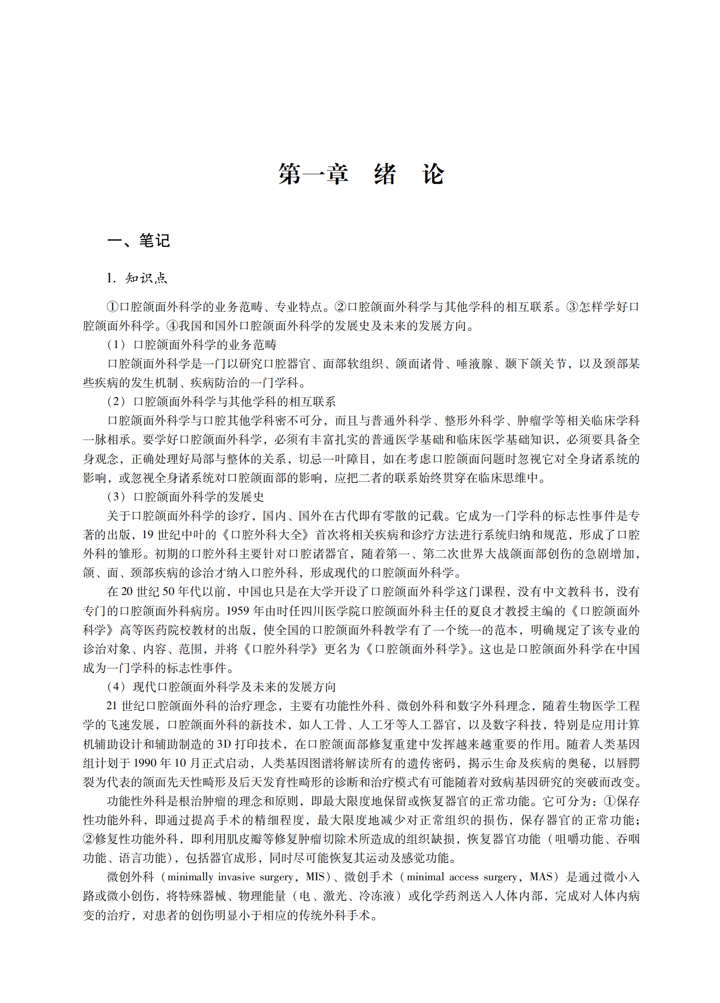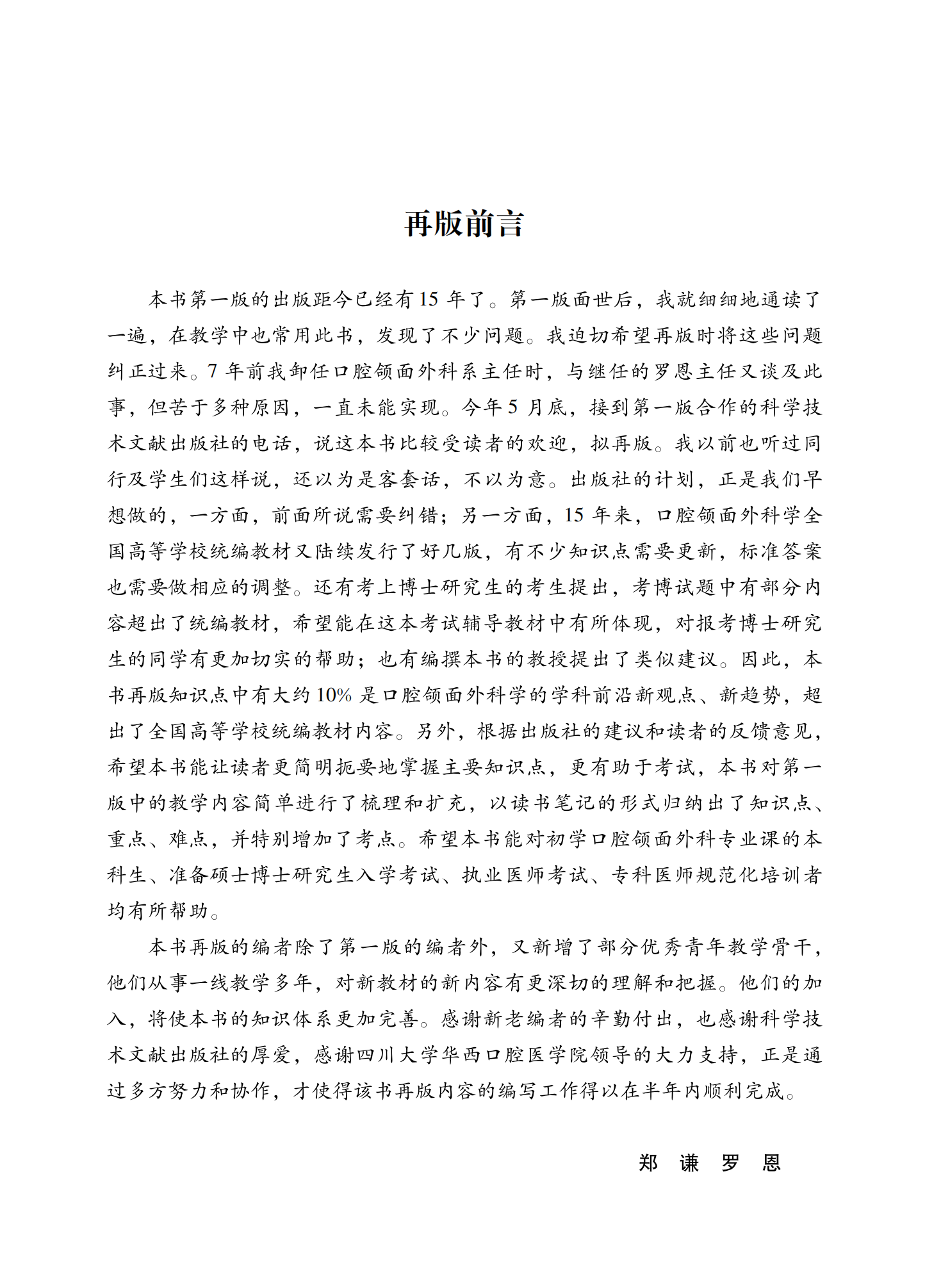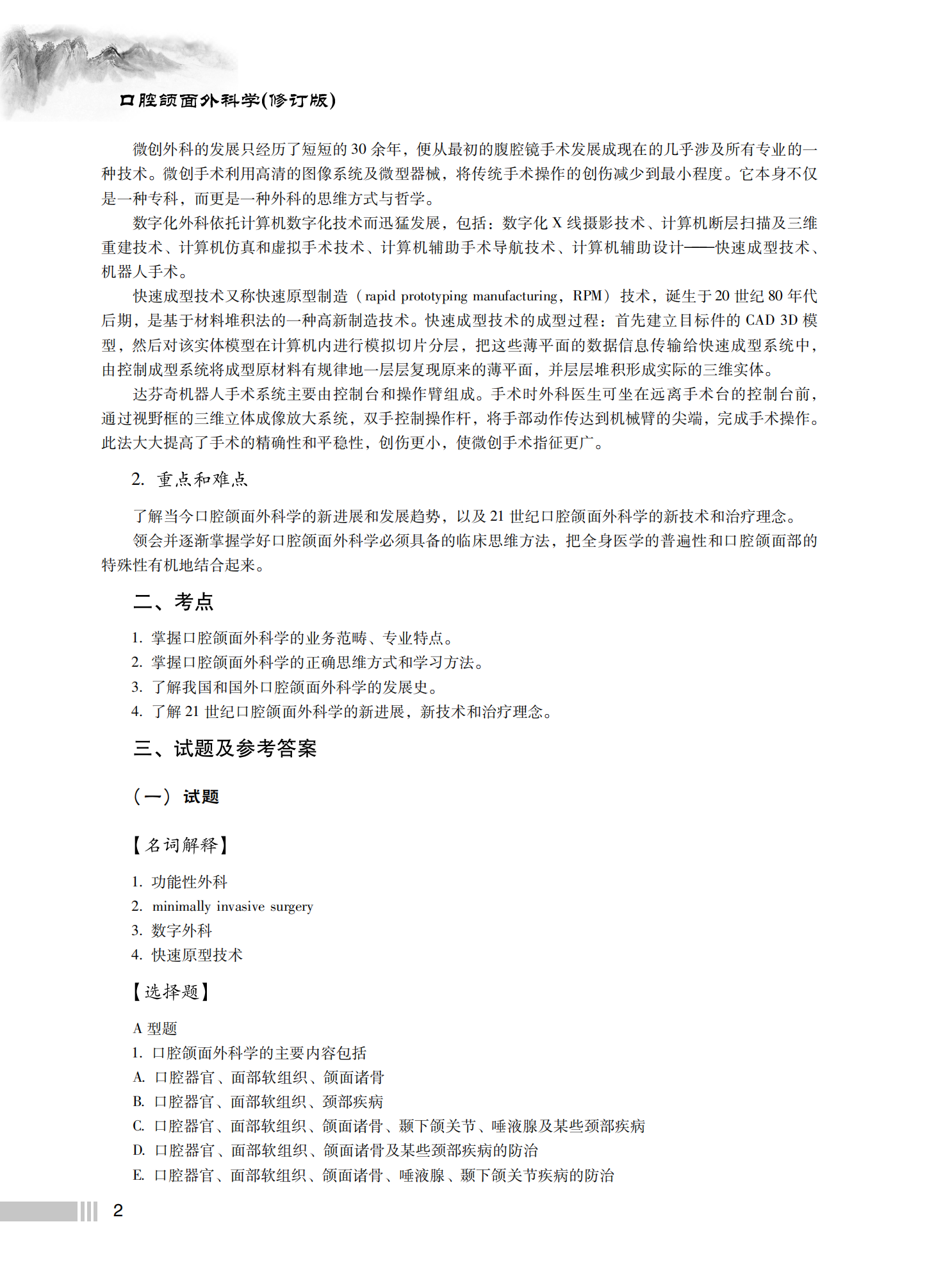 口腔颌面外科是一门专业强、技术发展迅速的医学学科,口腔颌面外科的教学培养也得到了越来越高的重视。本书第一版在教学培养中起到了重要作用,为了弥补第一版书的不足之处,以及增添近年来更新的知识点,编者们撰写了本书。本书将教学内容归纳成了知识点、重点、难点,其知识点中有大约10%是口腔颌面外科学的学科前沿新观点、新趋势,且本书特别增加了考点。本书稿大量运用知识框架图和表格描述重点内容,列举了大量考硕考博的试题,并对难题进行了解析。本书稿语言简练,条理清晰,图文并茂,易于理解。本书对初学口腔颌面外科专业课的本科生、准备硕士博士研究生入学考试以及执业医师考试、专科医师规范化培训者均有所帮助。