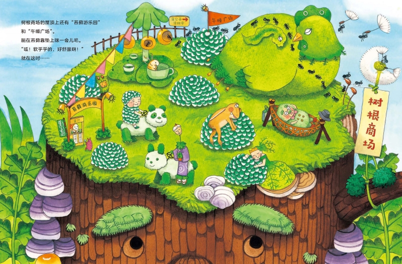 画面中藏着许多隐藏苔藓角色,对照前后勒口的角色图鉴寻找他们的踪迹,比拼眼力,还能认识各种苔藓。