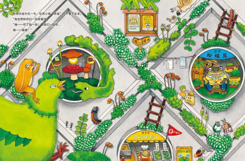 不同种类的苔藓,在书中化身性格各异的苔藓小镇居民,在花盆里、树根下、墙缝间,热热闹闹地生活着。用想象力搭建的苔藓小镇,却有着完整、立体的世界观。从小镇建筑到路标、店铺、游乐场,处处带有苔藓元素,衣食住行,应有尽有,仿佛真的有这样的小镇!