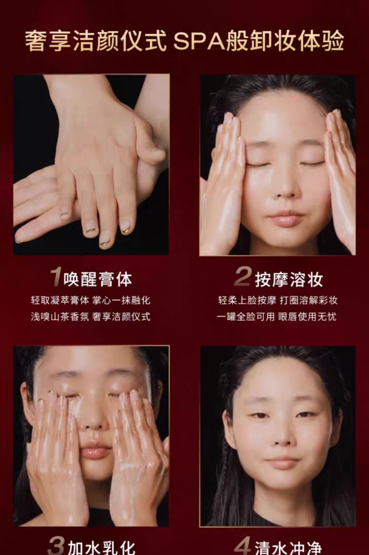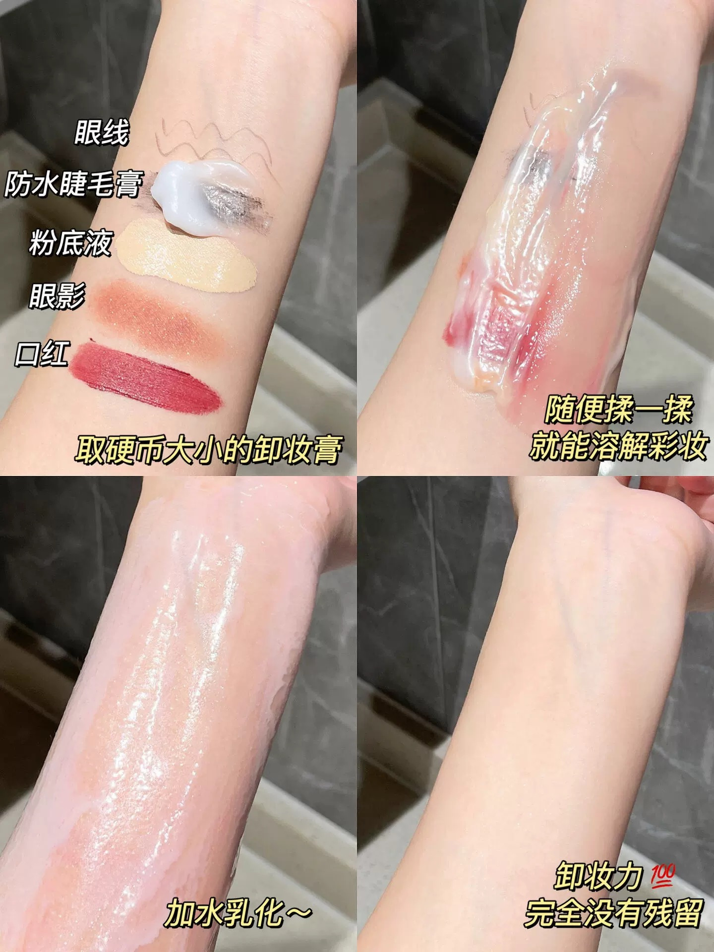 挖开抹在脸上就像冰冻的奶油一样,轻柔指腹打圈按开慢慢化成薄薄的油脂,再按两下就完全溶解成一层油了,冲洗也相当容易,不需要再加水乳化,直接一冲就化成乳状,稍微搓两下就冲掉了。