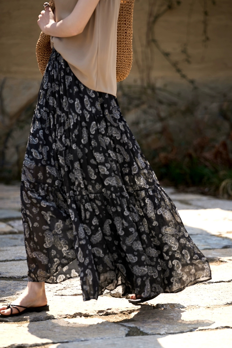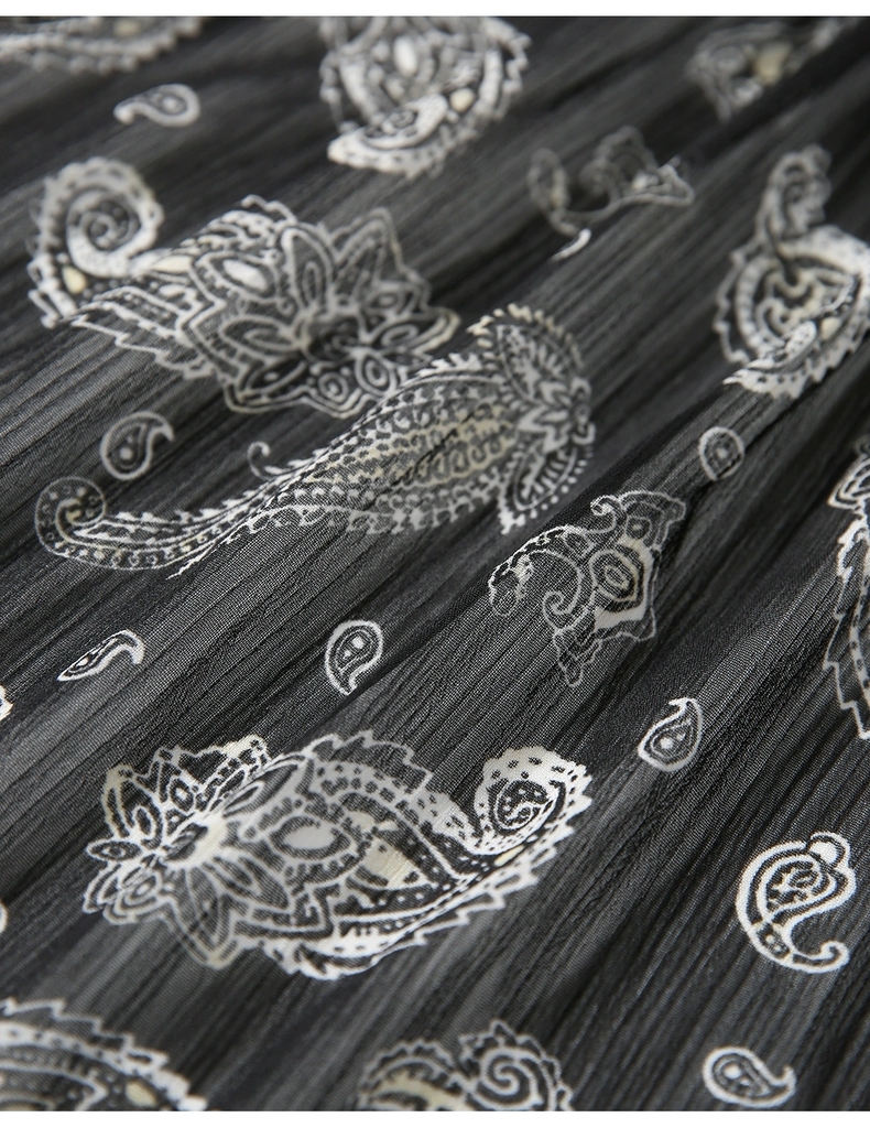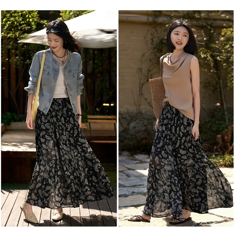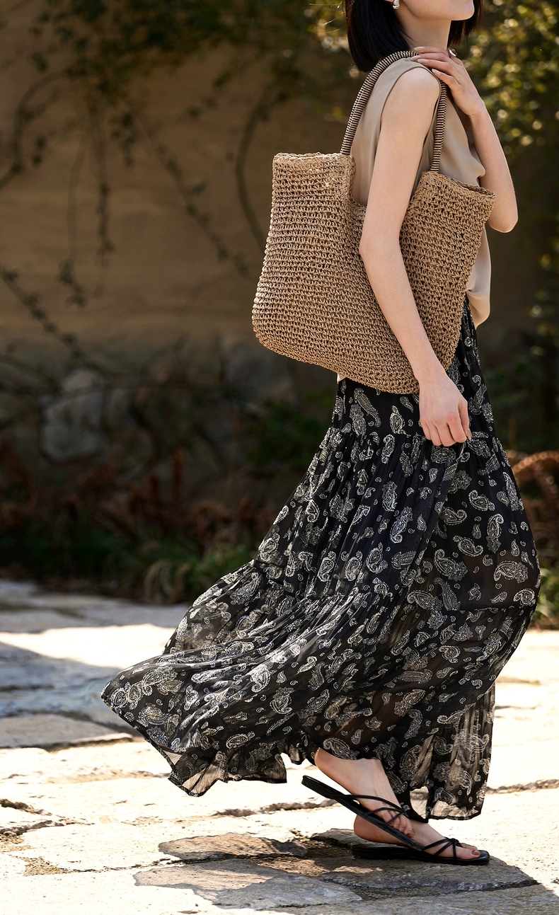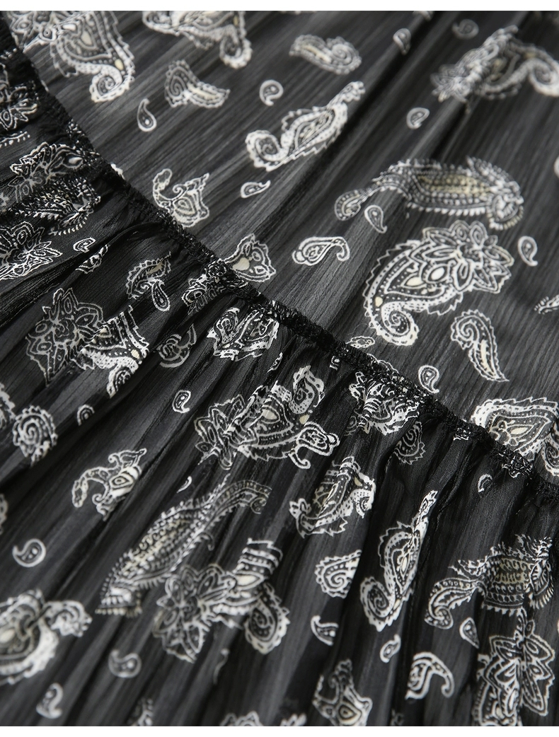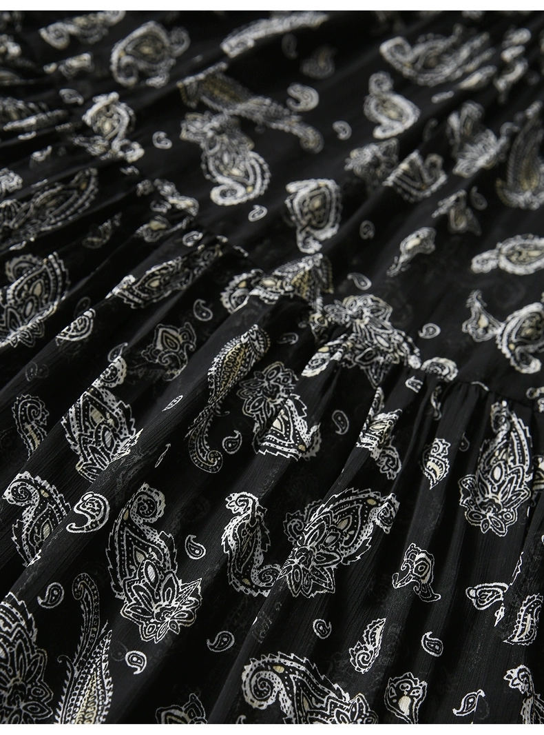 黑底白花的印花,既保留了浪漫风情,又不会像常规的碎花那样过于温柔甜腻,有点复古调性,裙身传递出的慵懒氛围,将松弛感轻松拉满。