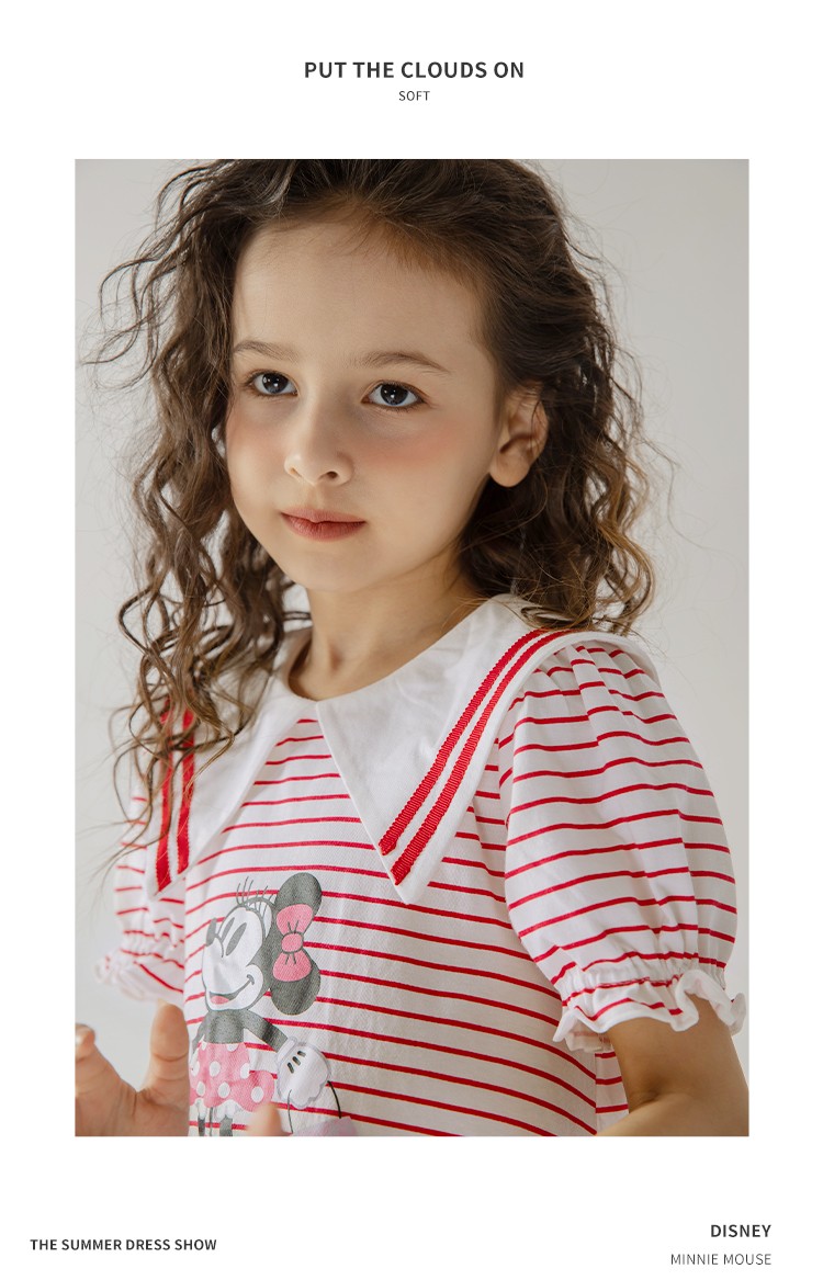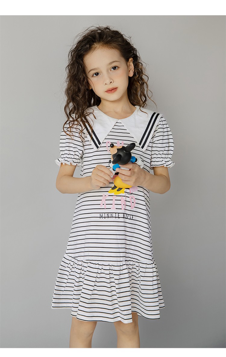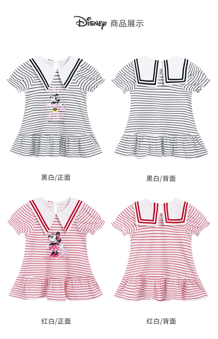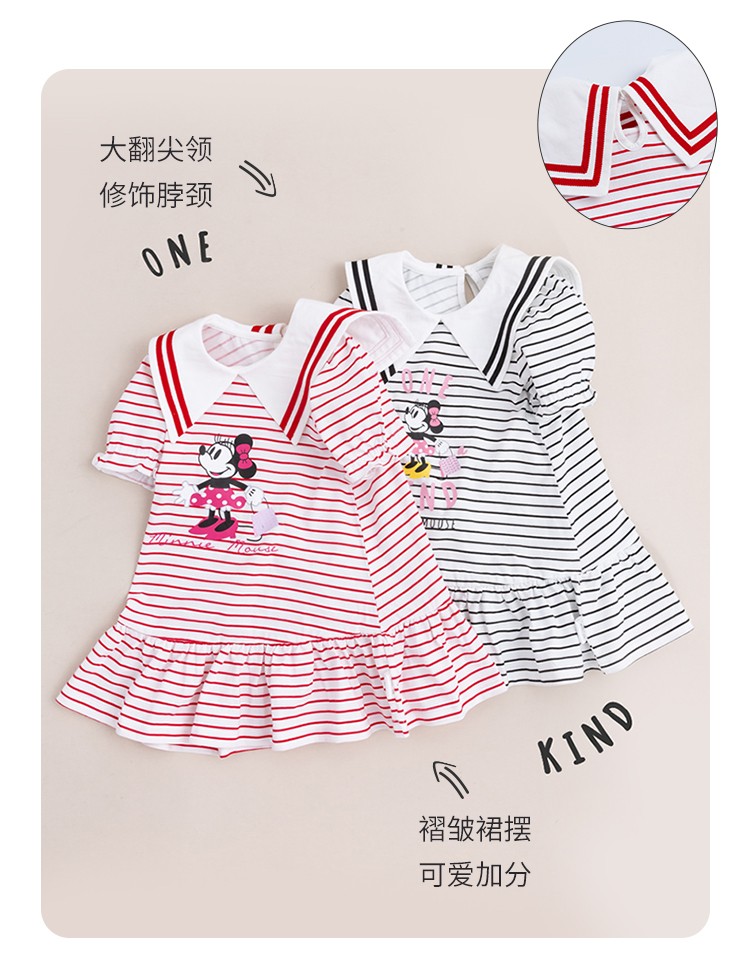 迪士尼童装儿童连衣裙甜美米妮女童条纹短袖连衣裙